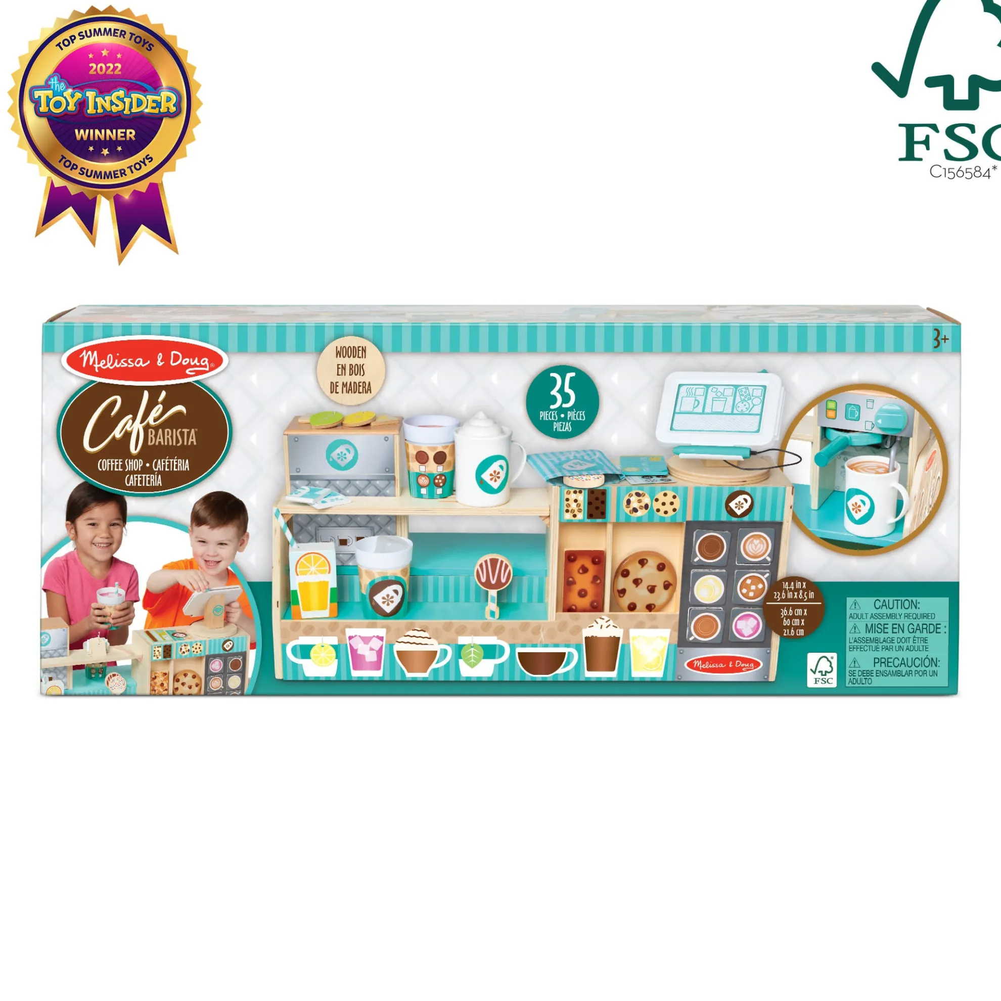 Perk up playtime with this full-service wooden coffee shop from Melissa & Doug that lets kids be the barista or the customer! Use the coffee maker with a flip filter and “steamer” and the drink dispenser with frother to prepare pretend espressos, whipped cream-topped lattes, tea, and cold drinks. Customers may choose from items listed on the magnetic menu board, including wooden double-sided cake pops, cookies, and granola bars. Then, slide the credit card in the card reader, and sign the magnetic pad to pay for purchases! This 35-piece play food set offers kids 3 to 7 countless opportunities to develop early learning skills and to create, imagine, and role play. This product is certified by the Forest Stewardship Council. FSC certification ensures that products come from responsibly managed forests that provide environmental, social, and economic benefits, and that forests are protected for future generations. Please note that FSC certification applies to new inventory only (FSC C156584)