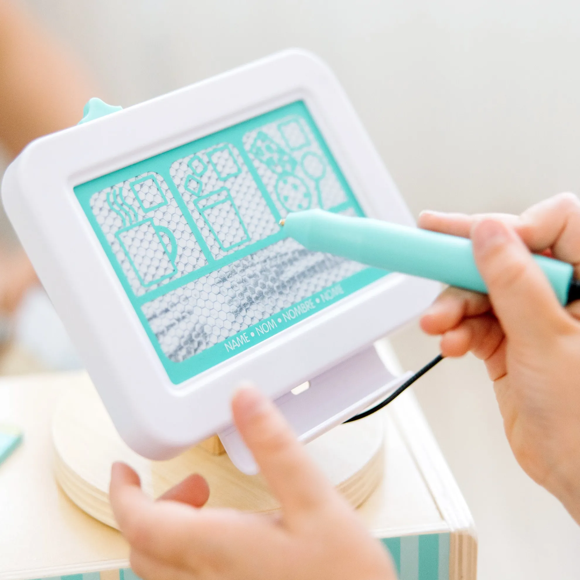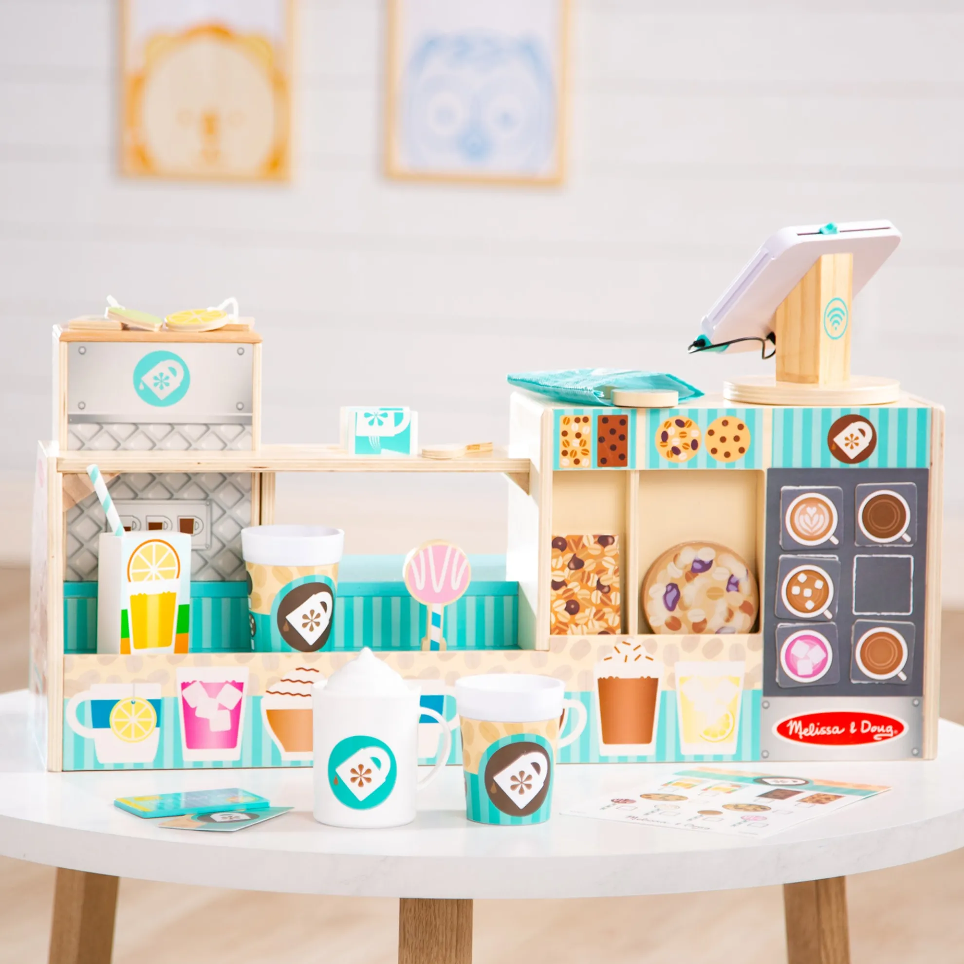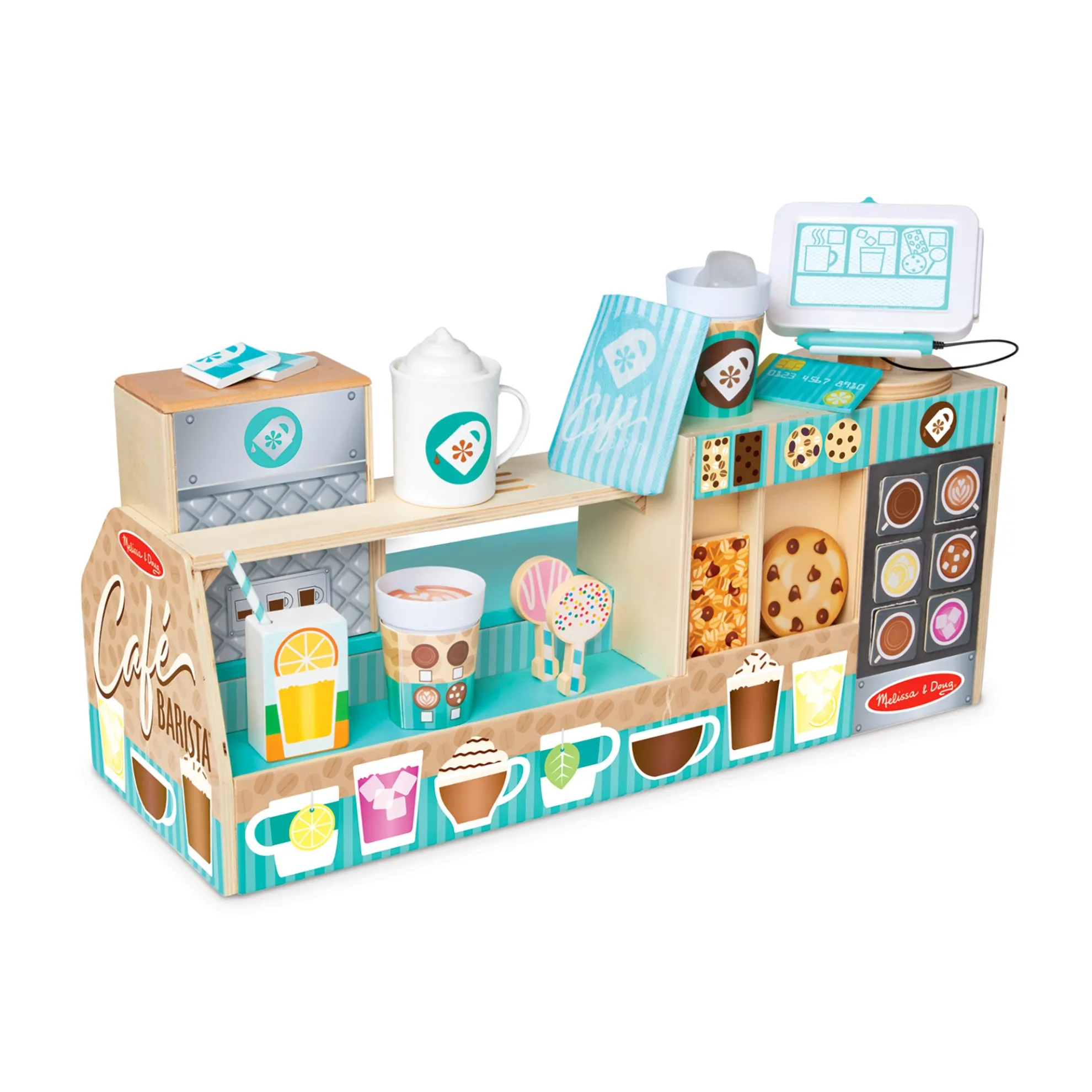 - Add to the pretend play experience with durable cup and mug, whipped cream topping, milk carton, ice tongs, 2 ice cubes, wooden spoon, wooden sign magnets, a reusable, double-sided menu, credit card, and reusable loyalty card