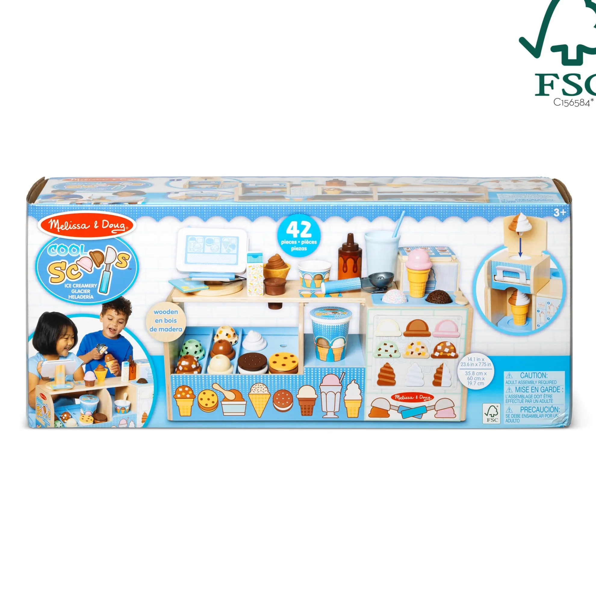 Scoop up cool pretend play creations with this full-service ice cream shop! Offer pretend play ice cream and soft serve cones, cups, milkshakes, and ice cream sandwiches. The sturdy wooden counter features an ice cream and soft serve dispenser – drop wooden scoops or durable plastic swirls (mix and match!) in the top, place a cup or wooden cone underneath, press the lever, and watch the scoops drop down. Use the scooper to lift wooden scoops and fill a soft, fabric, roll-up waffle cone. Add toppings like sprinkles and hot fudge for an extra special treat! Display ice cream choices in the front of the counter. Customers can choose from items listed on the magnetic menu board and use the credit card machine with magnetic signature pad to pay for purchases! This 42-piece play food set offers kids 3 to 7 countless opportunities to develop early learning skills and to create, imagine, and role play both the customer and the server. And, grown-ups can rest assured that when it’s time to close up shop, all the pieces store in the counter for easy cleanup! This product is certified by the Forest Stewardship Council. FSC certification ensures that products come from responsibly managed forests that provide environmental, social, and economic benefits, and that forests are protected for future generations. Please note that FSC certification applies to new inventory only (FSC C156584)