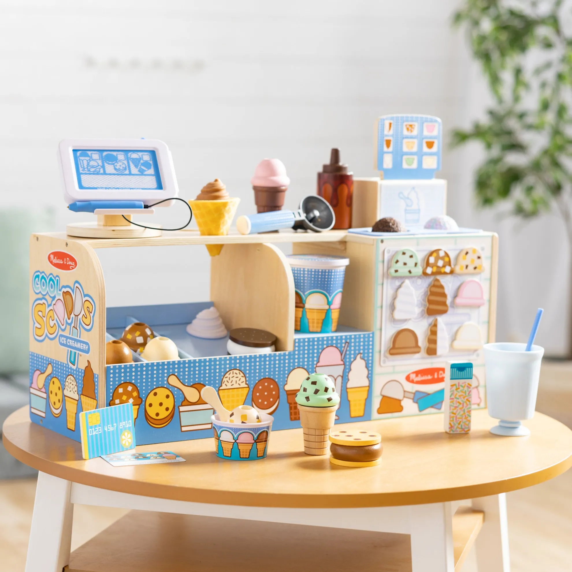 - Order, create, and serve cool pretend play frozen treats with this sturdy wooden ice cream shop counter featuring a soft serve dispenser, magnetic write-on ordering and payment tablet, magnetic menu board, display area, and lots of storage