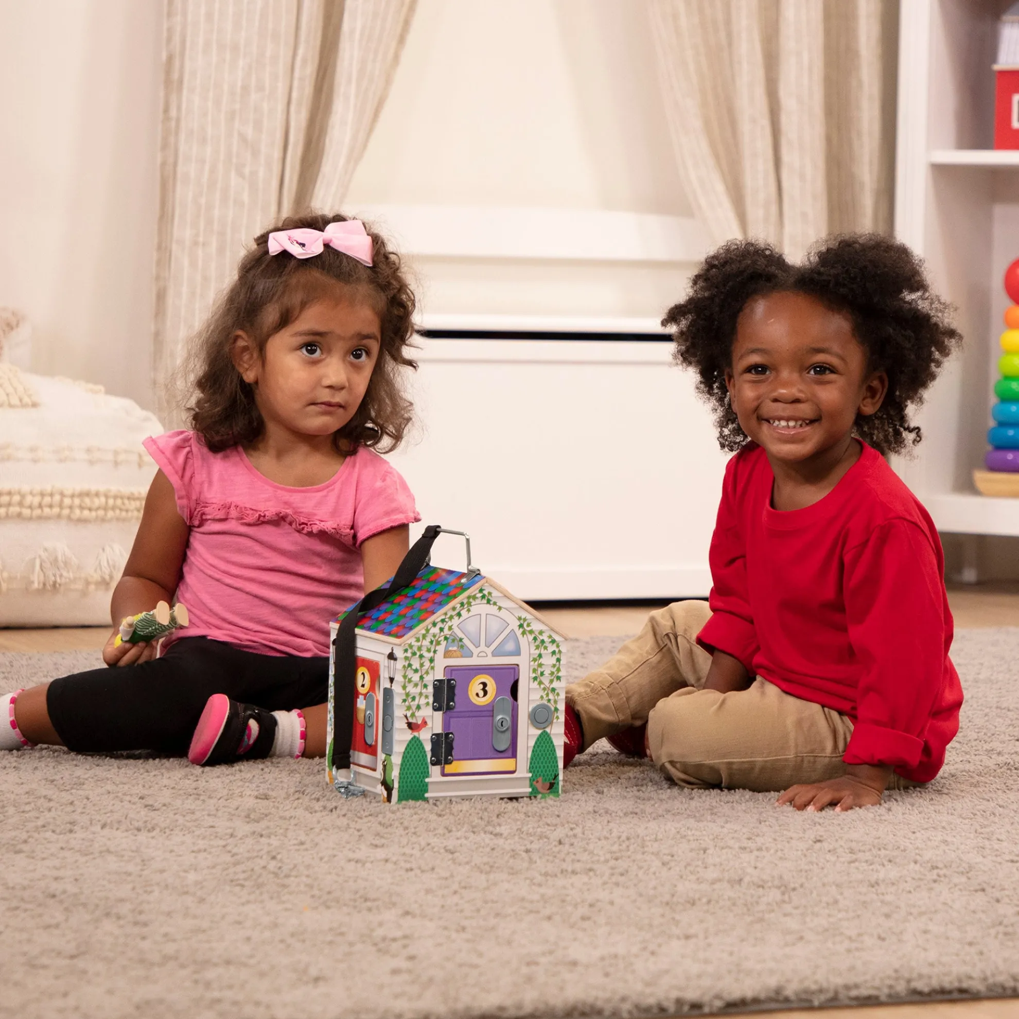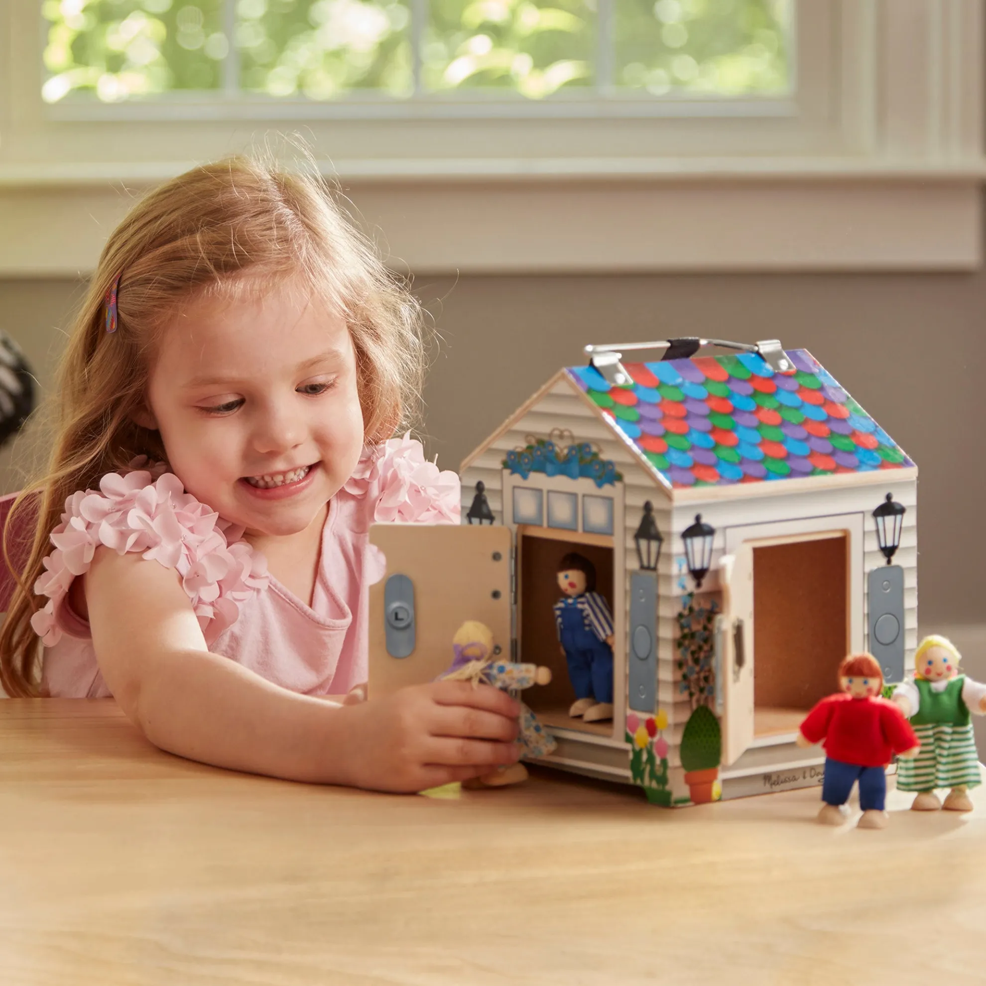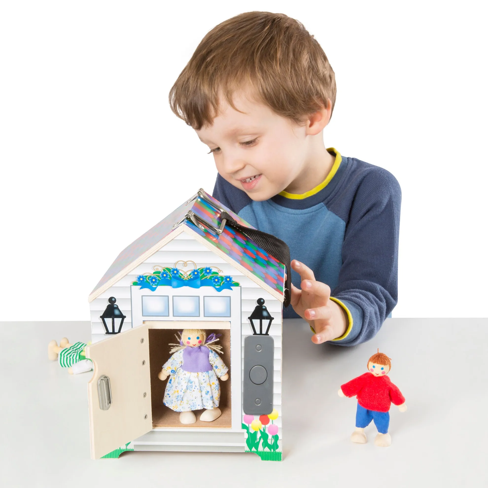 Ding Dong! Fun is at the door of this soundly-built wooden doorbell house. It features four different electronic doorbell sounds, four unique locks with matching keys, and four pose-able play people. So many fun features in this little charming play cottage! Parents will like the fact that the keys are attached to the little house so that they won’t get lost, and the sturdy attached handle allows this exciting house party to go wherever children go! It makes a really wonderful unique gift for kids ages three and older.