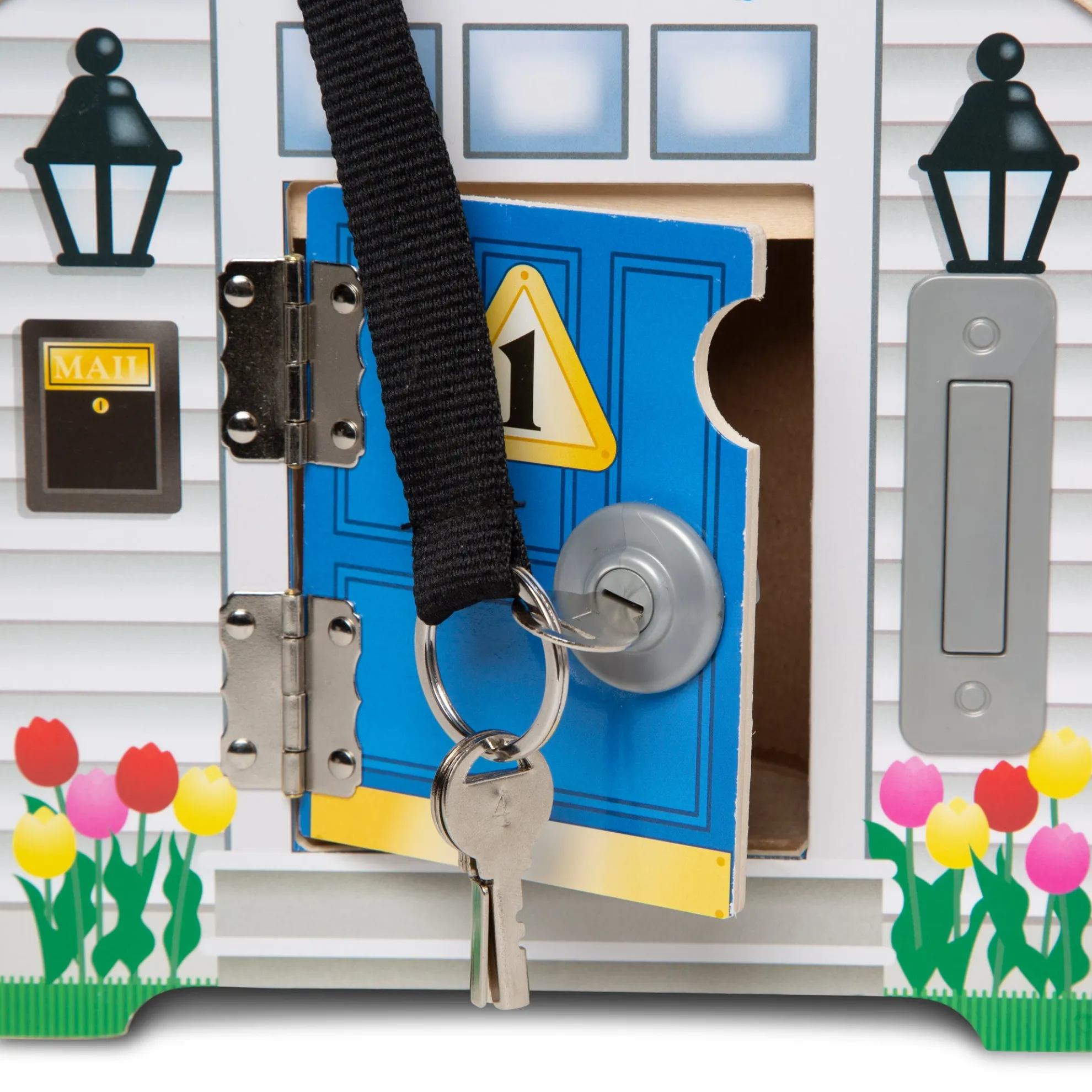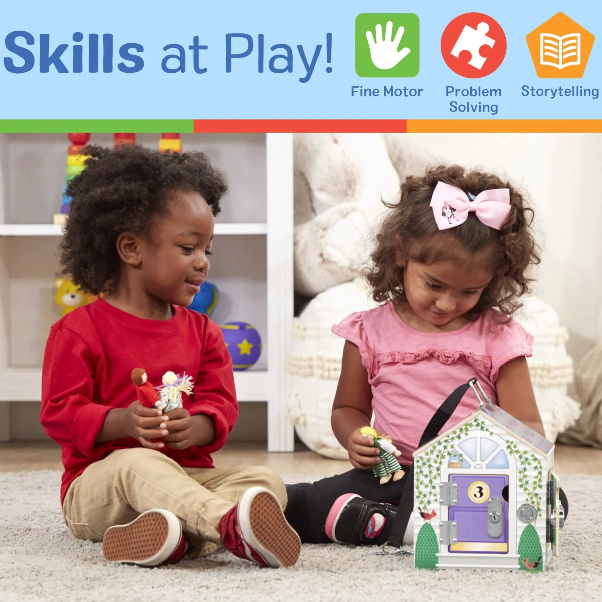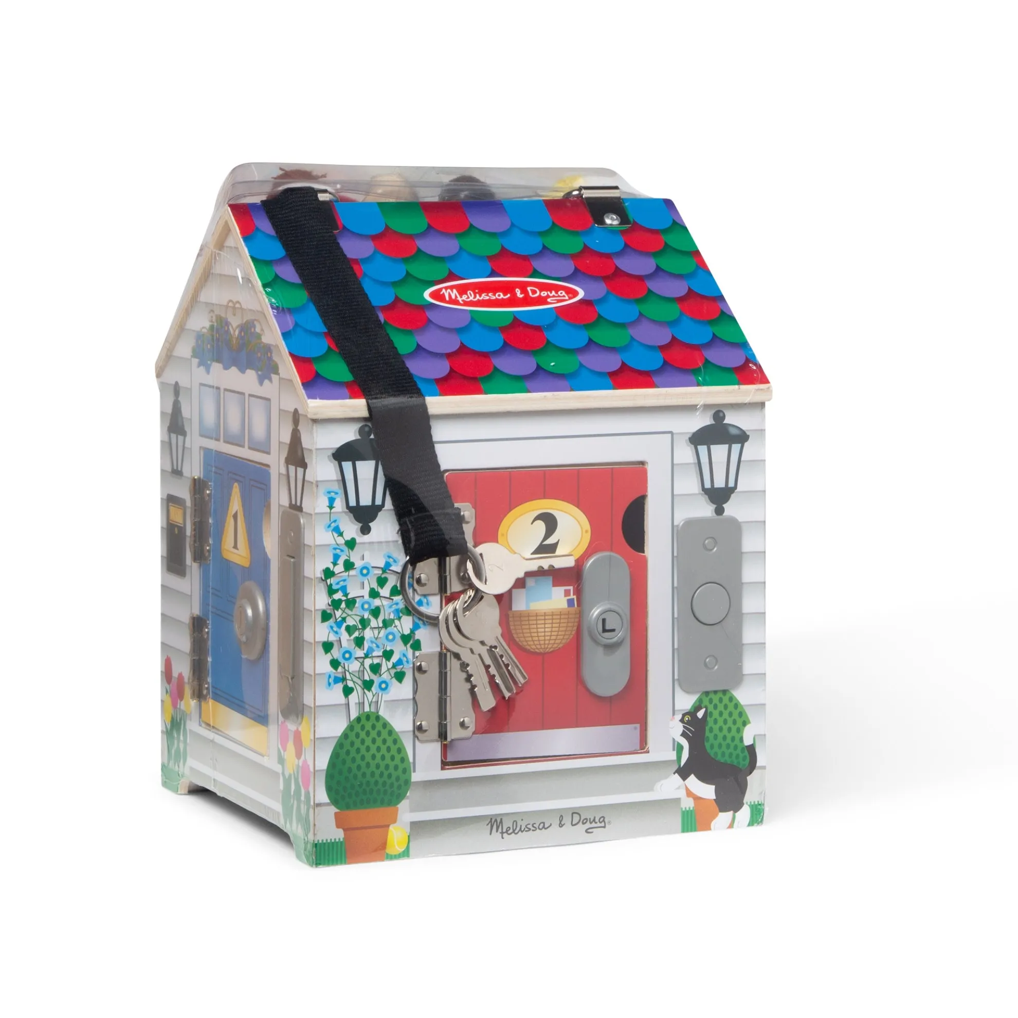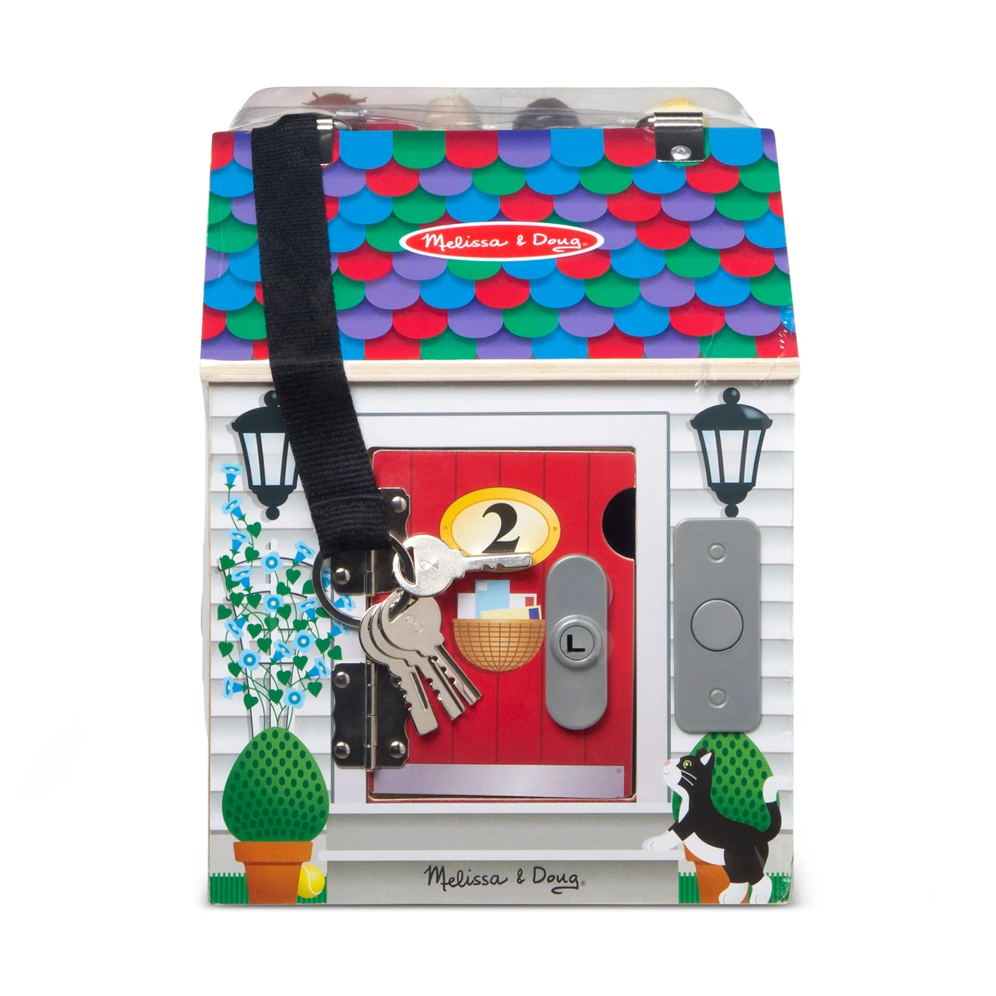 Ding Dong! Fun is at the door of this soundly-built wooden doorbell house. It features four different electronic doorbell sounds, four unique locks with matching keys, and four pose-able play people. So many fun features in this little charming play cottage! Parents will like the fact that the keys are attached to the little house so that they won’t get lost, and the sturdy attached handle allows this exciting house party to go wherever children go! It makes a really wonderful unique gift for kids ages three and older.