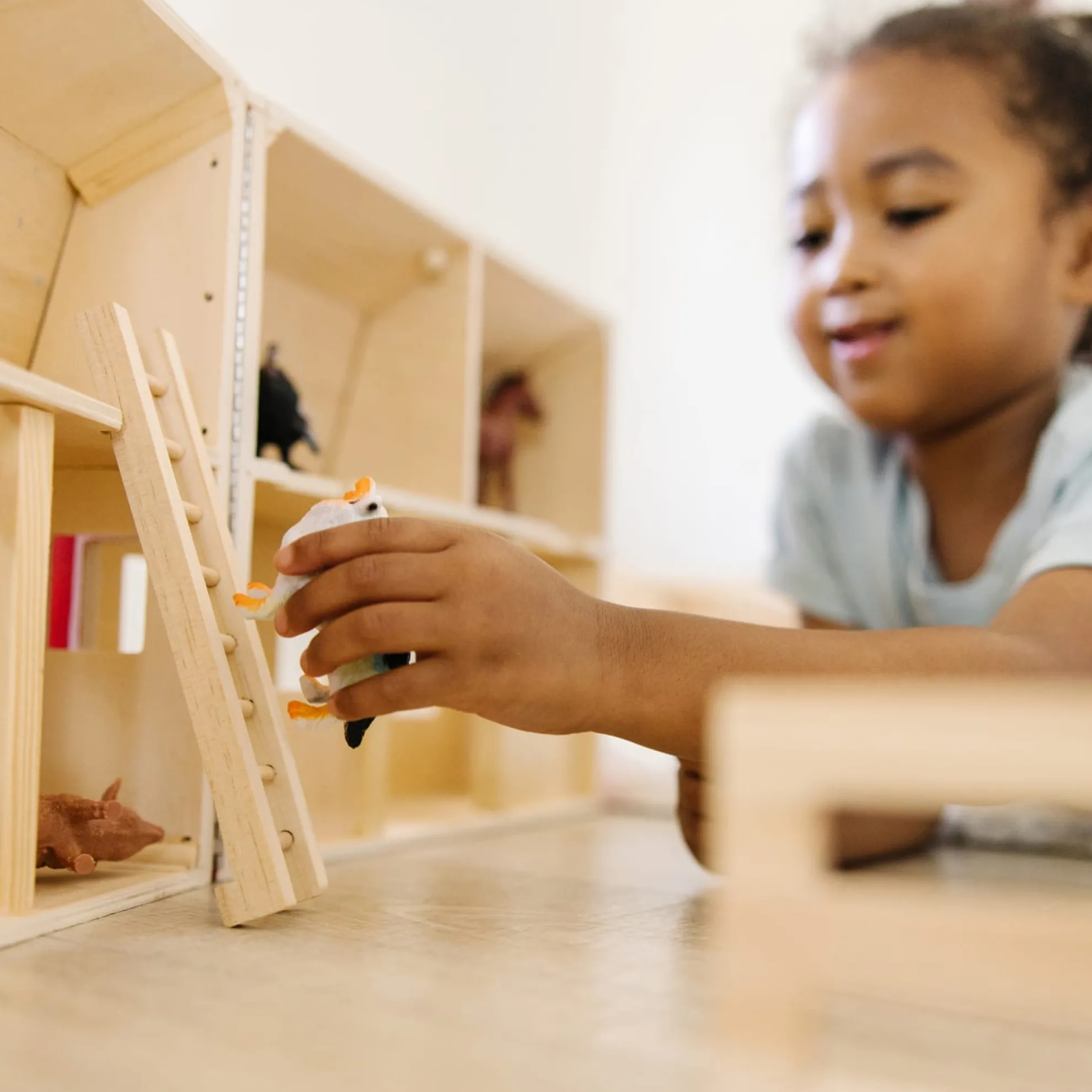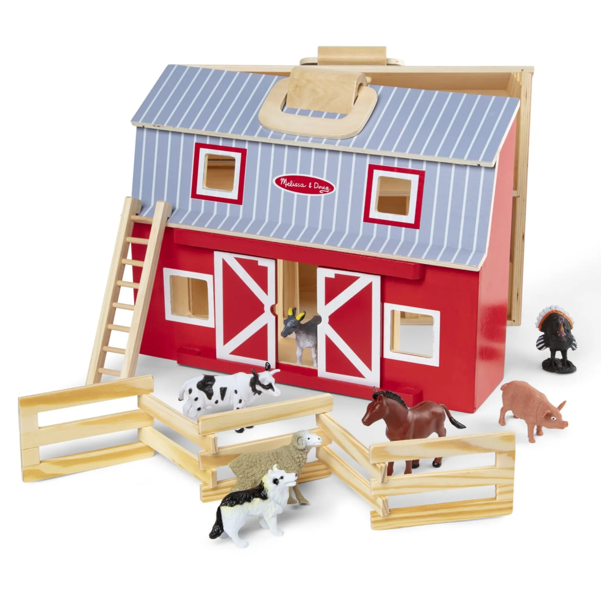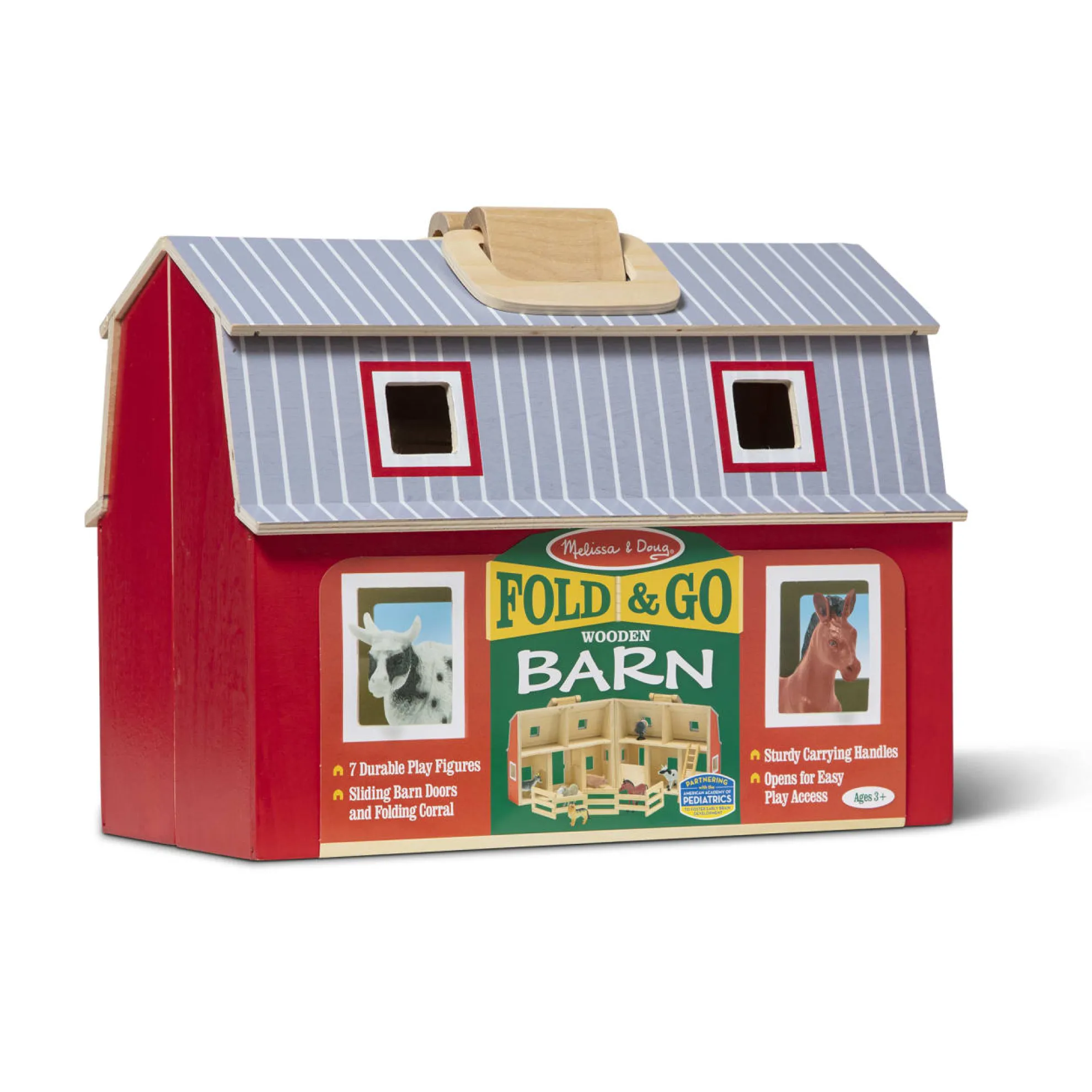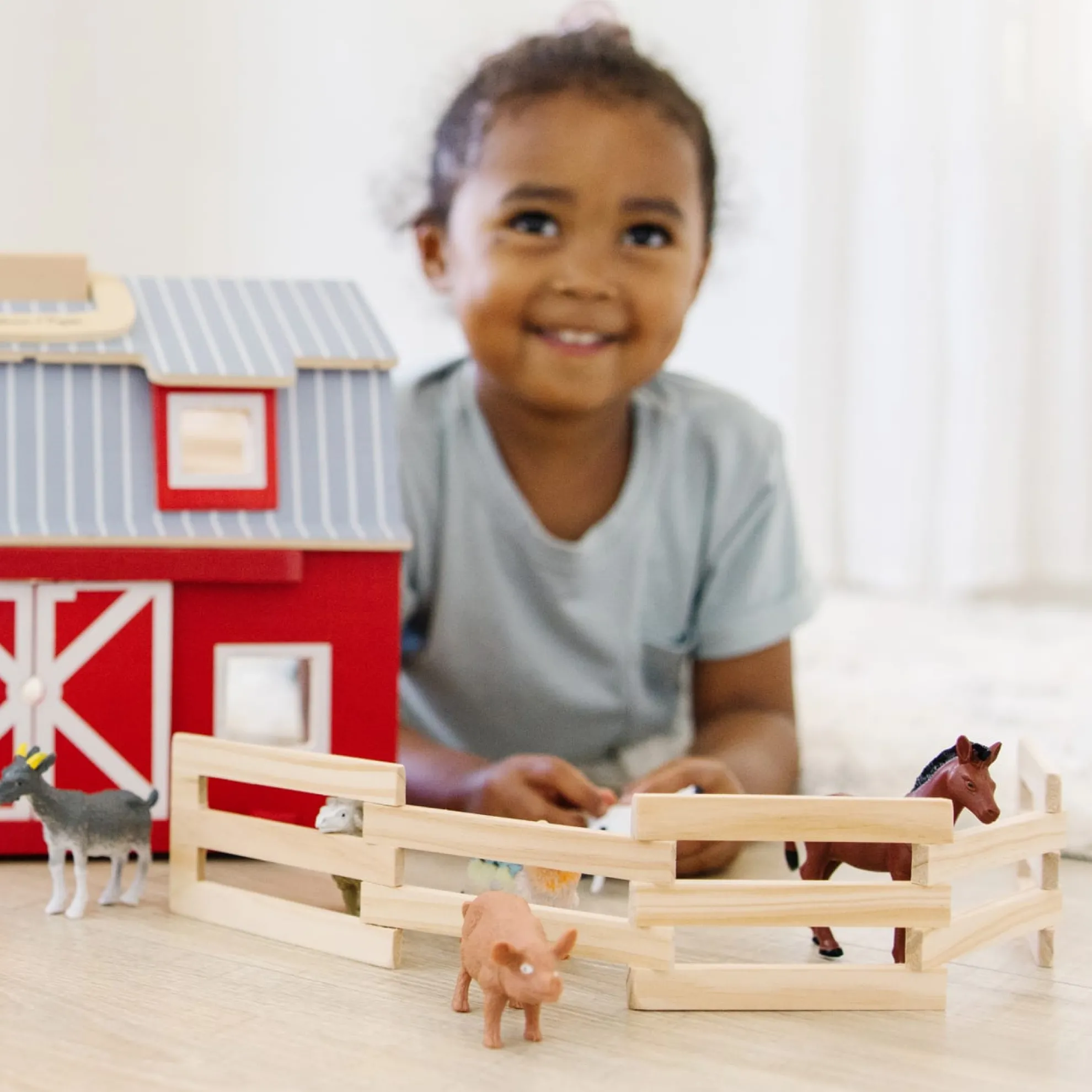 Young MacDonalds will enjoy “down on the farm” fun with this fully assembled, wooden barn play set. The two-story bright red barn is stocked with seven realistic plastic farm animals that kids can recognize including a horse, a goat, a pig, and more. The toy farm set also includes and wooden ladder that goes up to the second floor hayloft, and a folding corral to keep those wanderers nearby. The chunky wooden handles make it easy for kids to take their bit of “country” wherever they go! The bright red barn opens wide for easy play access and closes up for convenient storage and on-the-go play. The barn features doors that open and close, and plenty of open windows so little ones can check in on their farm animals inside their stalls. The Melissa & Doug Fold & Go Wooden Barn is made from durable, high-quality wood, designed for longevity and reliability. It makes a great gift for kids ages three and older for hands-on, screen-free play.