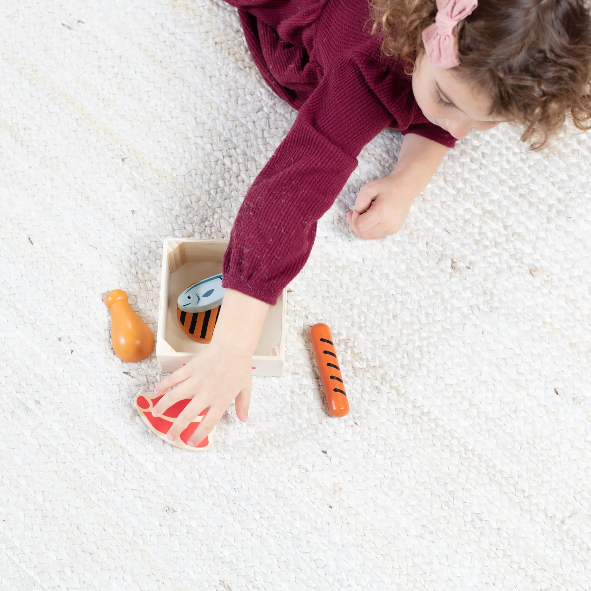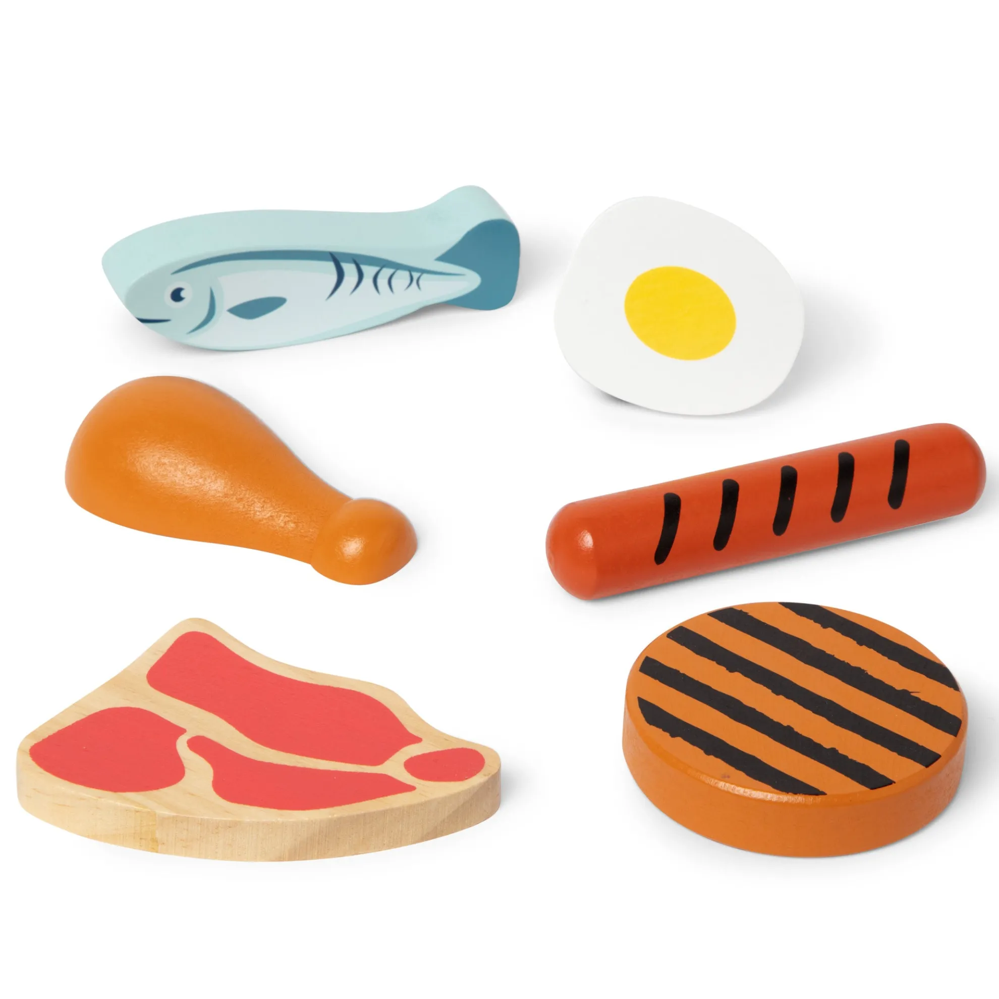 - Wooden play food set featuring items from the protein food group