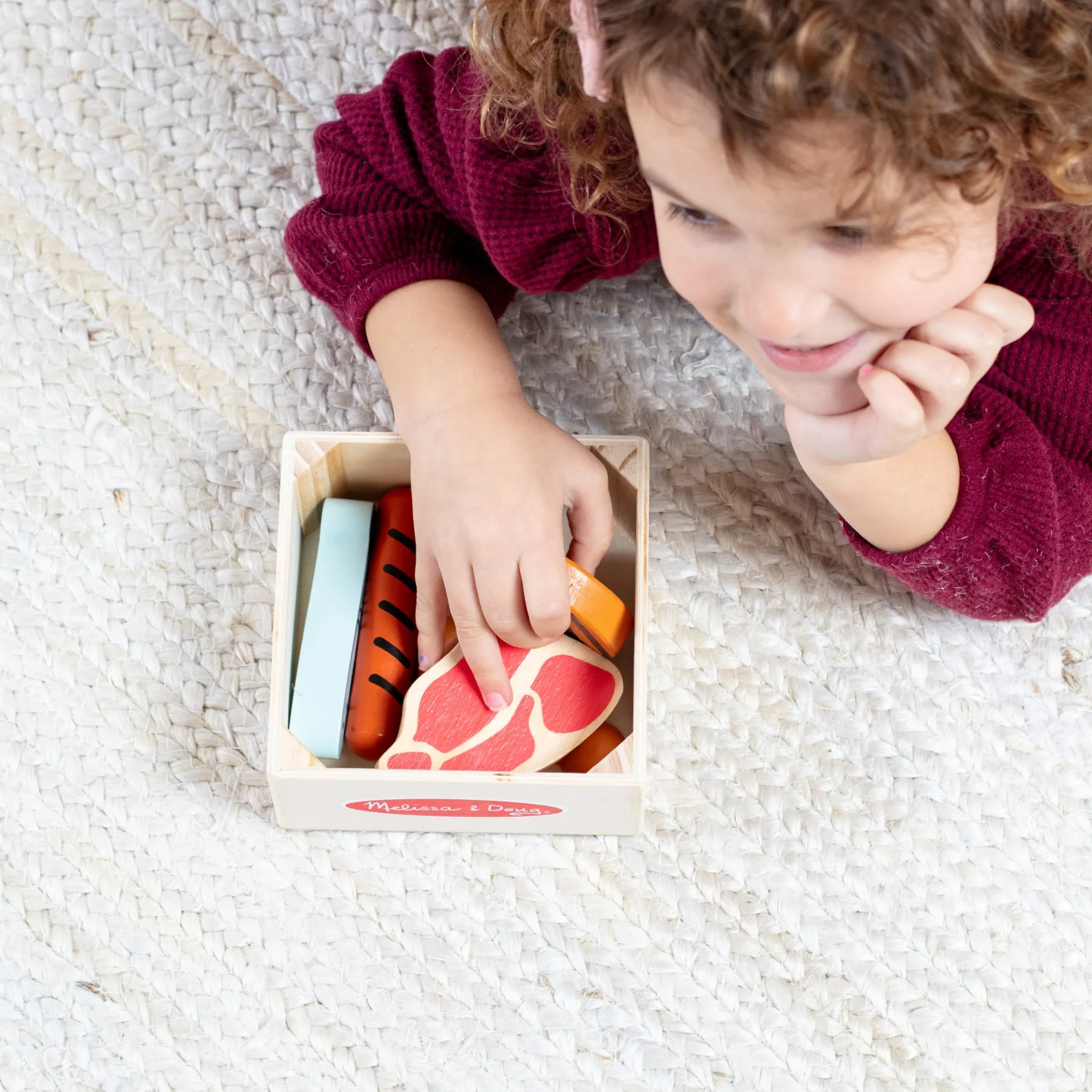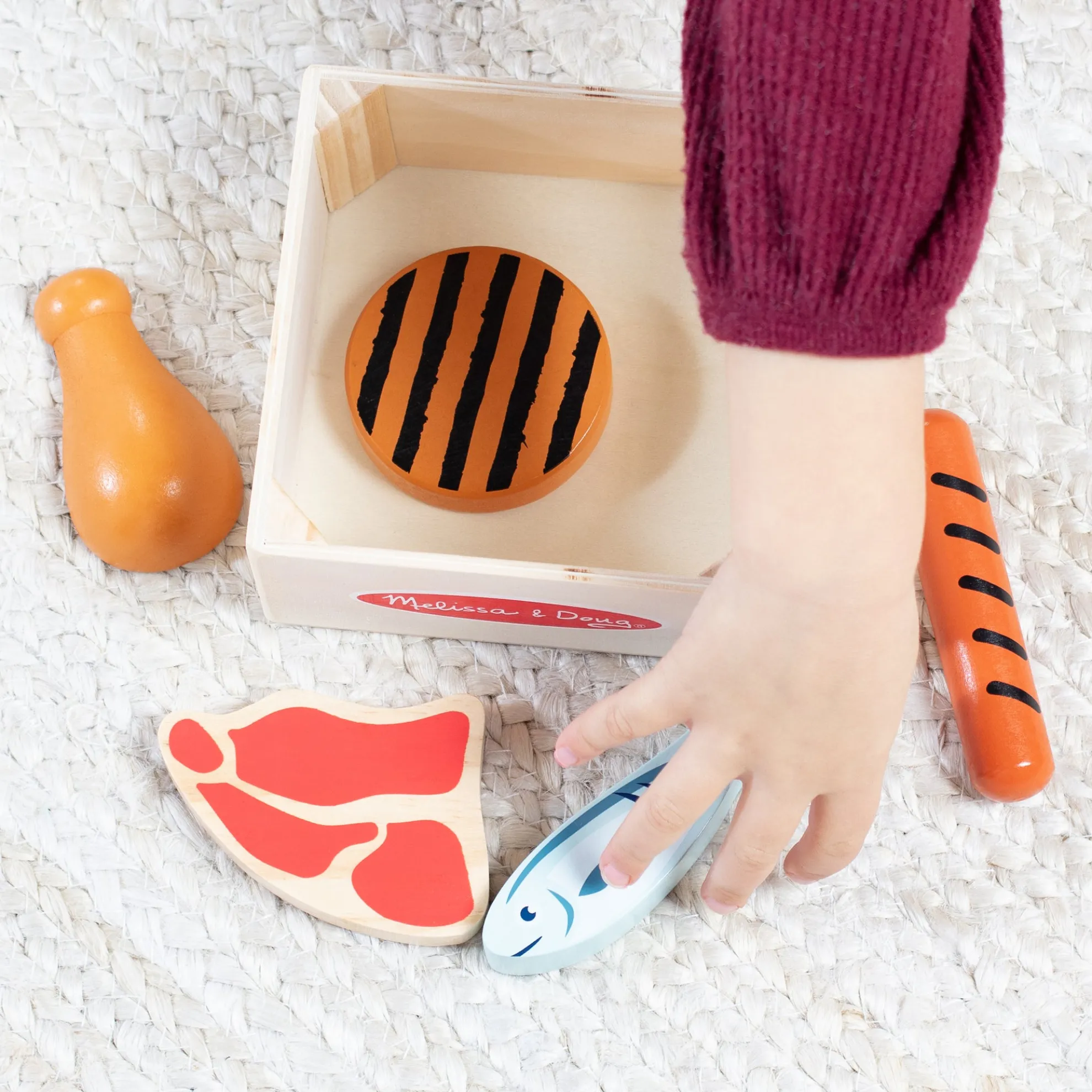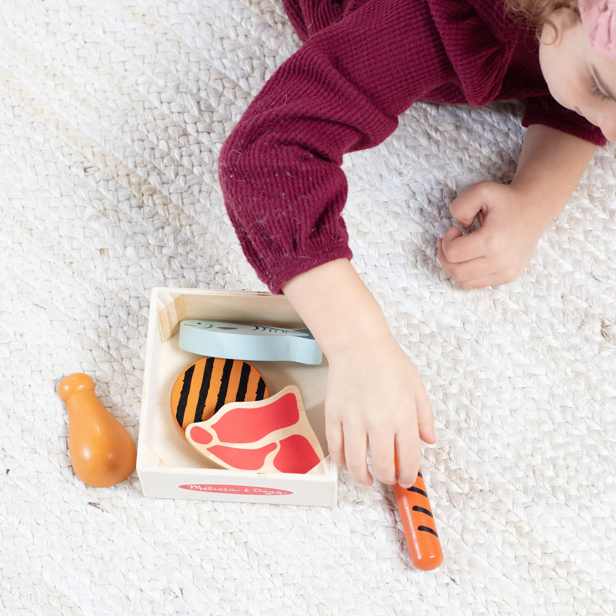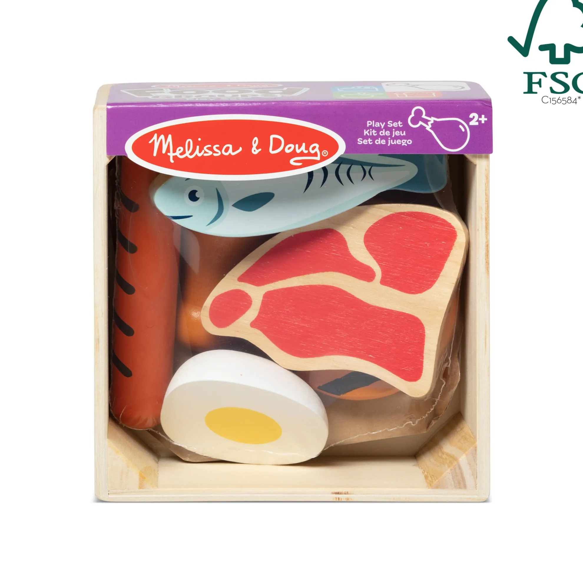 Enjoy well-balanced play with wooden play food from the protein food group, including a chicken leg, hot dog, egg, steak, fish, and a burger. The realistic play food is crafted to last for countless hours of imaginative play and stores in a sturdy wooden tray for easy sorting. Kids two-years-old and older will find the set fun to play with on its own and perfect for play kitchens, restaurants, and grocery stores. Combine with other Melissa & Doug food group sets to satisfy hungry imaginations! This product is certified by the Forest Stewardship Council. FSC certification ensures that products come from responsibly managed forests that provide environmental, social, and economic benefits, and that forests are protected for future generations. Please note that FSC certification applies to new inventory only (FSC C156584)