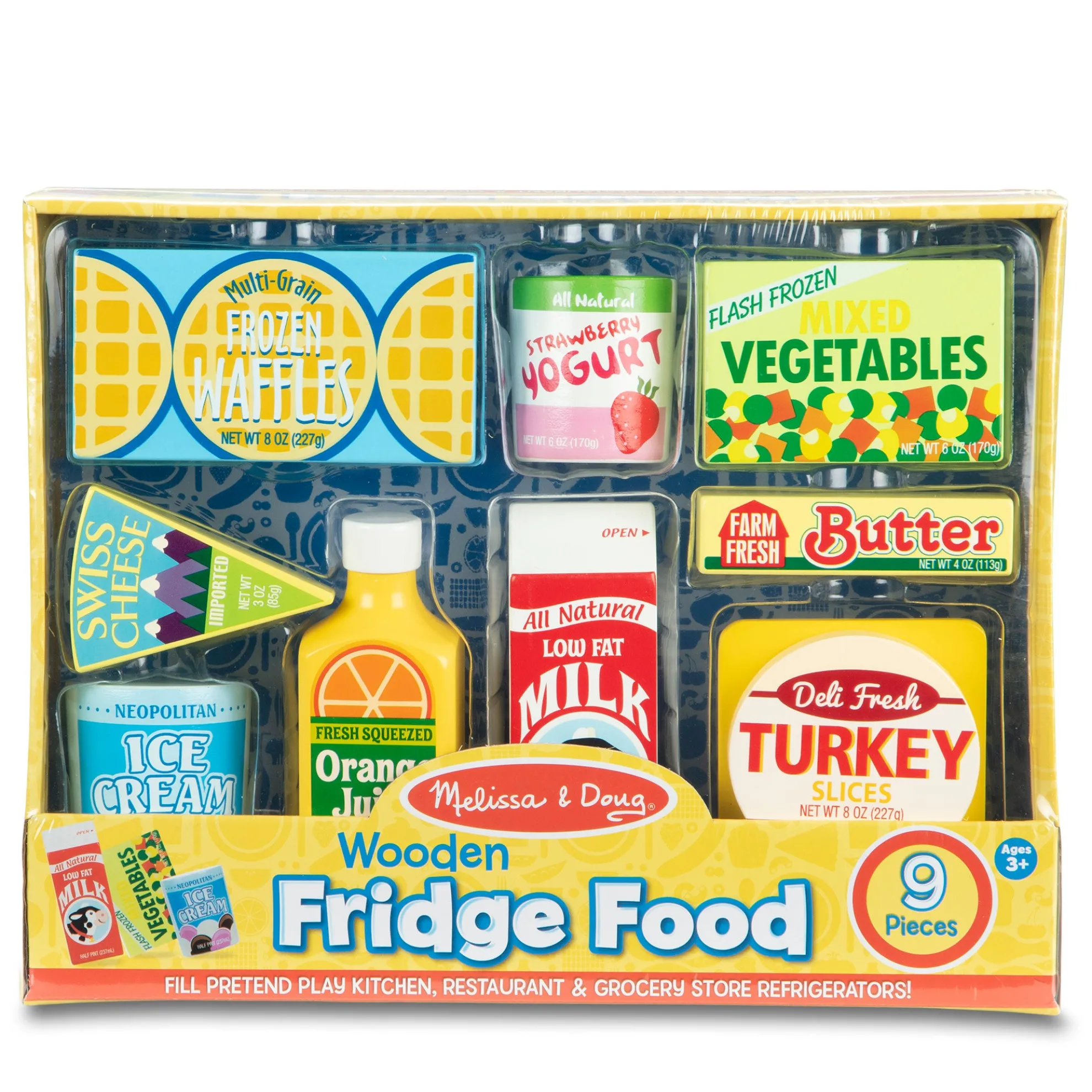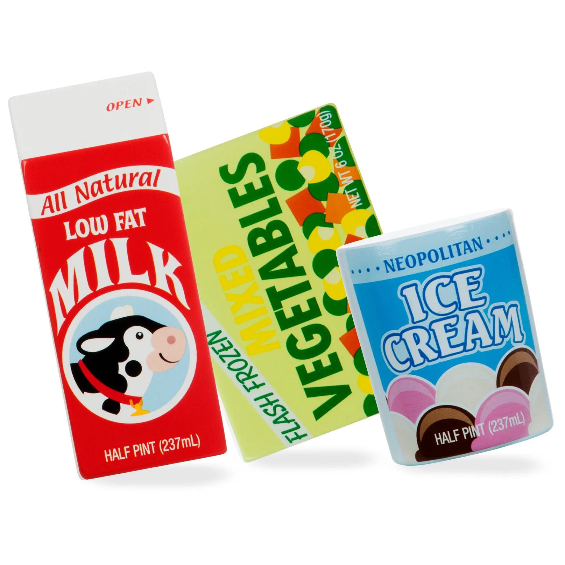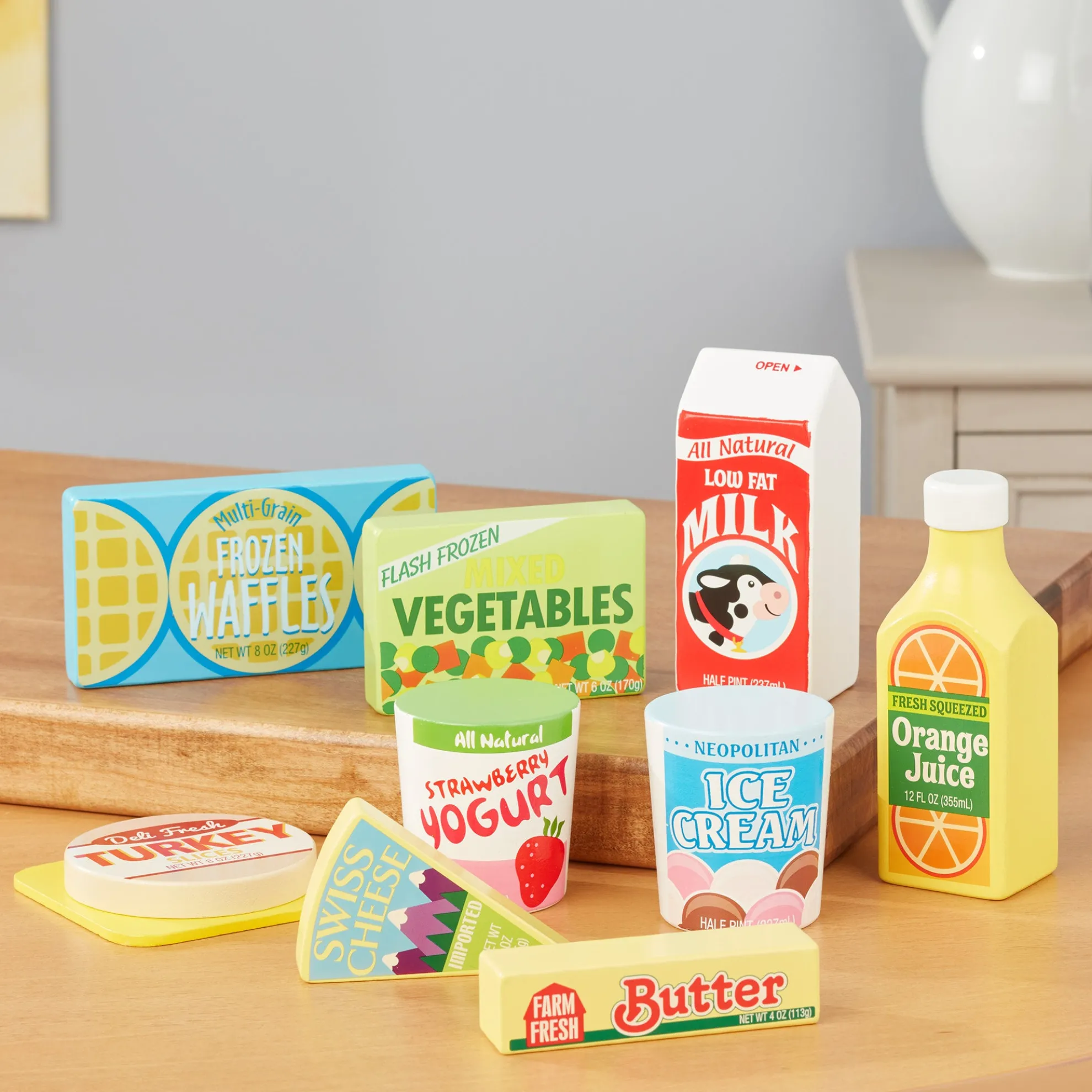 Unpack these “chilled” wooden groceries into your play refrigerator and freezer for delicious food play. Perfect for pretend kitchen play, or as novel manipulatives for counting, sorting and more. Nine wooden toy pieces include lots of dairy products and other fridge favorites, including orange juice, waffles, milk, ice cream, cheese, yogurt, bologna, frozen vegetables and butter.
