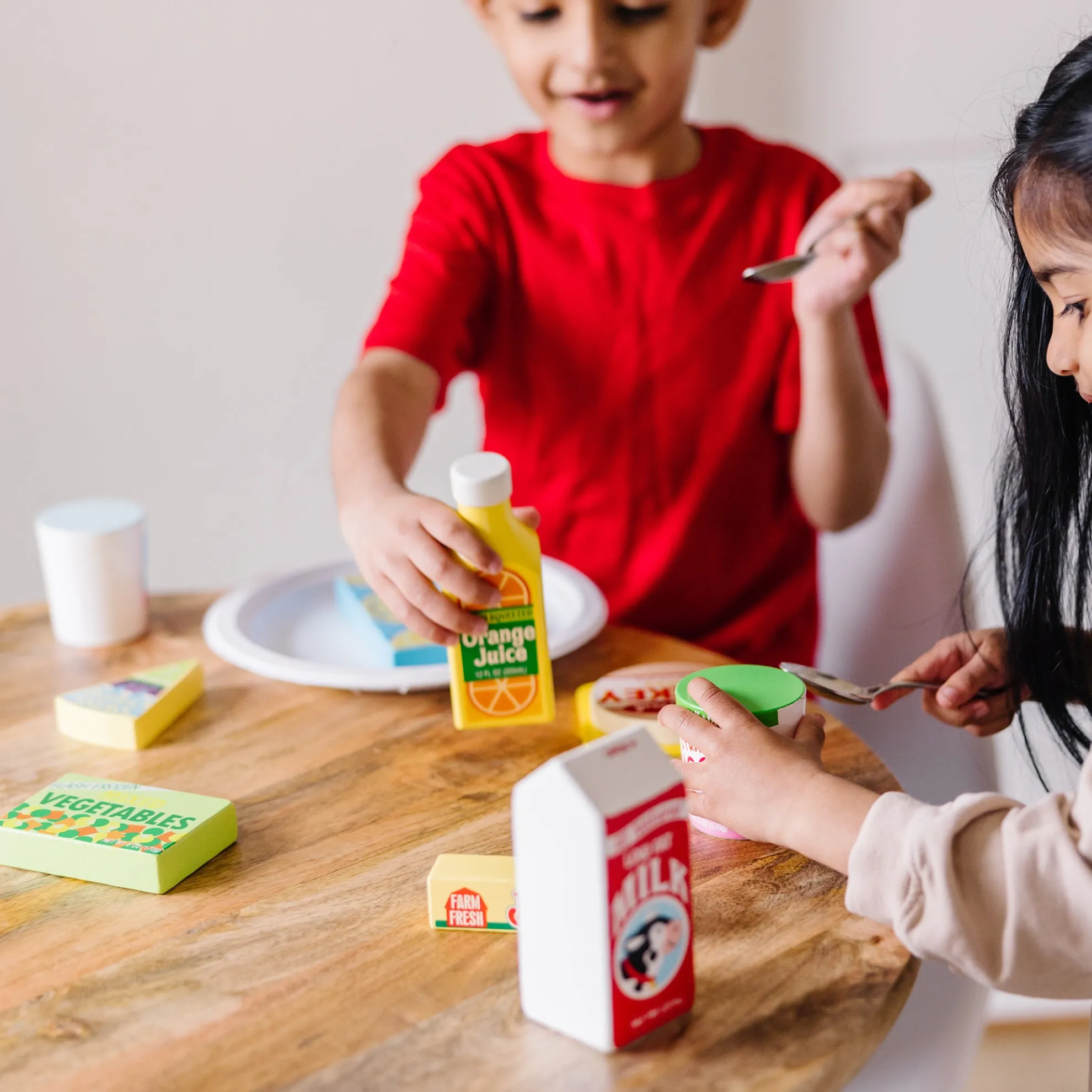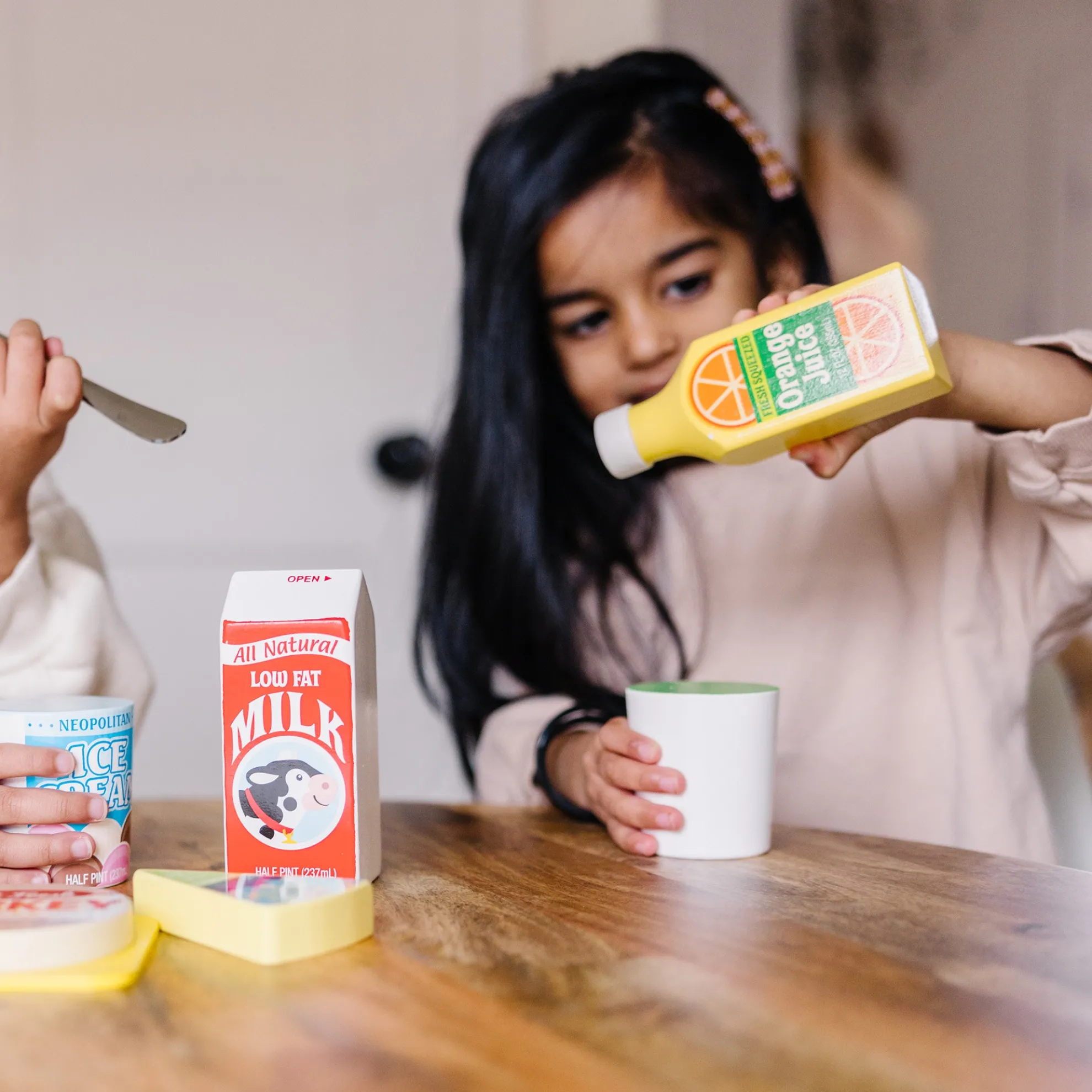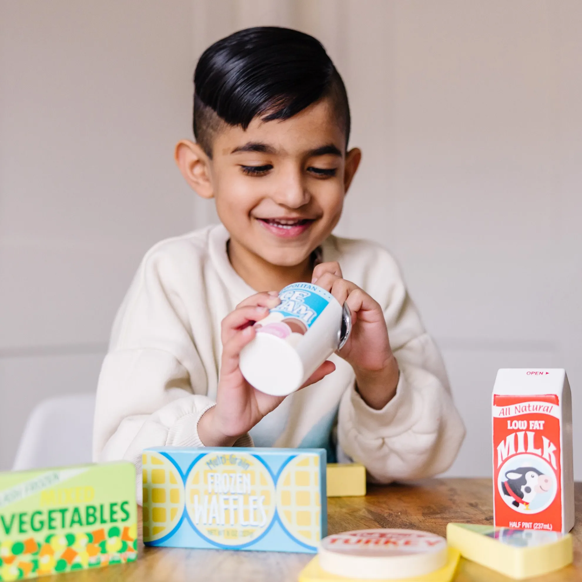 Unpack these “chilled” wooden groceries into your play refrigerator and freezer for delicious food play. Perfect for pretend kitchen play, or as novel manipulatives for counting, sorting and more. Nine wooden toy pieces include lots of dairy products and other fridge favorites, including orange juice, waffles, milk, ice cream, cheese, yogurt, bologna, frozen vegetables and butter.