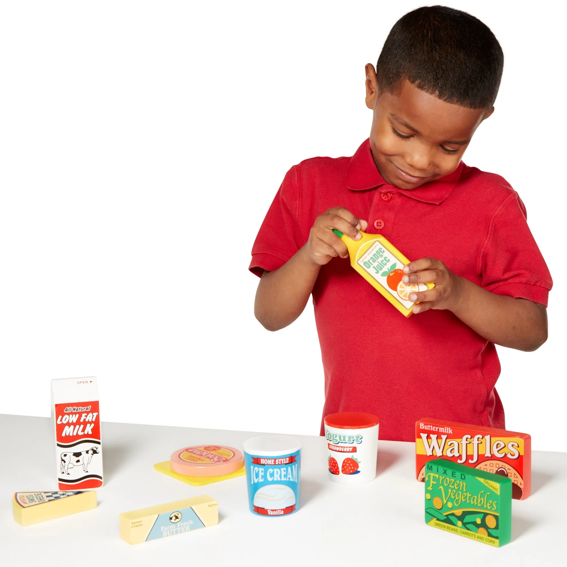 - 9-piece set includes waffles, milk, ice cream, swiss cheese, butter, frozen vegetables, orange juice, yogurt, lunch meat