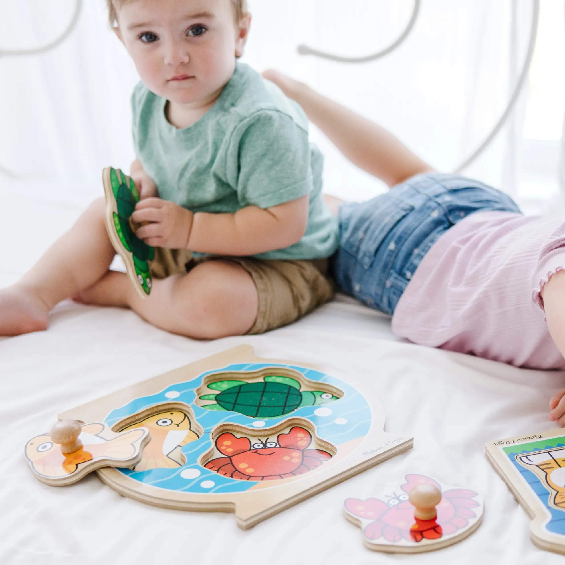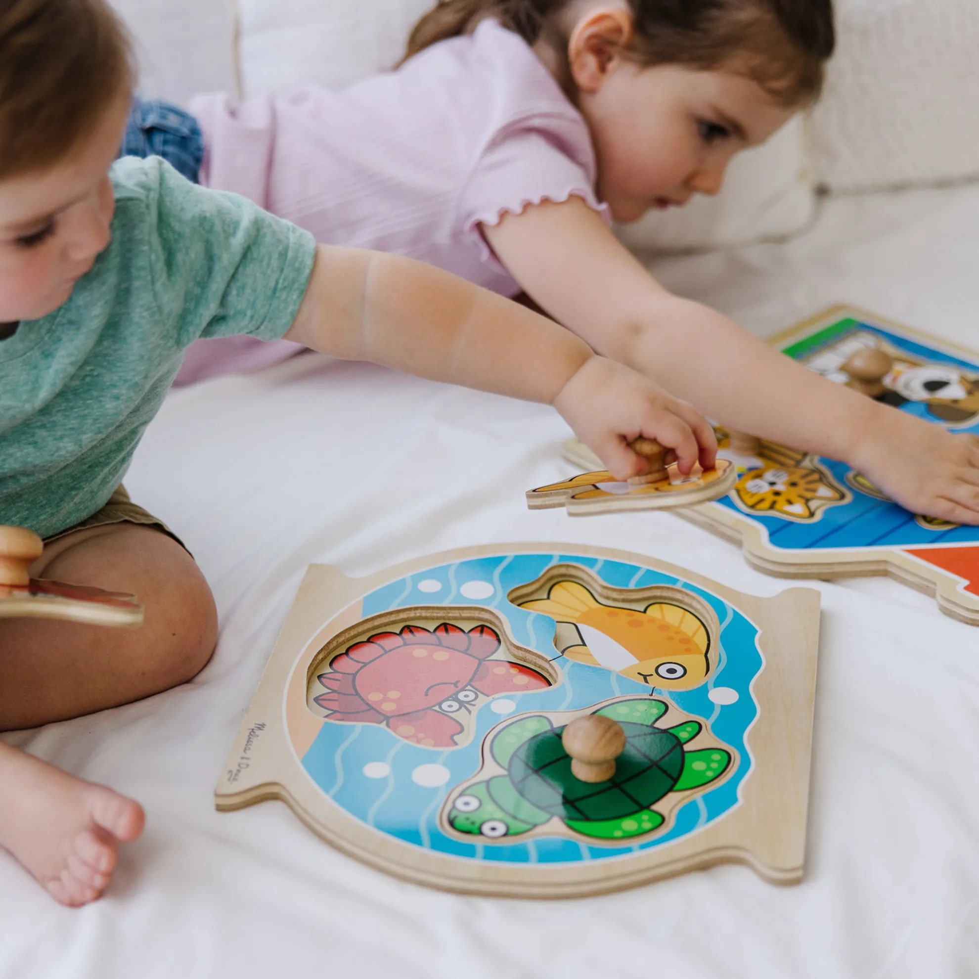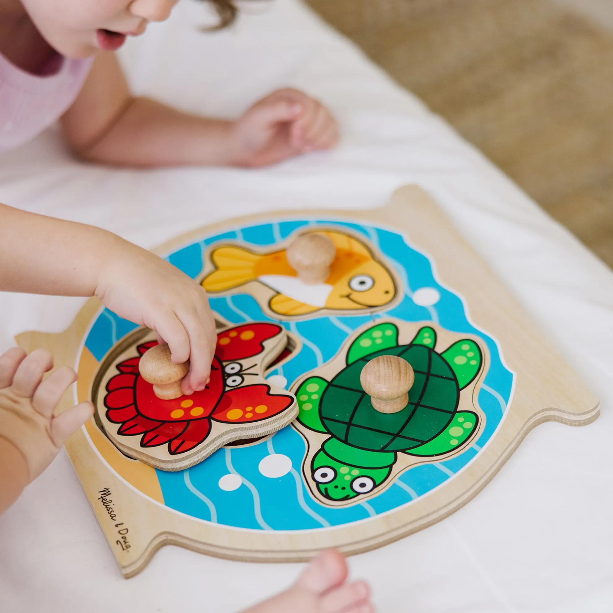- Pieces have easy-grip knobs and matching pictures underneath
