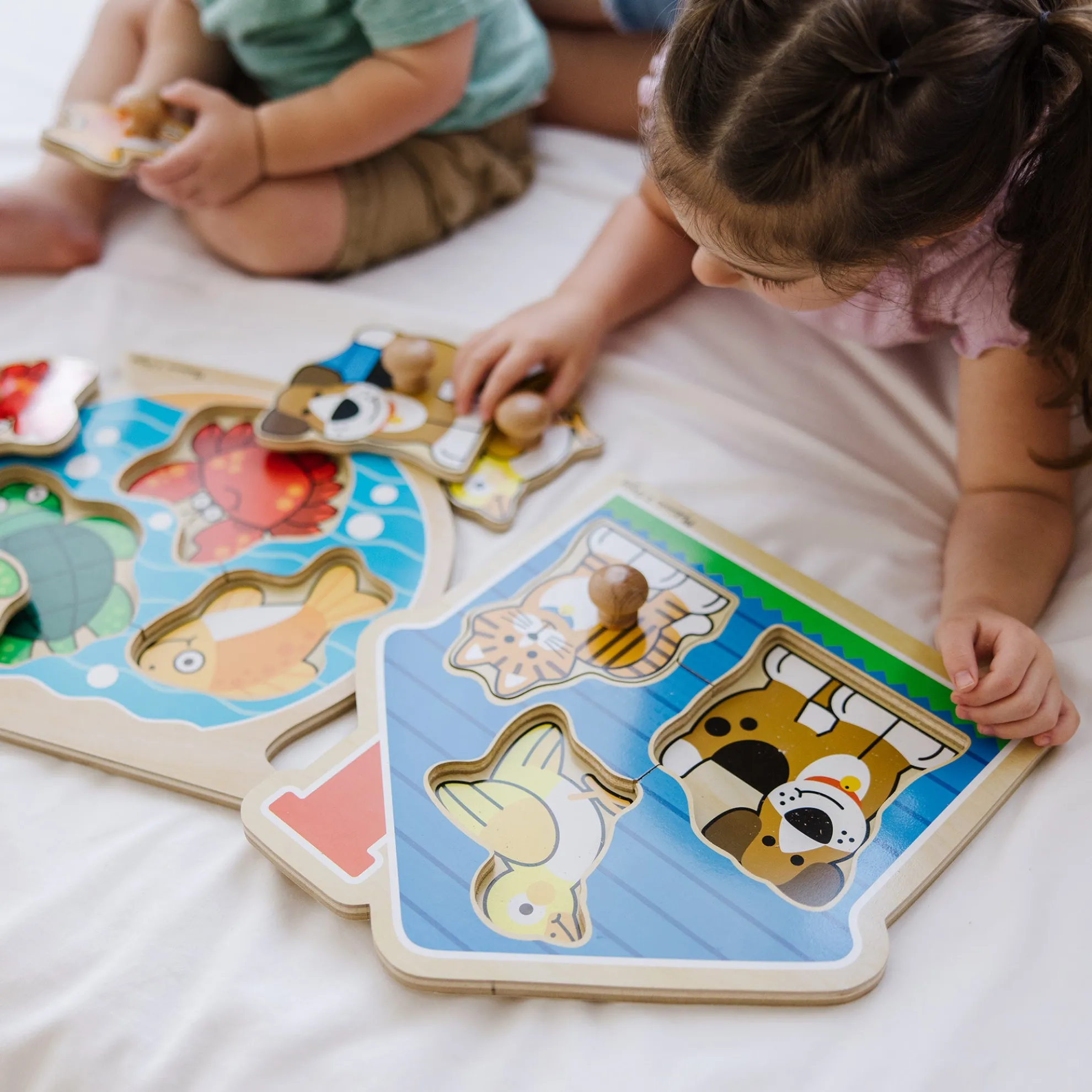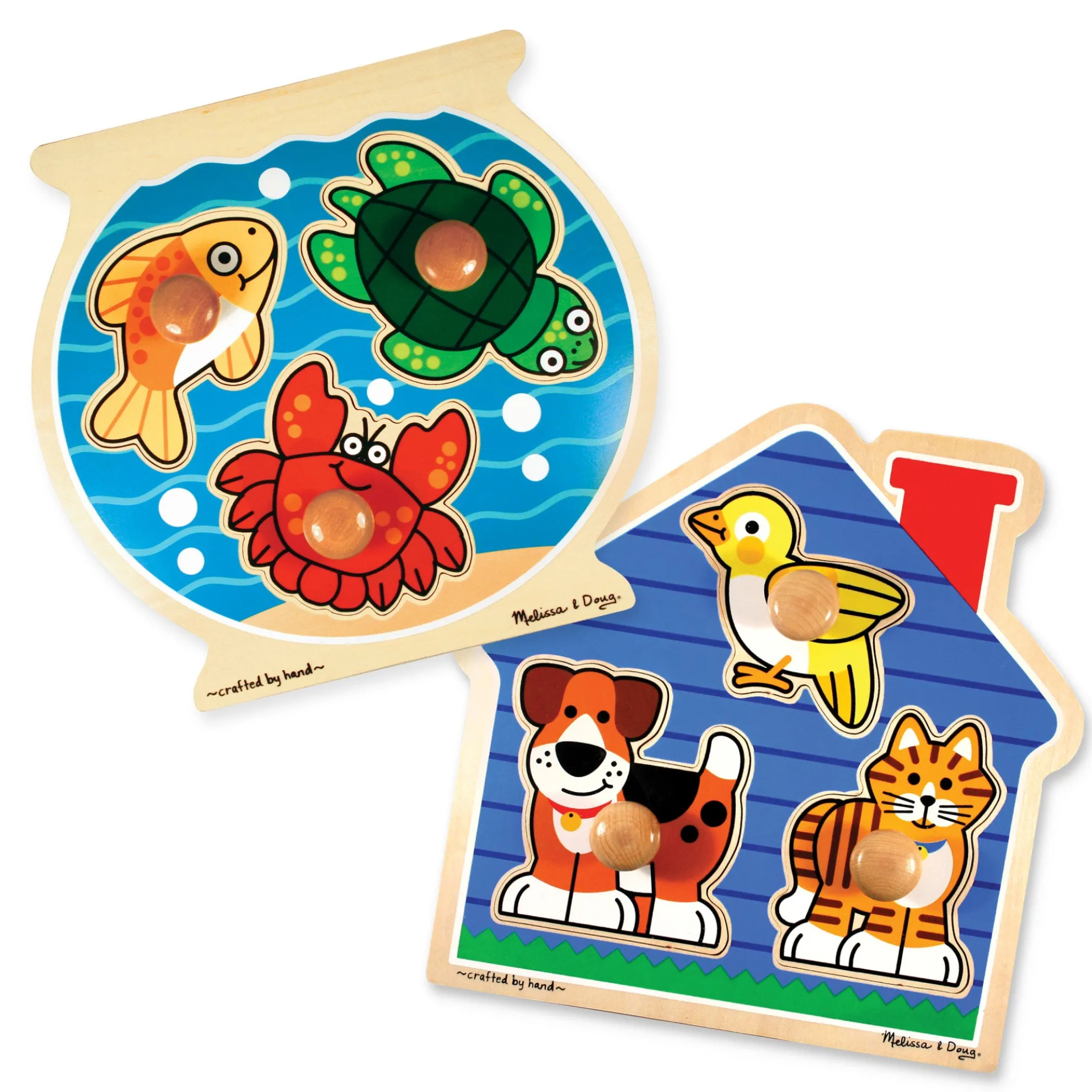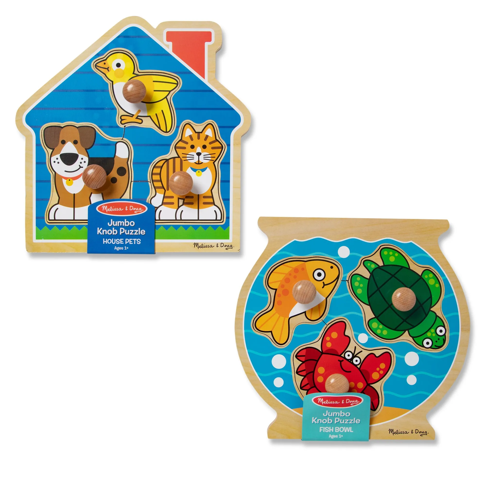 Grab on to these perfect first puzzles! Each extra-thick wooden puzzle has three pieces with easy-to-grasp wooden knobs that fit just right in small hands. Three favorite pets live in a cozy blue house puzzle board (Pets) and a fish, a turtle and a crab sit in a fishbowl-shaped puzzle board. Full-color, matching pictures appear underneath each piece. Jumbo knob puzzles are a great activity to encourage hand-eye coordination and visual perception skills.