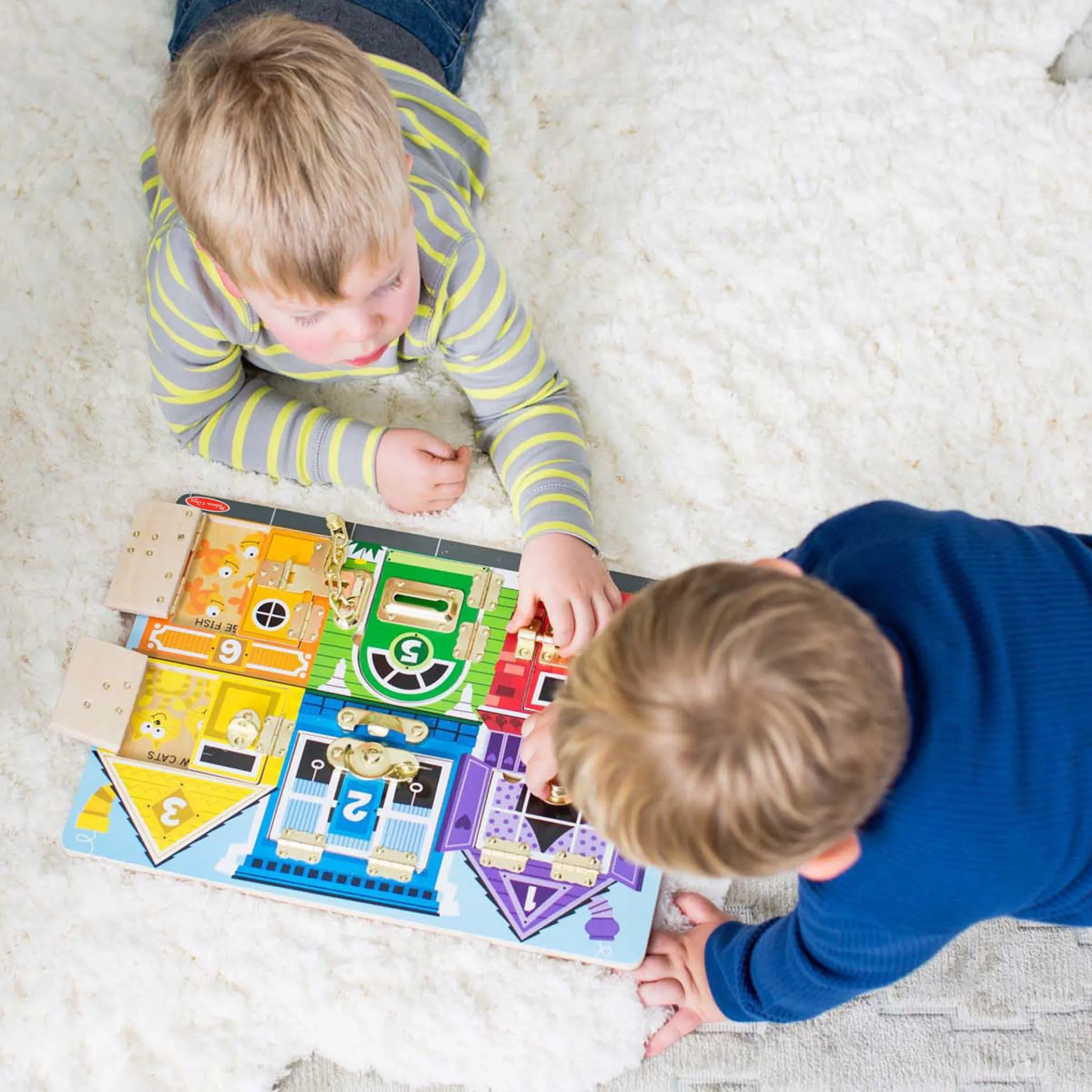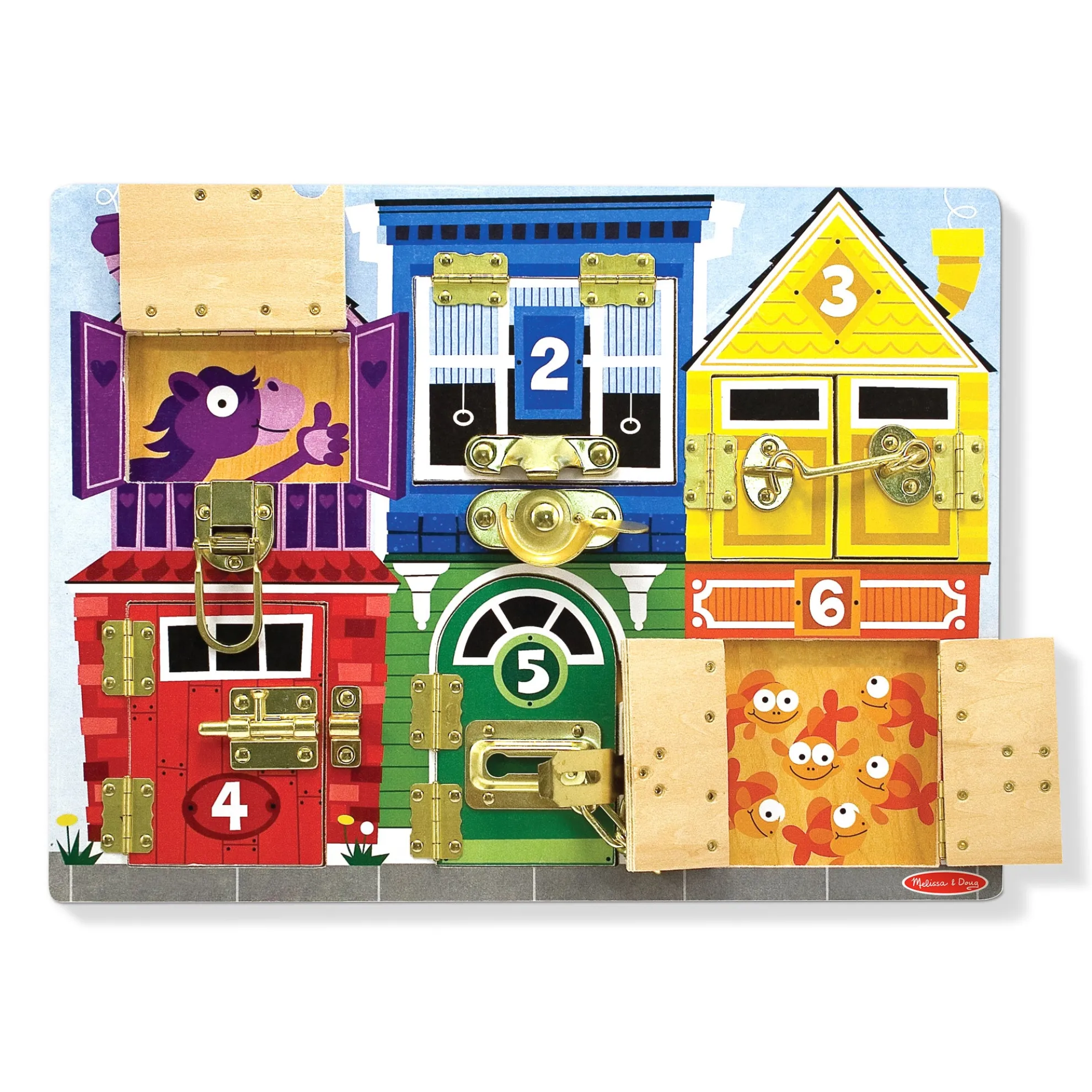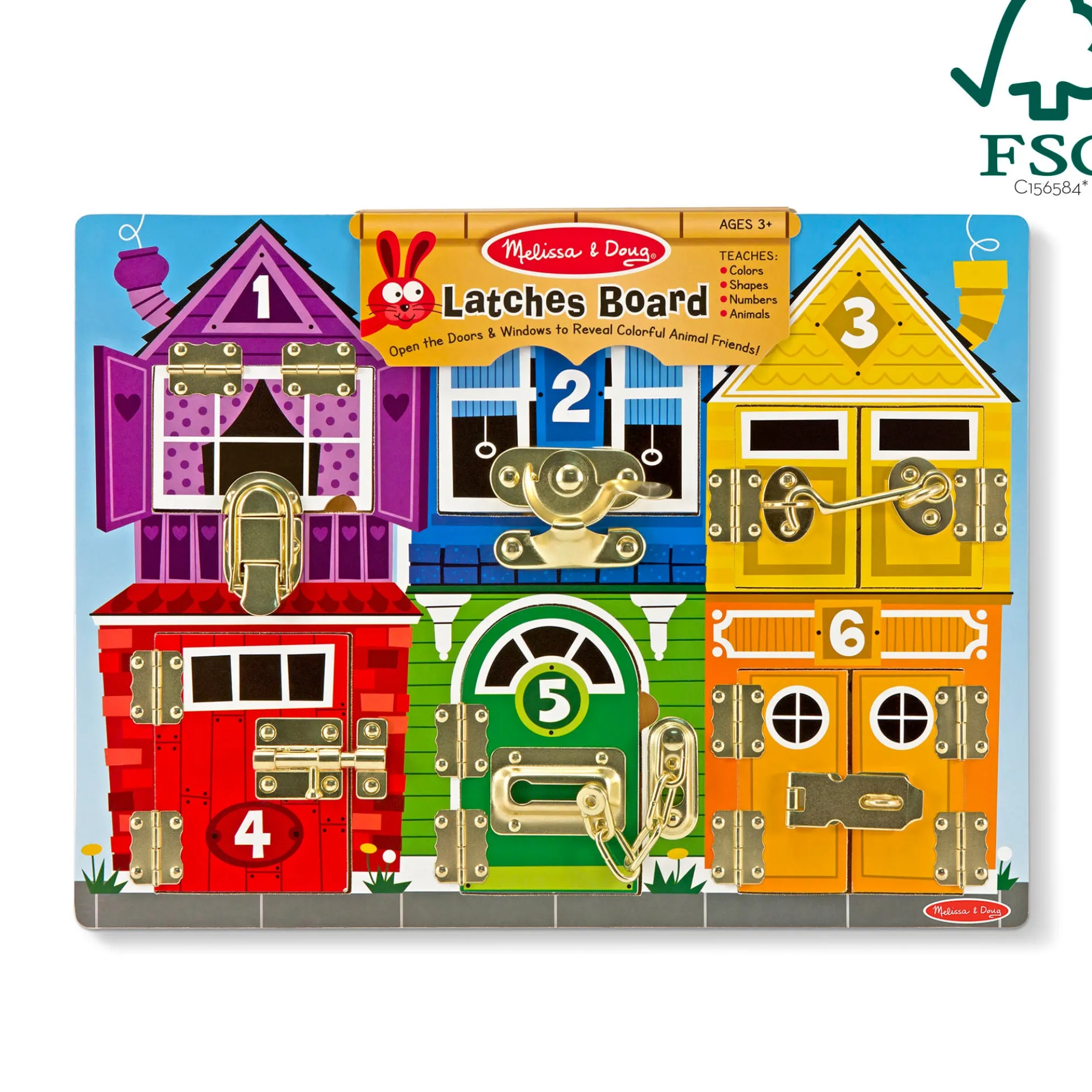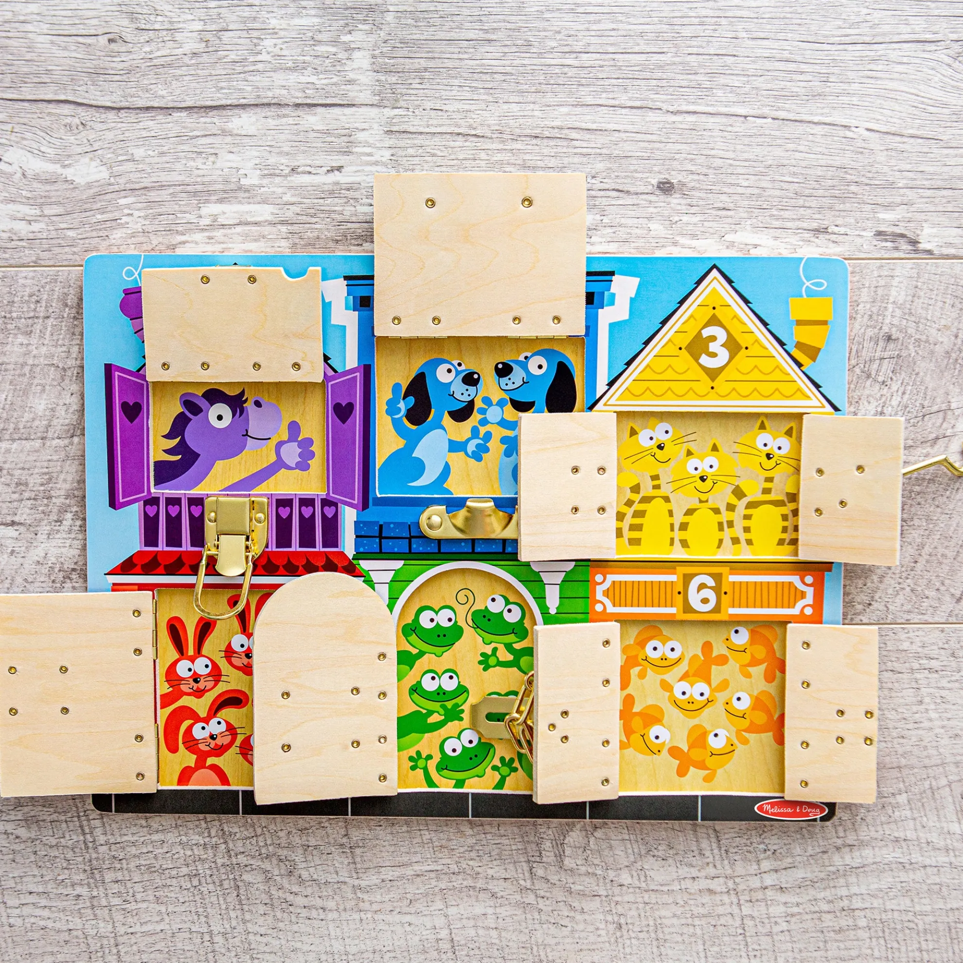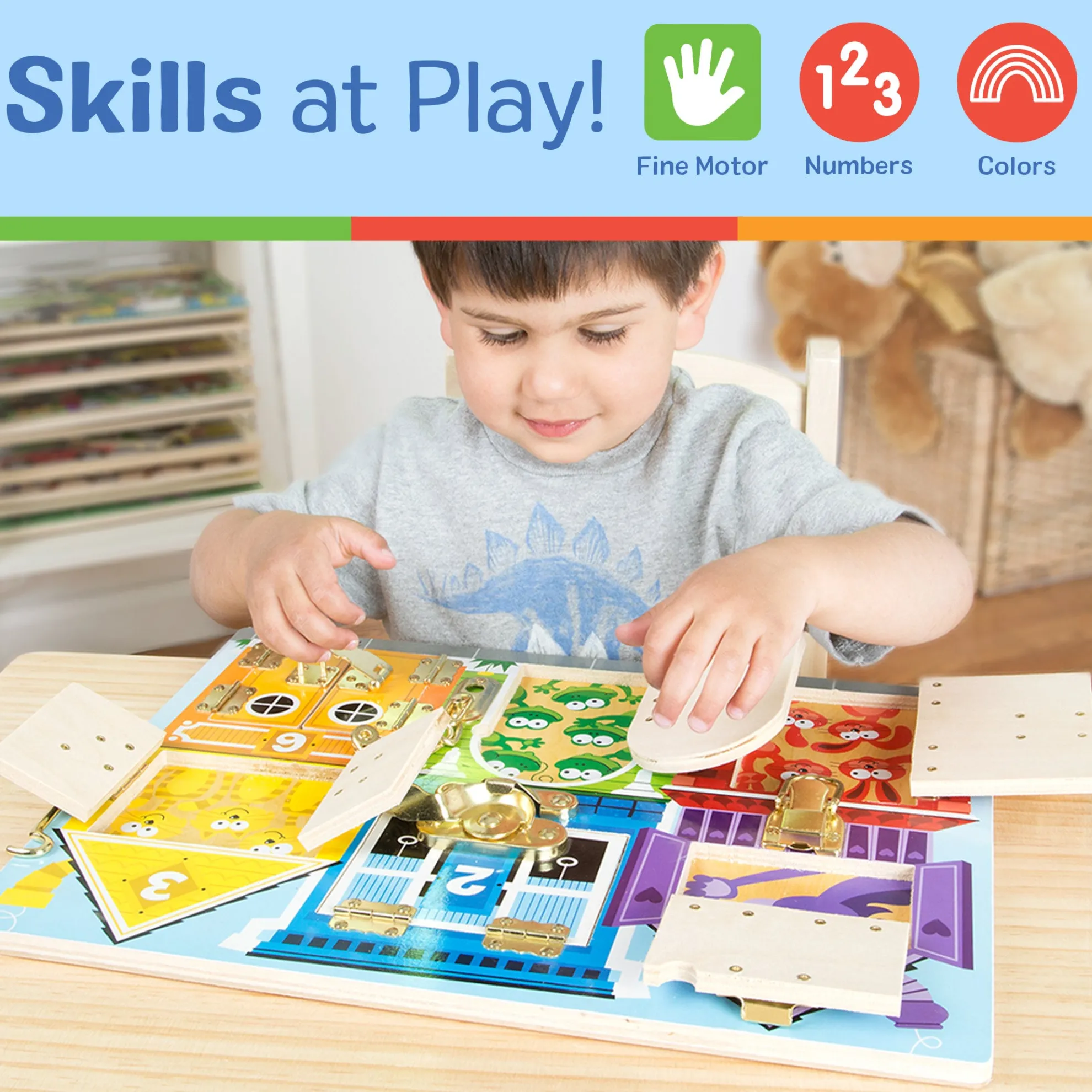 Which animal friends are hiding behind the colorful doors? Undo a lock or latch, swing open the numbered door or window, and count on finding fun when the animal picture beneath is revealed. The Melissa & Doug Latches Board for toddlers is made from smooth-sanded, solid-wood material that features different kinds of latches sized just right for little hands. The windows and doors open up to reveal fun surprises that can keep children engaged while they practice important skills. The activity board is an educational toy that helps little ones build fine and gross motor skills while learning colors, shapes, numbers, animals and more! Parents and older kids can engage with children by playing multiple games including counting animals behind the doors and windows, locating specific colors, and identifying the type of animals displayed. The wooden activity board makes a great gift for preschoolers ages three and older for hands-on, screen-free play. This product is certified by the Forest Stewardship Council. FSC certification ensures that products come from responsibly managed forests that provide environmental, social, and economic benefits, and that forests are protected for future generations. Please note that FSC certification applies to new inventory only (FSC C156584)