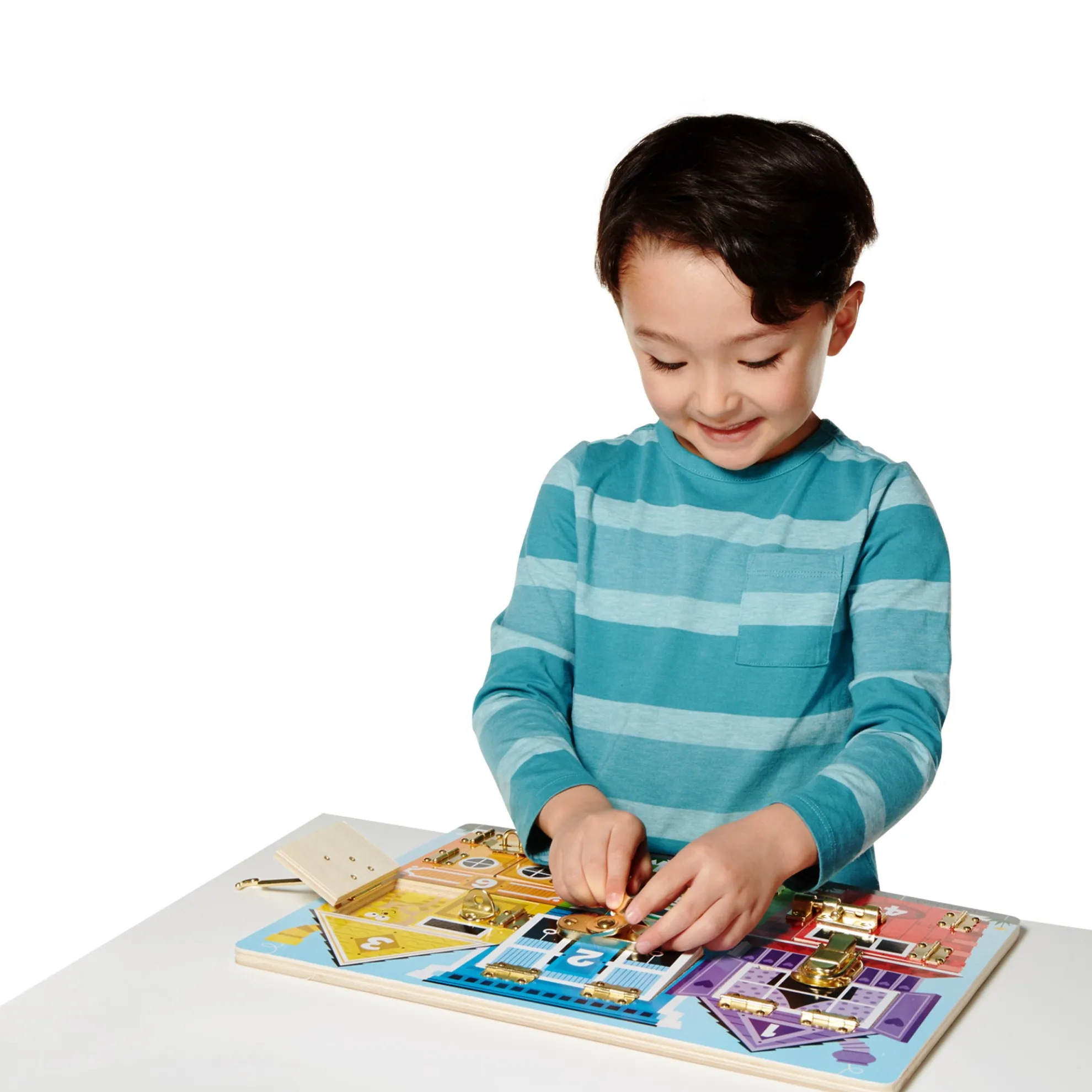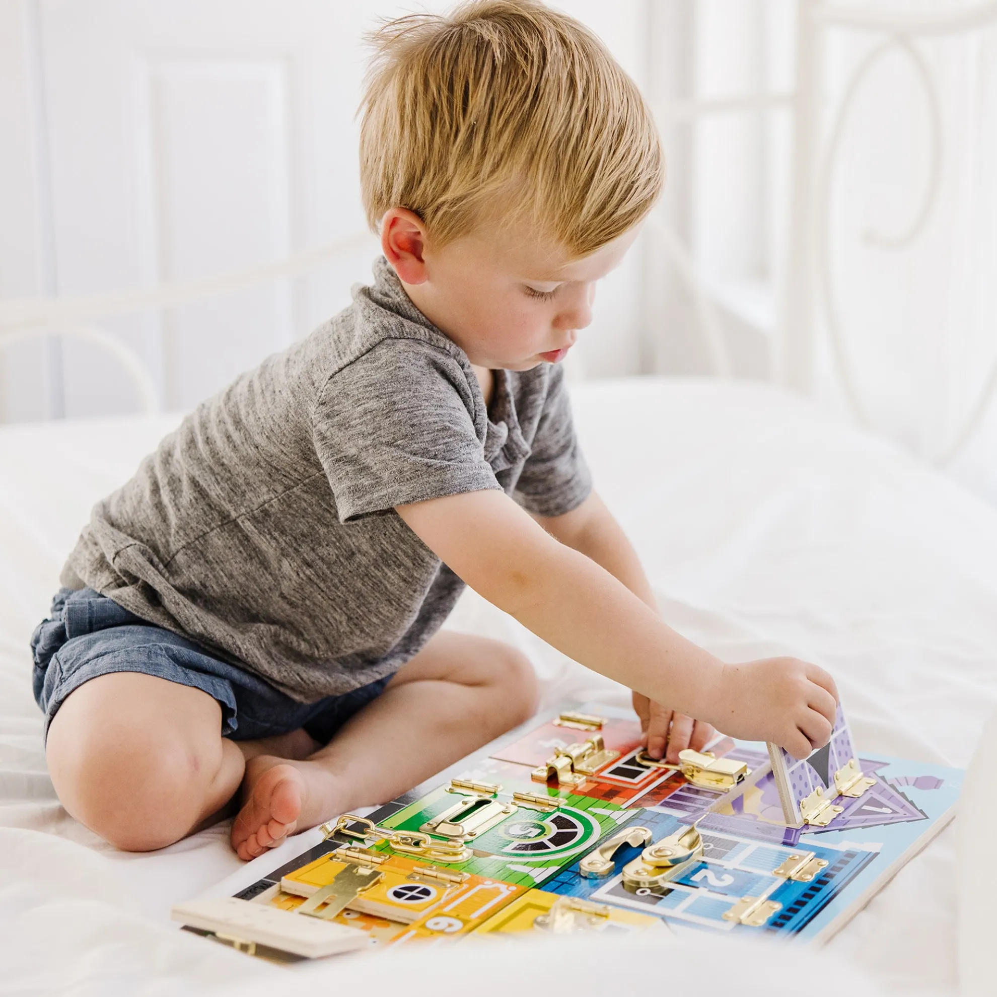 - Activity play board helps kids build dexterity as they figure out how 6 different latches work