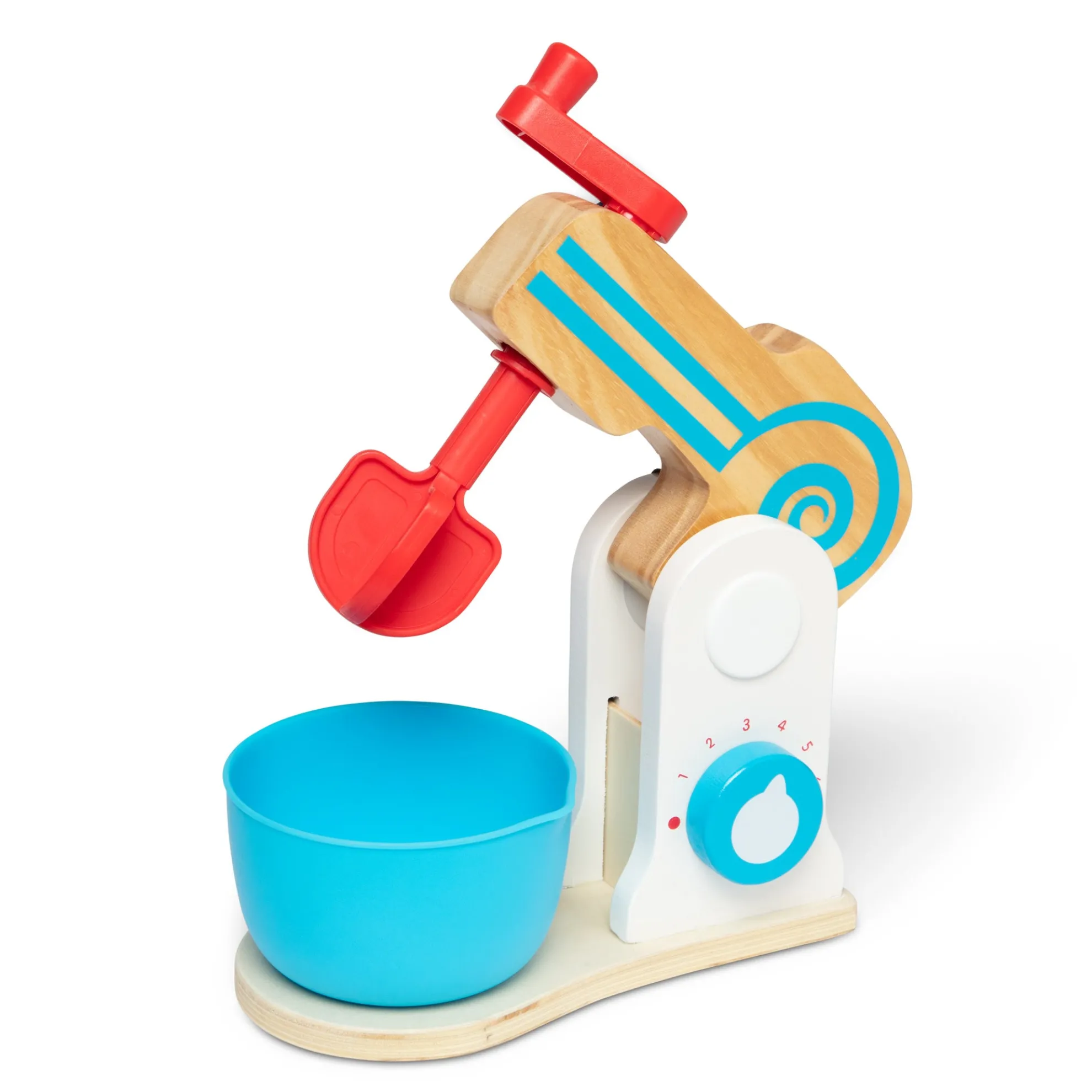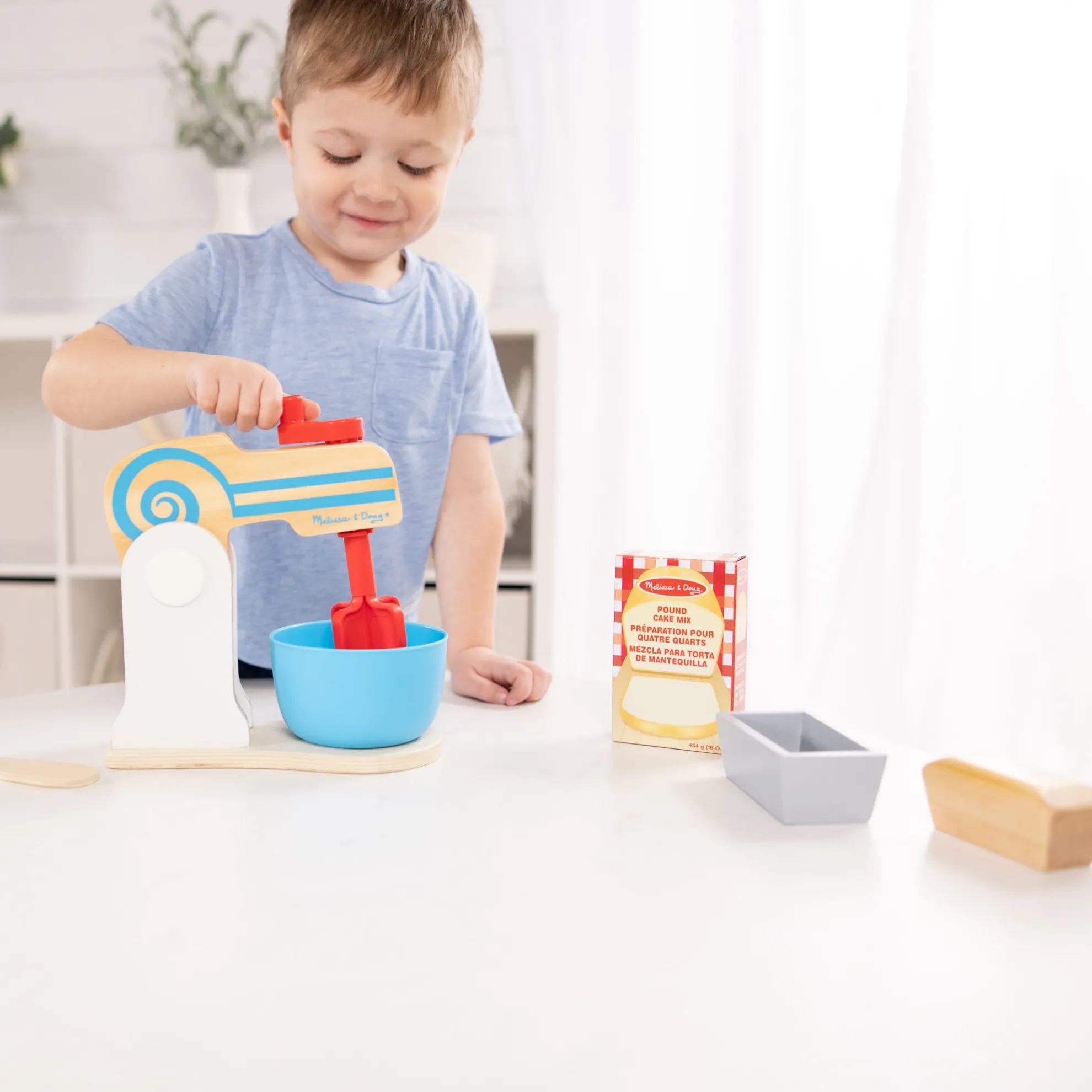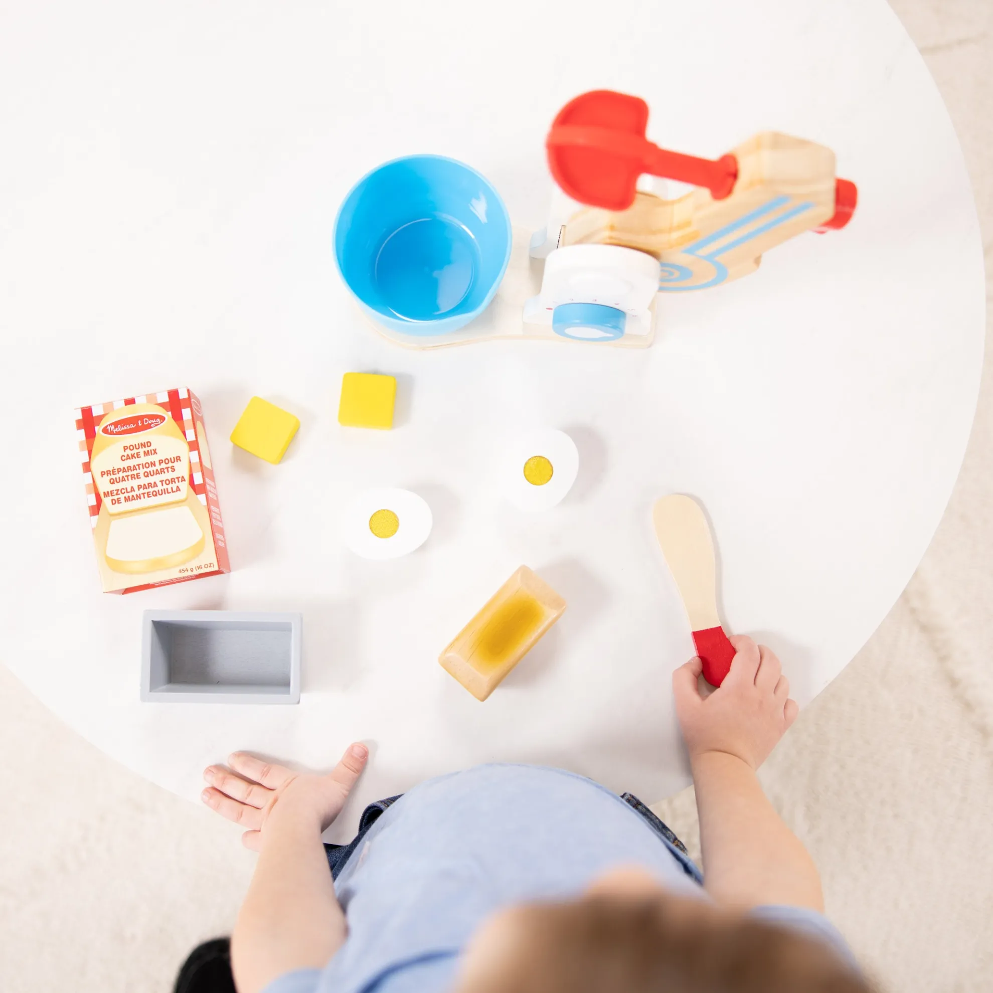 - Includes mixer, bowl, sliceable wooden egg and butter, loaf, cake pan, pretend cake mix box, cake pan, wooden knife