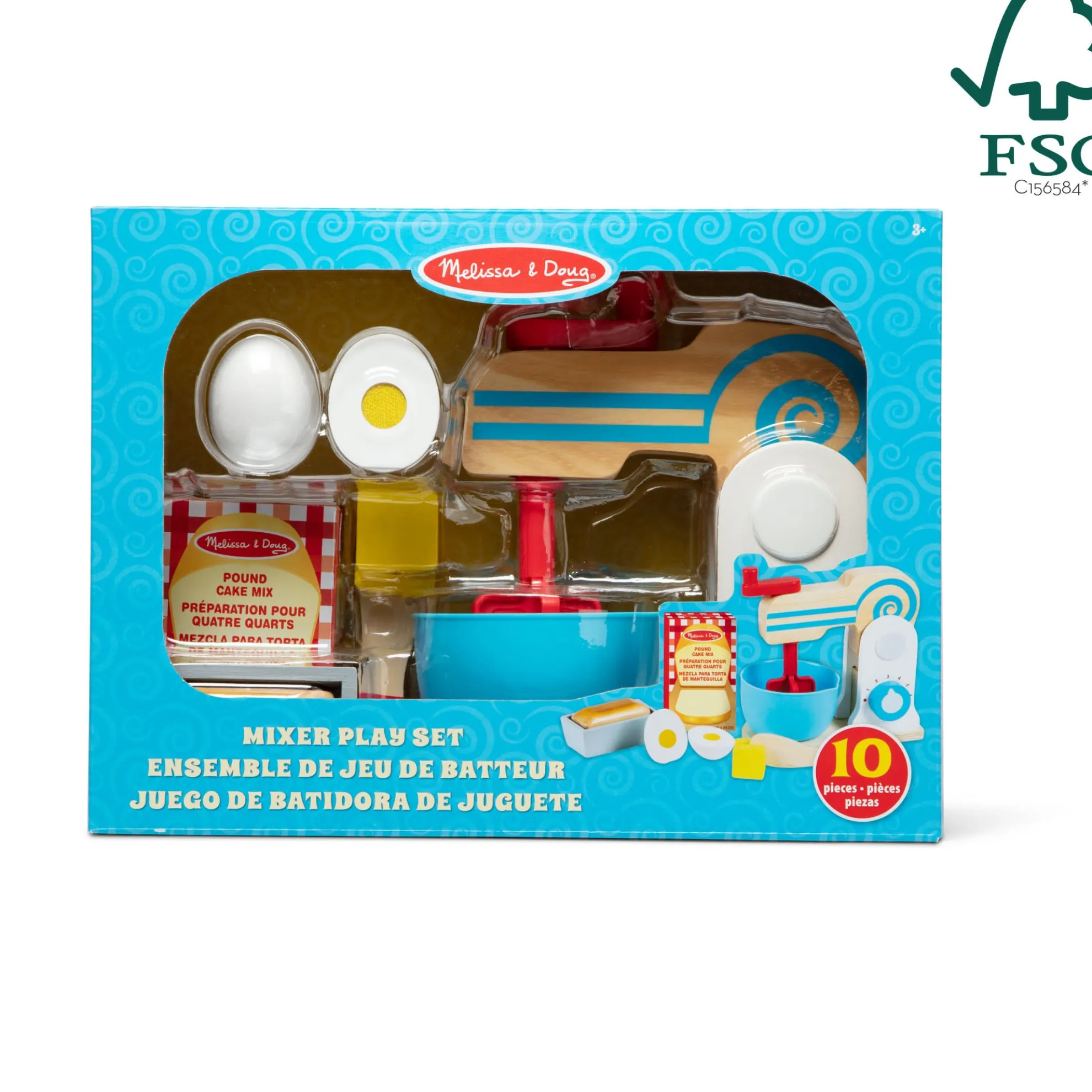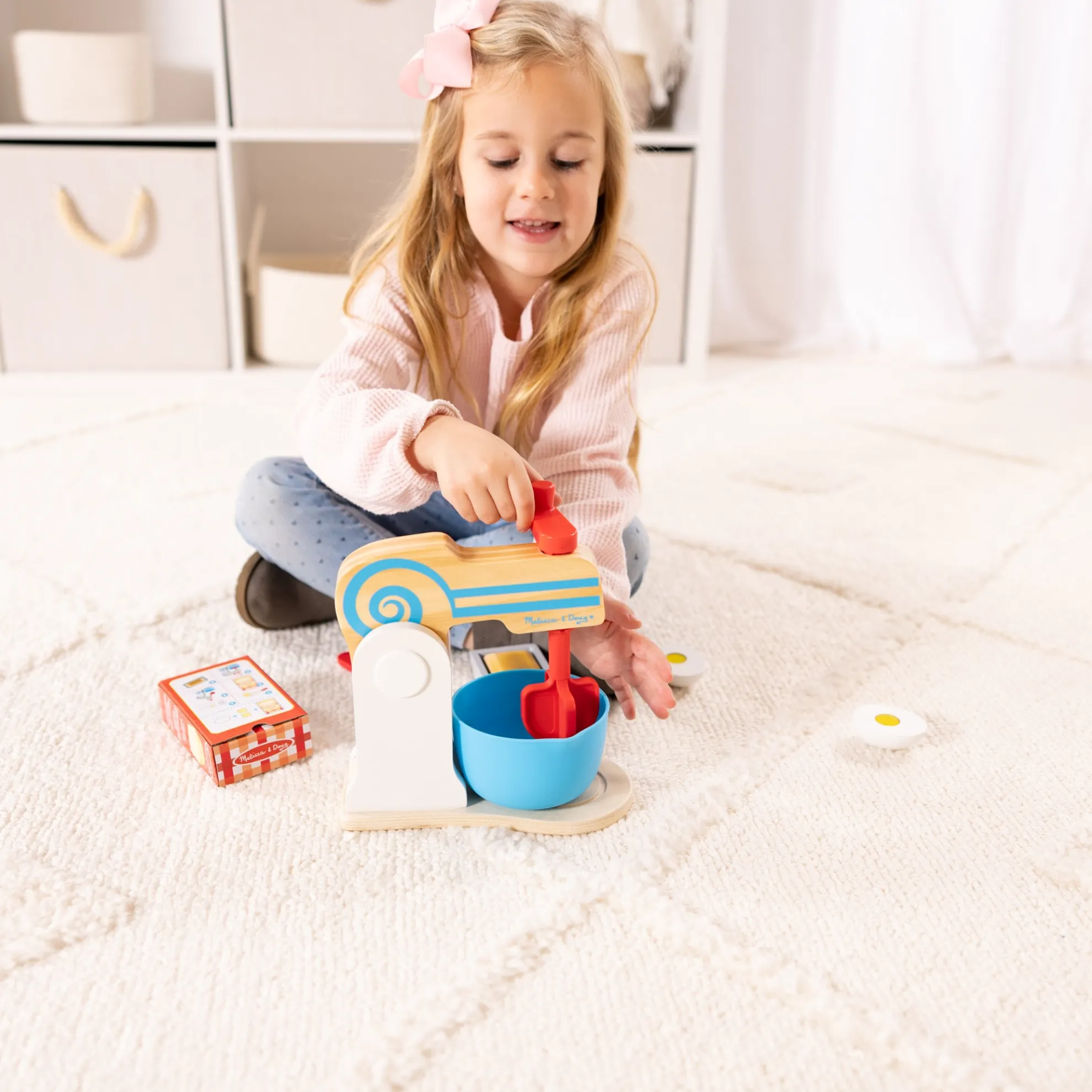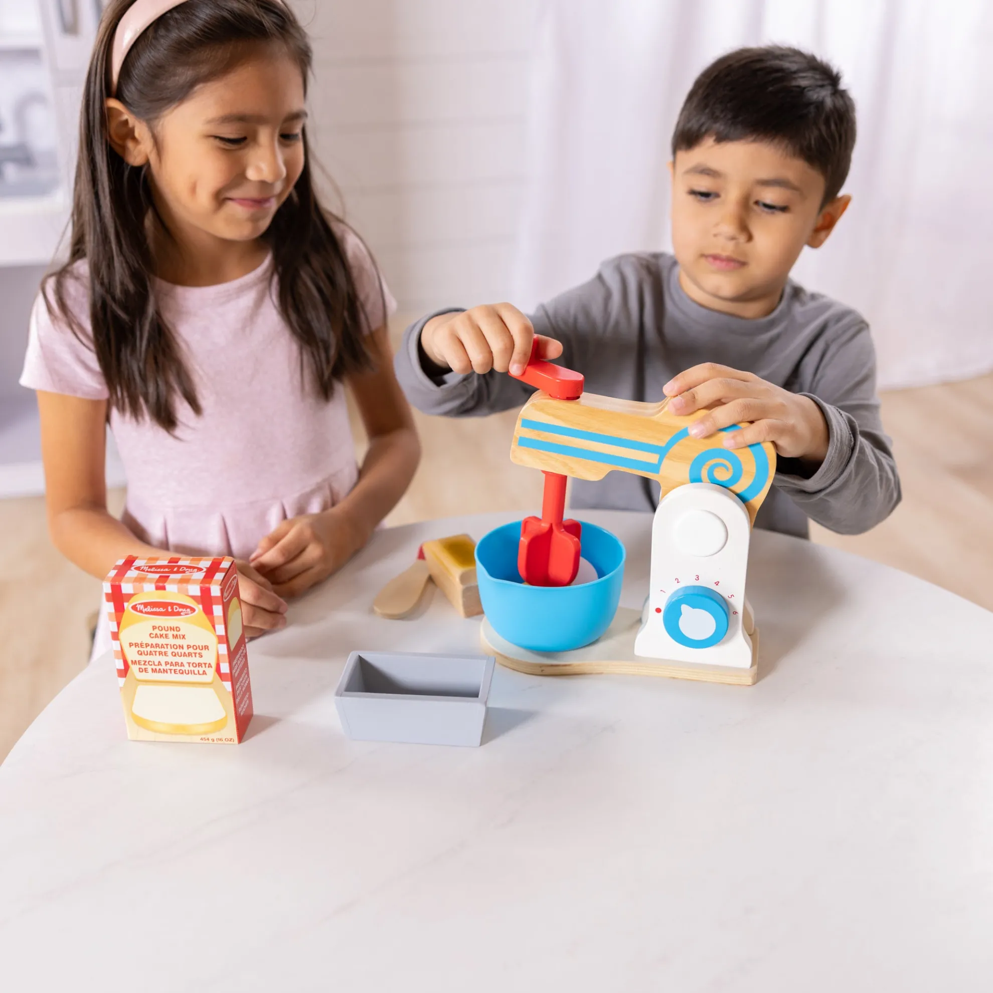 - Includes mixer, bowl, sliceable wooden egg and butter, loaf, cake pan, pretend cake mix box, cake pan, wooden knife