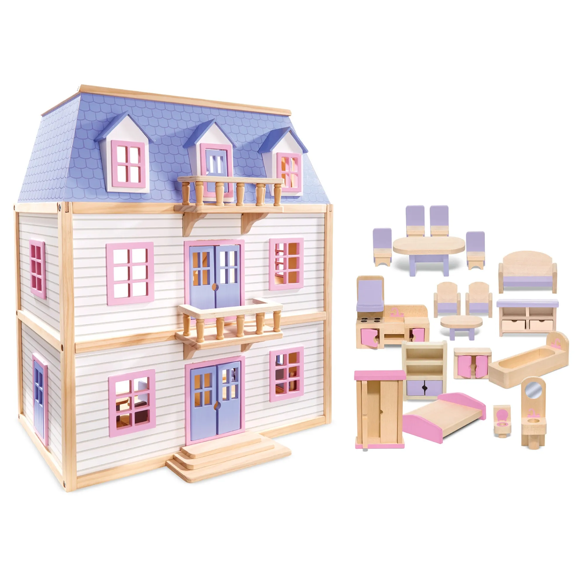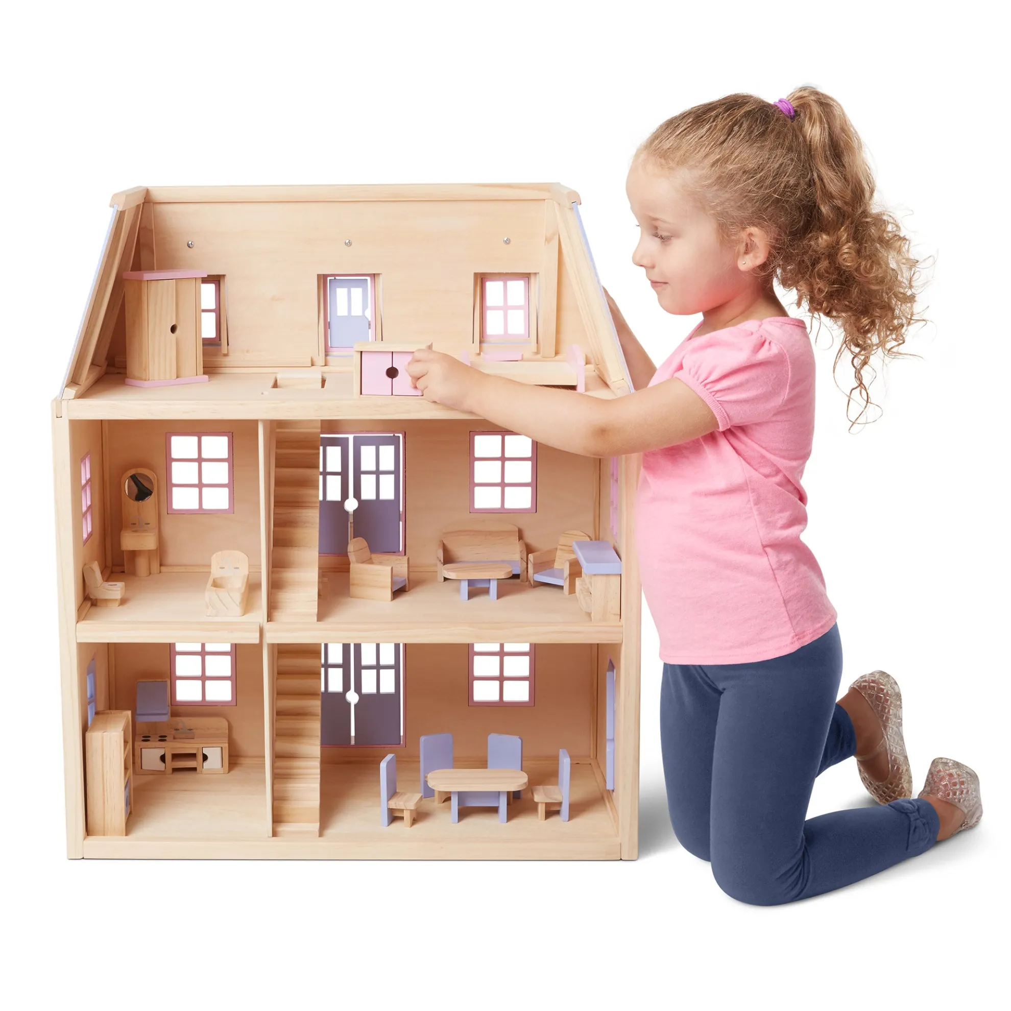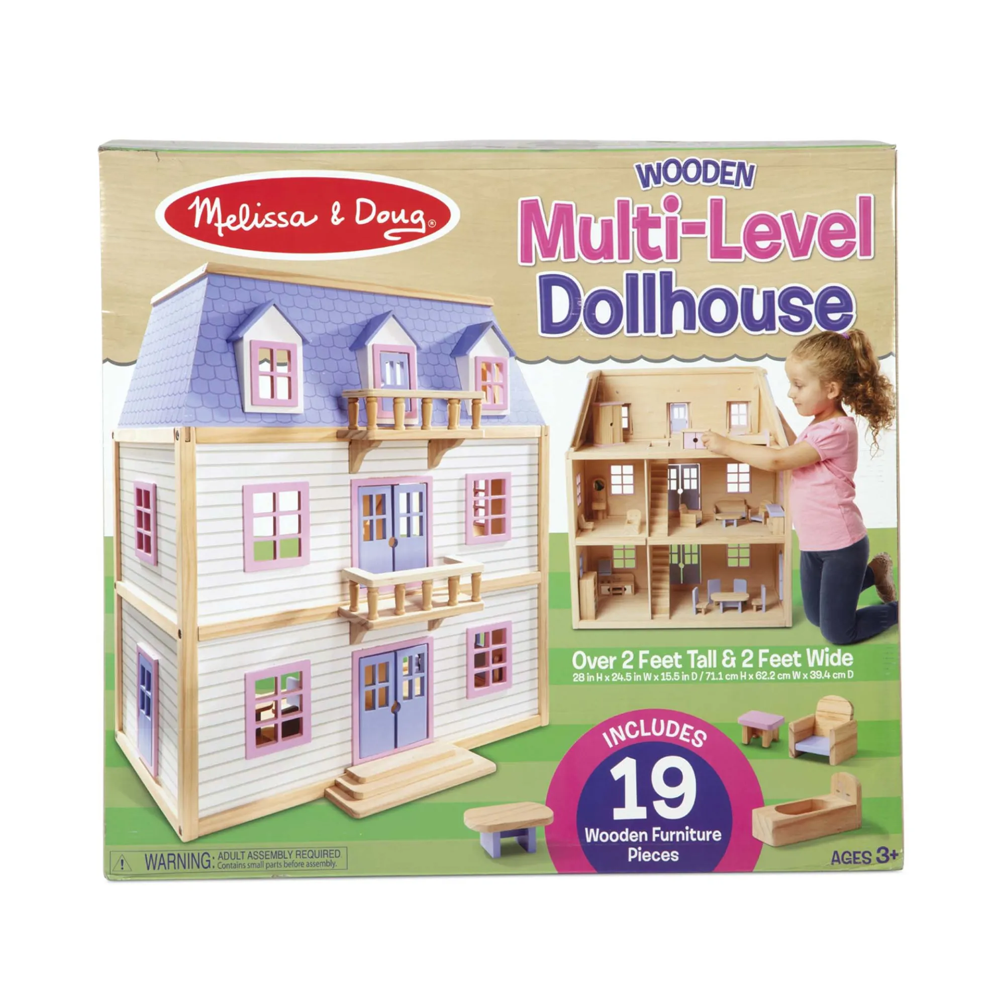 - Sturdy, spacious, and versatile wooden three-level, five room dollhouse with 19 pieces of wooden doll furniture, perfect for growing kids