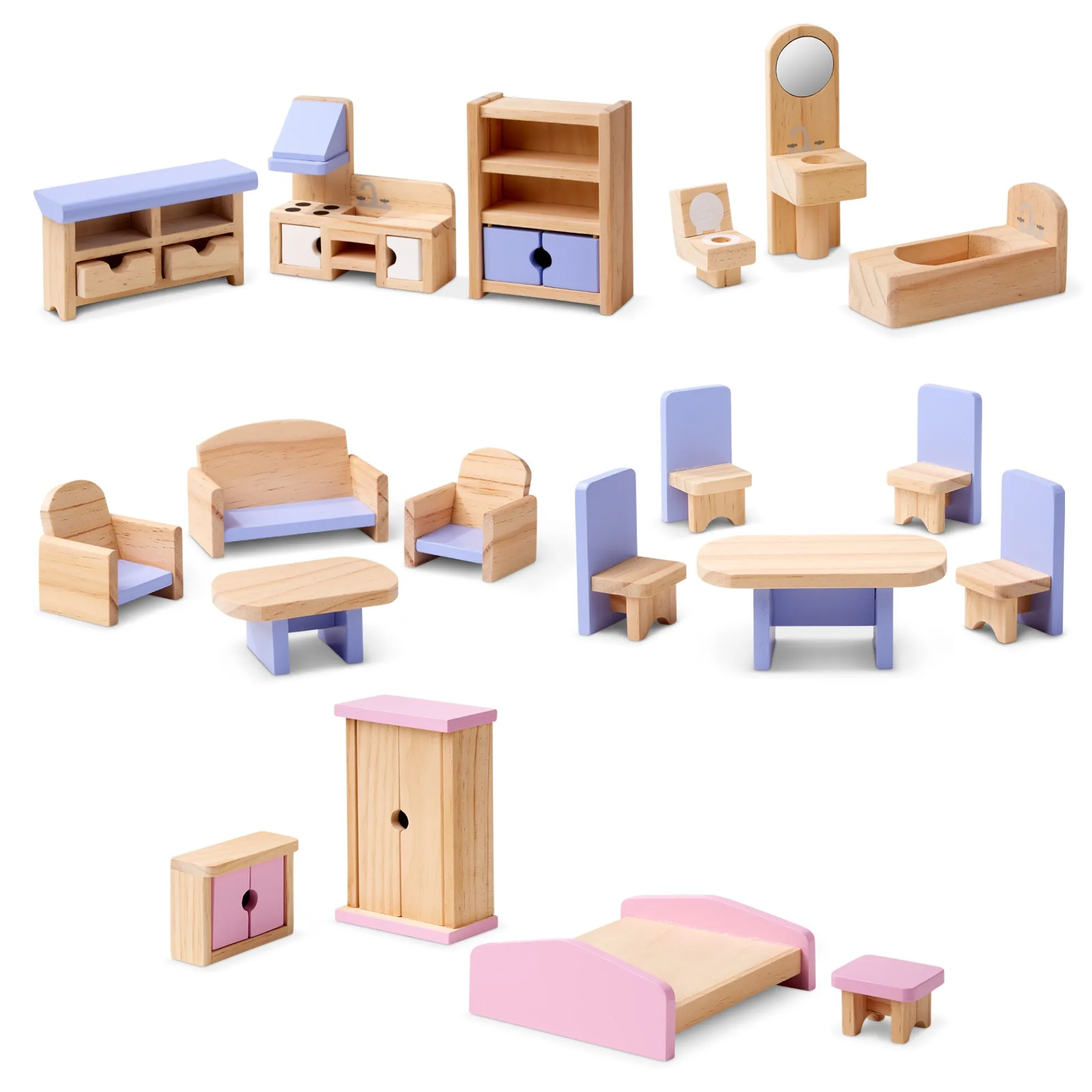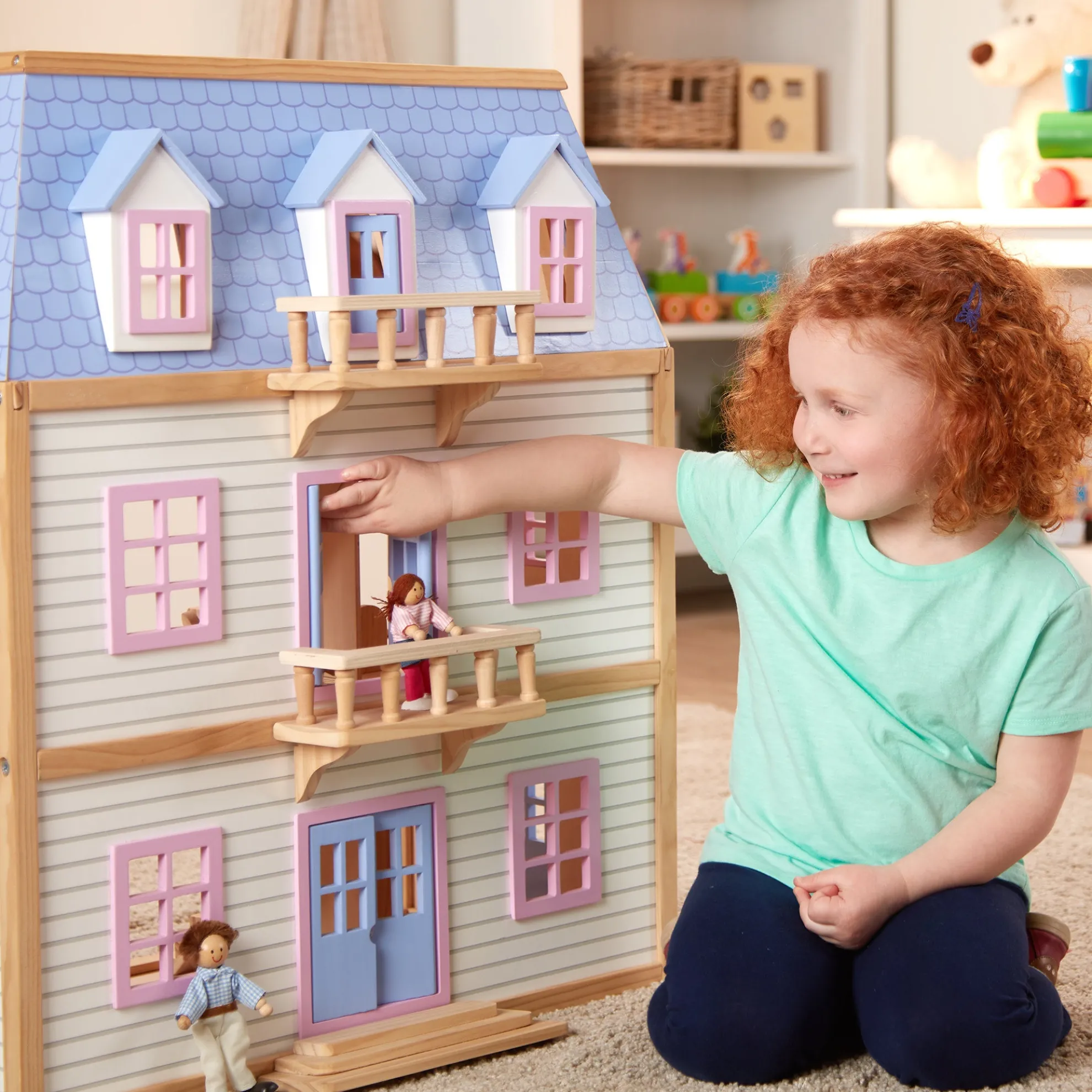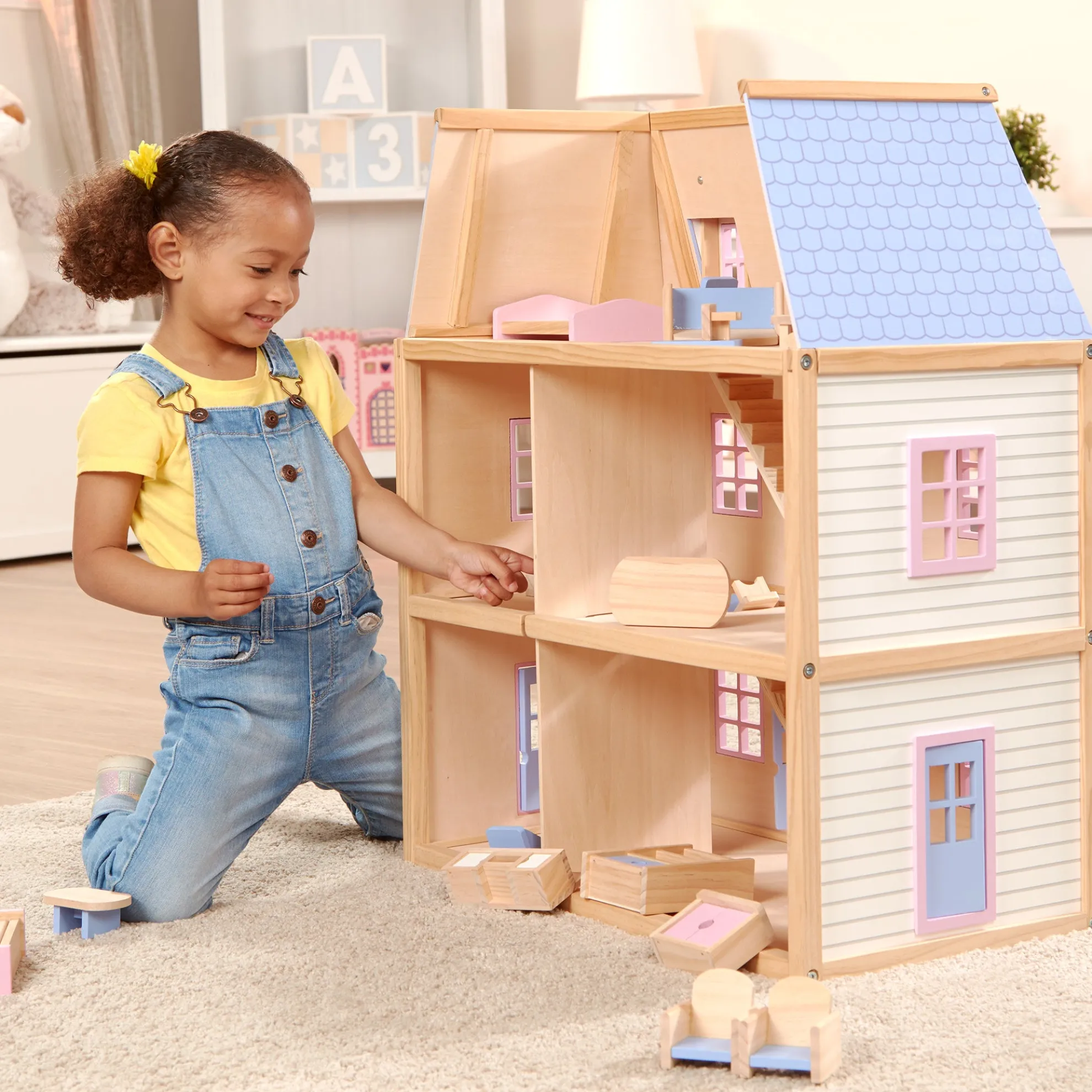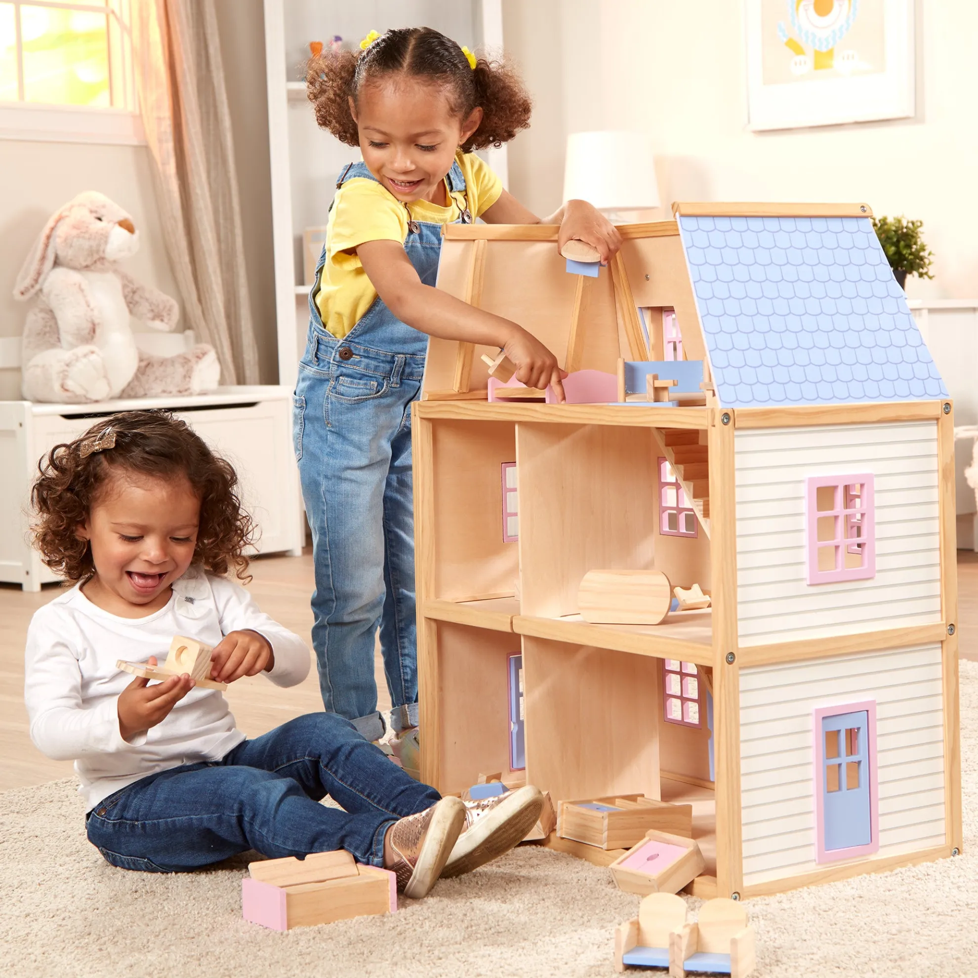 - Sturdy, spacious, and versatile wooden three-level, five room dollhouse with 19 pieces of wooden doll furniture, perfect for growing kids