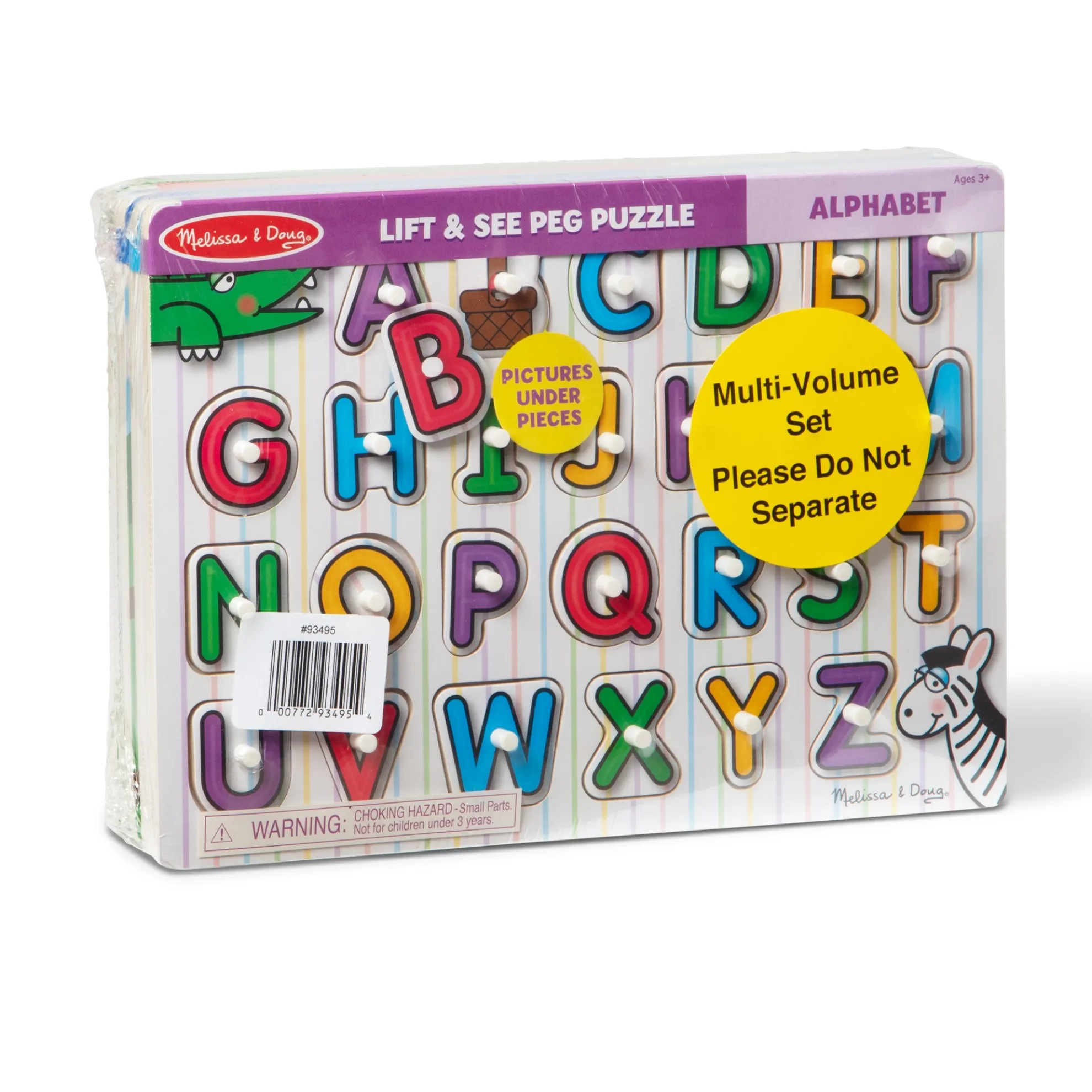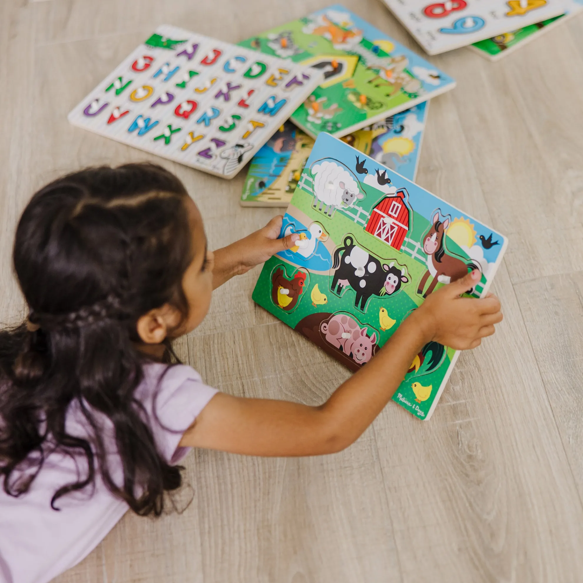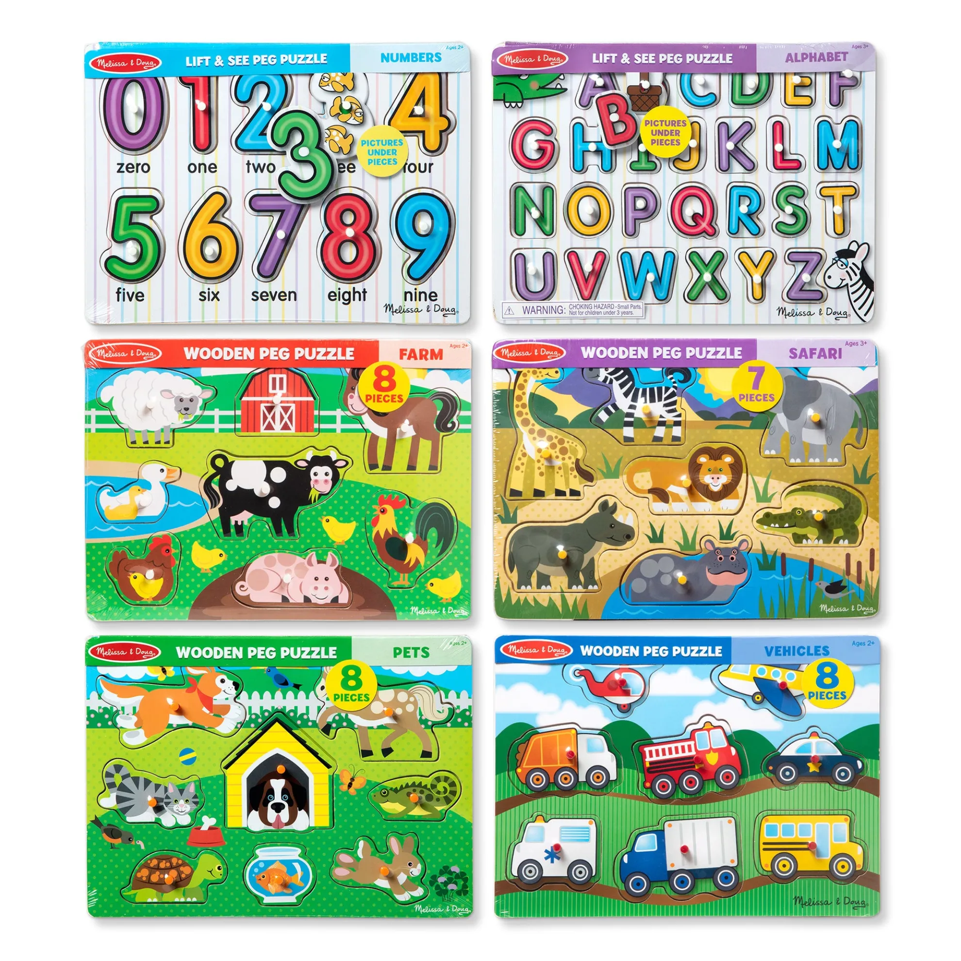 Grab on to this exciting assortment of early-learning, super fun wooden peg puzzles. The set of six includes See-Inside Numbers, See-Inside Alphabet, Farm, Pets, Safari, and Vehicles. Easy-grasp pegs and pictures under the sturdy wooden pieces help kids solve these simple seven- to 26-piece puzzles, which are a great way to practice hand-eye, fine motor and memory skills.