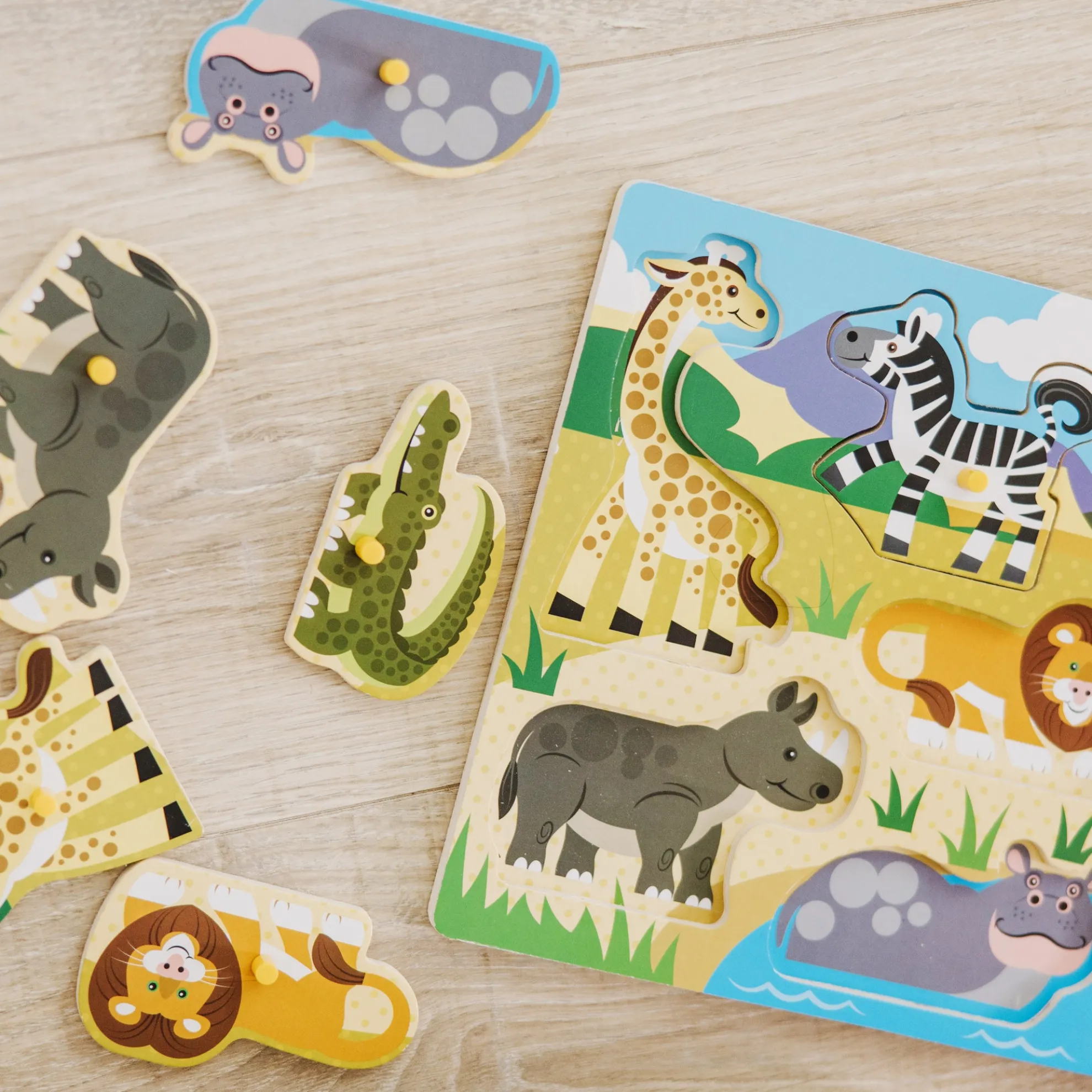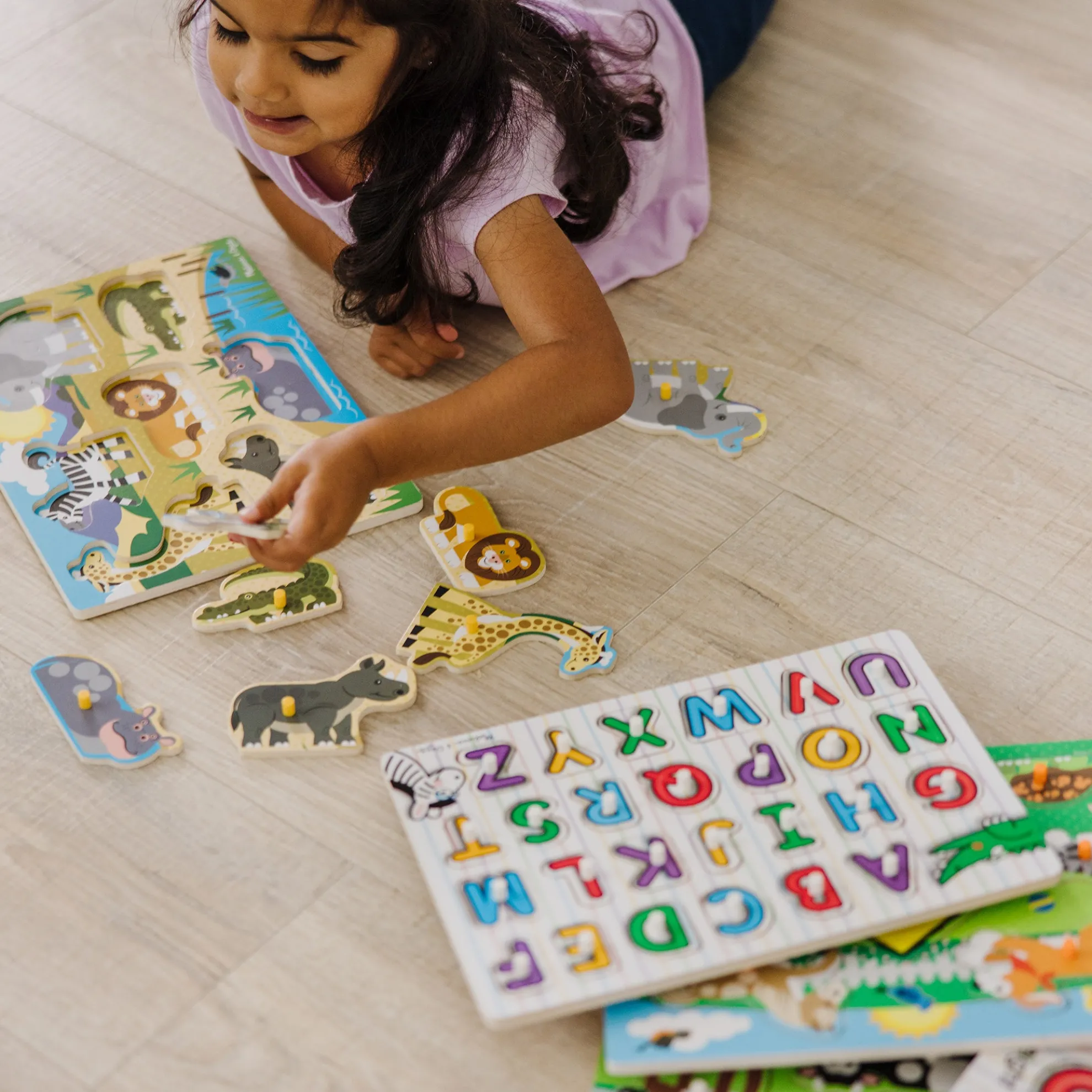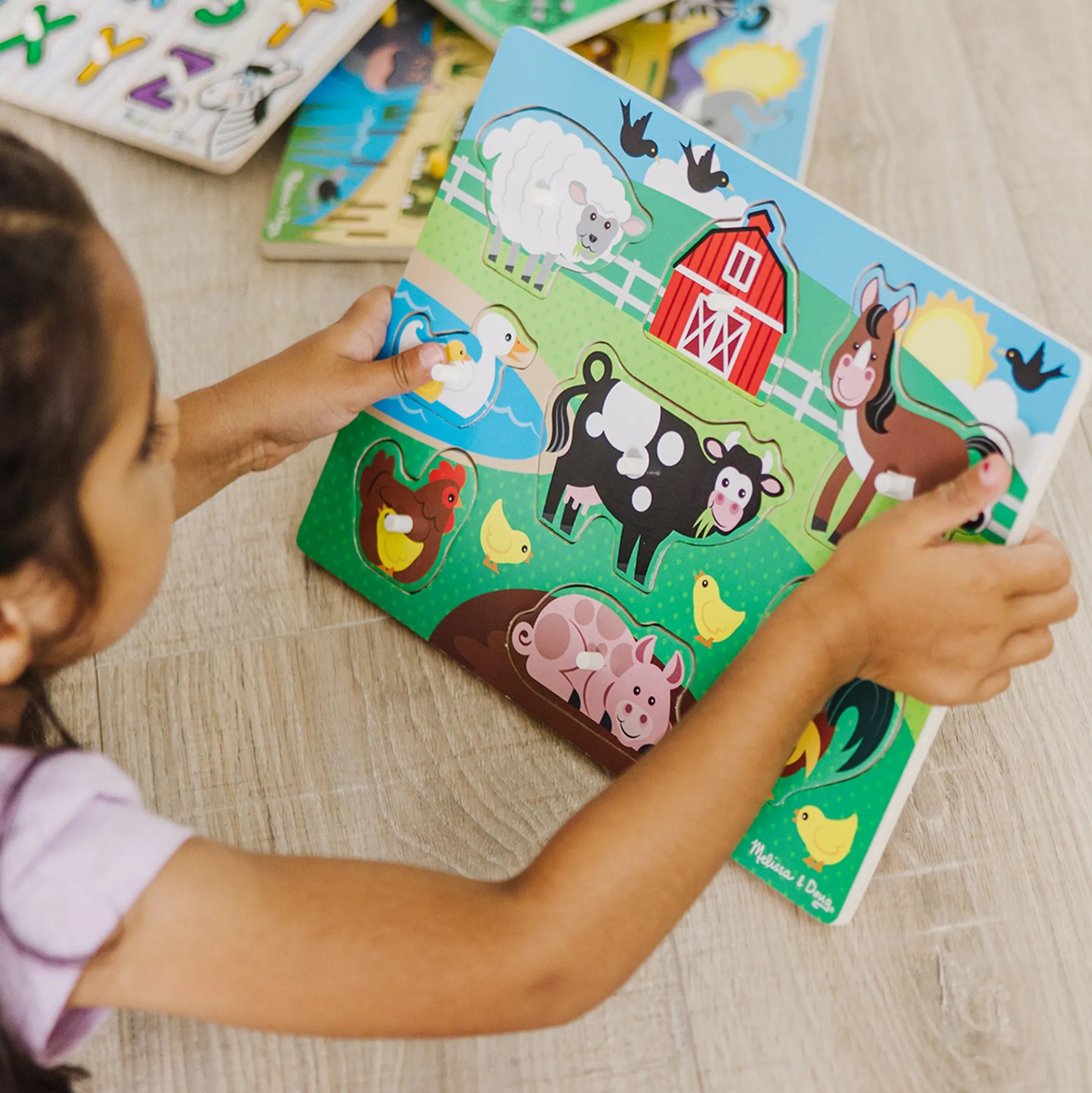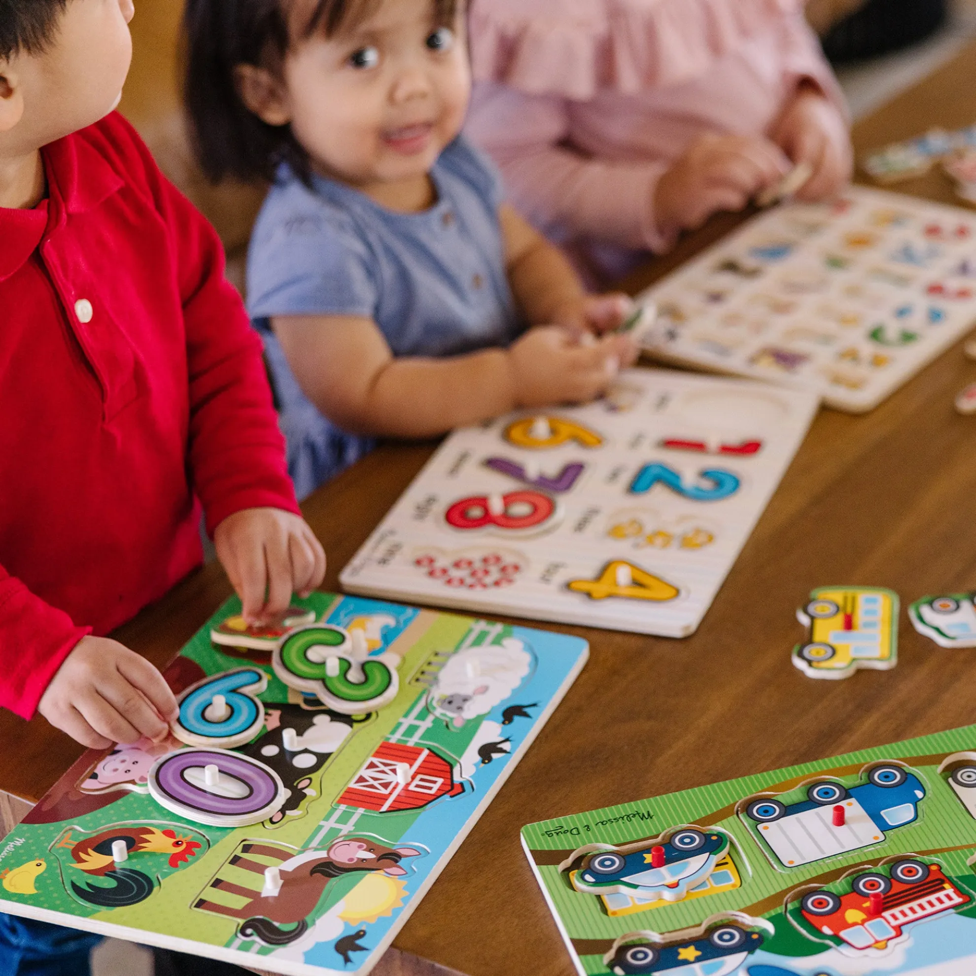 Grab on to this exciting assortment of early-learning, super fun wooden peg puzzles. The set of six includes See-Inside Numbers, See-Inside Alphabet, Farm, Pets, Safari, and Vehicles. Easy-grasp pegs and pictures under the sturdy wooden pieces help kids solve these simple seven- to 26-piece puzzles, which are a great way to practice hand-eye, fine motor and memory skills.