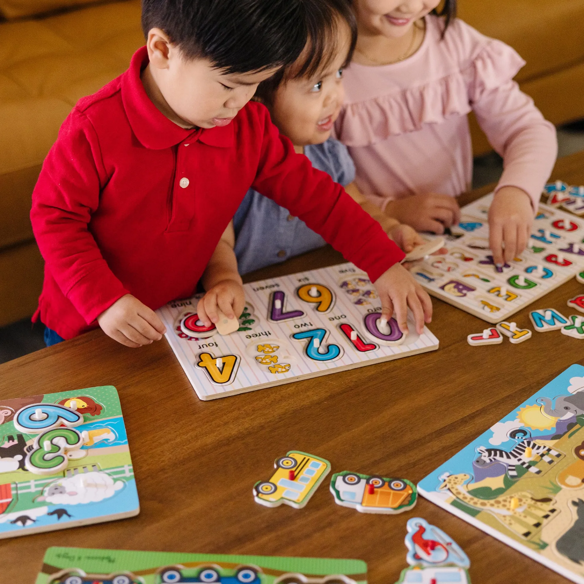 - Puzzles include 10-piece See-Inside Numbers, 26-piece See-Inside Alphabet, 8-piece Farm, 8-piece Pets, 7-piece Safari, 8-piece Vehicles