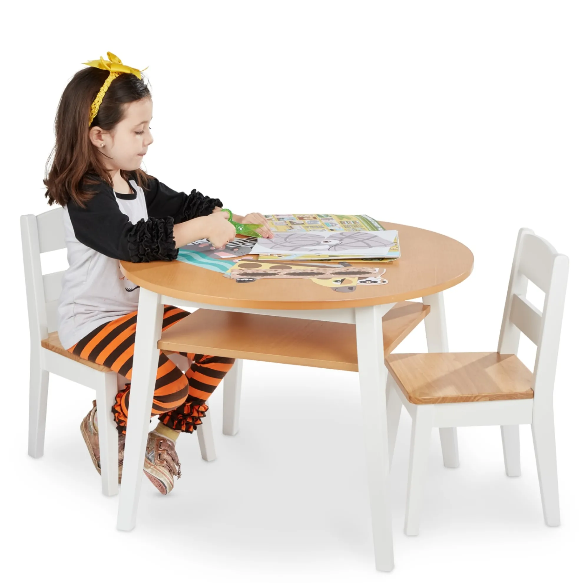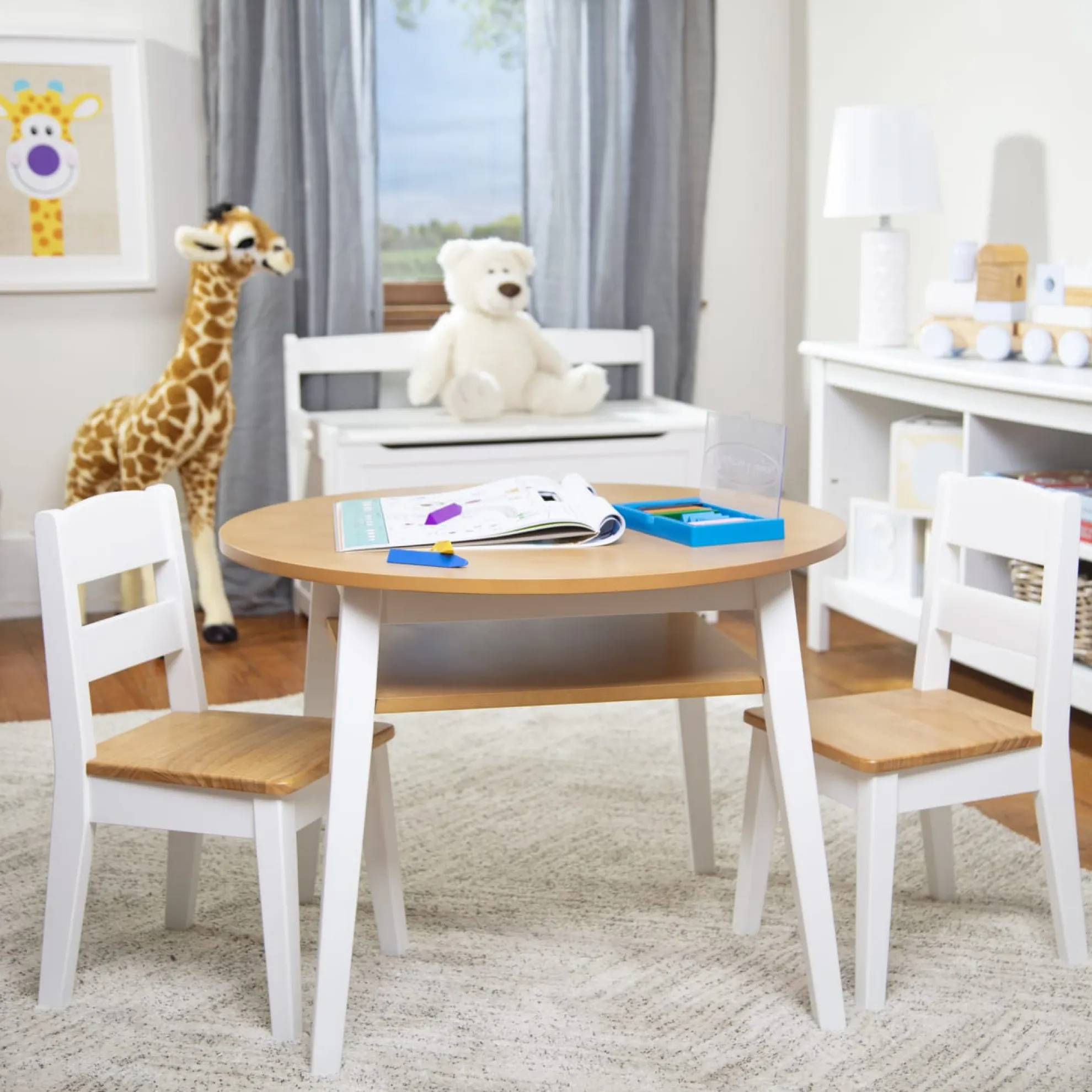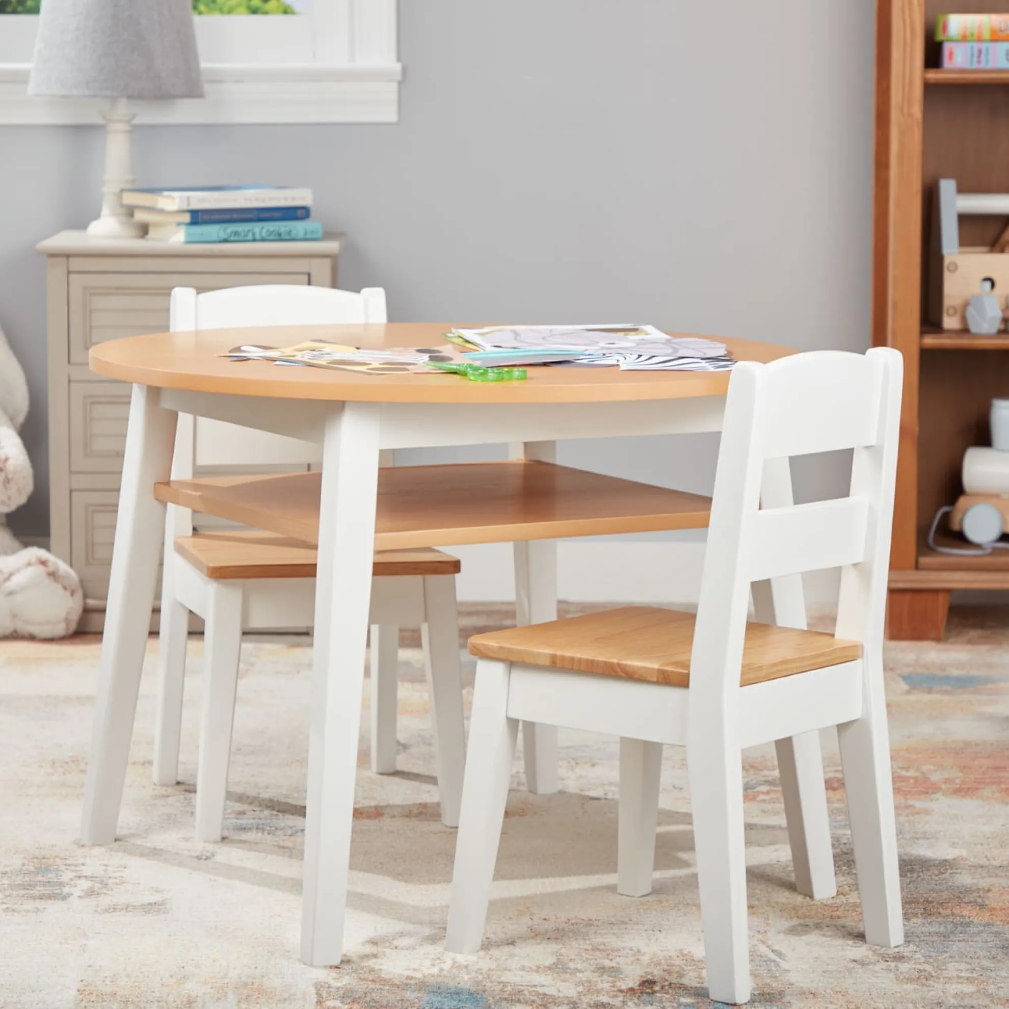 Create the perfect play space for kids with this beautifully designed round wooden table and chair pair, sized just right for kids three to eight years old, but strong enough to hold most grownups, too! The two-toned finish fits with any home decor and wipes clean to stay looking crisp and clean (tabletop and chair seats are a light natural wood finish; table and chair legs and seat backs are bright white). A square shelf under the round tabletop is great for storing a child’s puzzles, games, arts and crafts supplies, and more for quick and easy cleanup. The table and chairs are easy to put together with just a Phillips-head screwdriver (not included), and incredibly sturdy once assembled. Our testing goes above and beyond the industry standard to ensure our wooden furniture’s stability — these chairs received a weight rating of 100 pounds. The chairs have an 11.25-inch seat height and reinforced, tip-resistant design; the 28.5-inch diameter table height is 21 inches.
