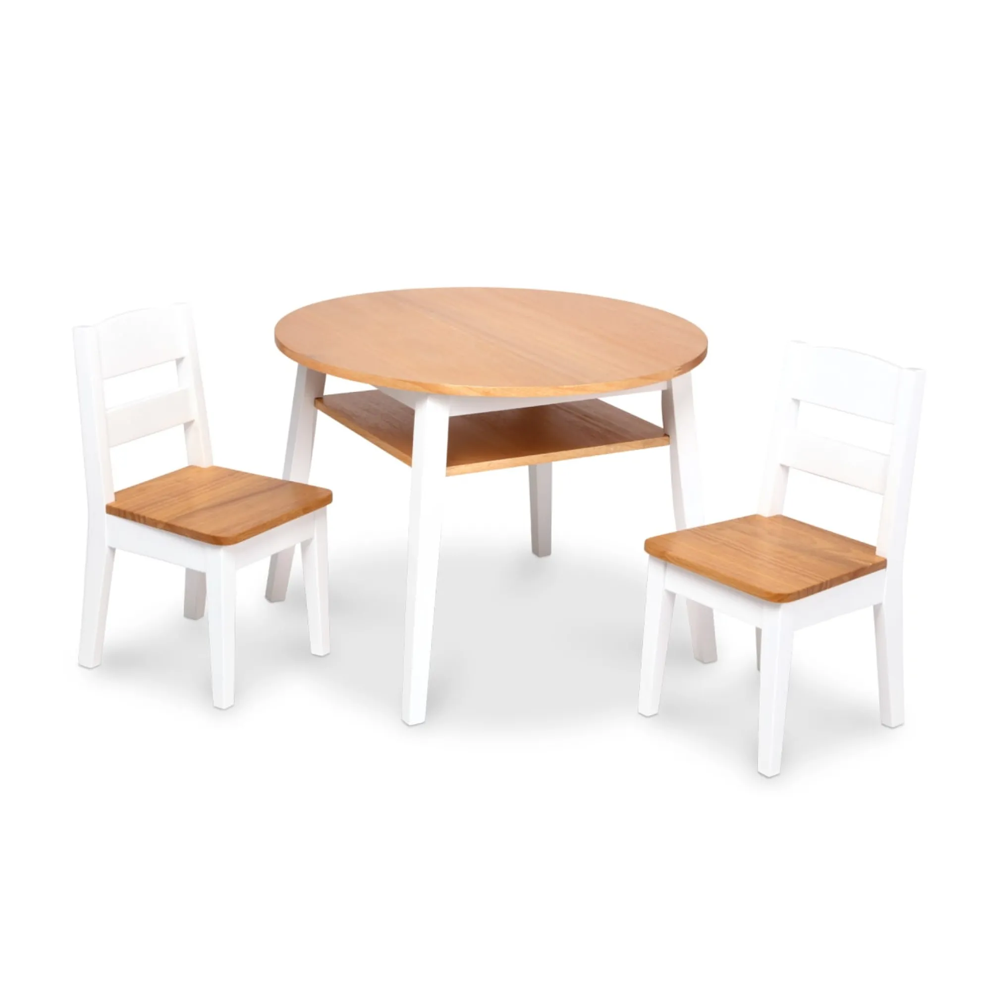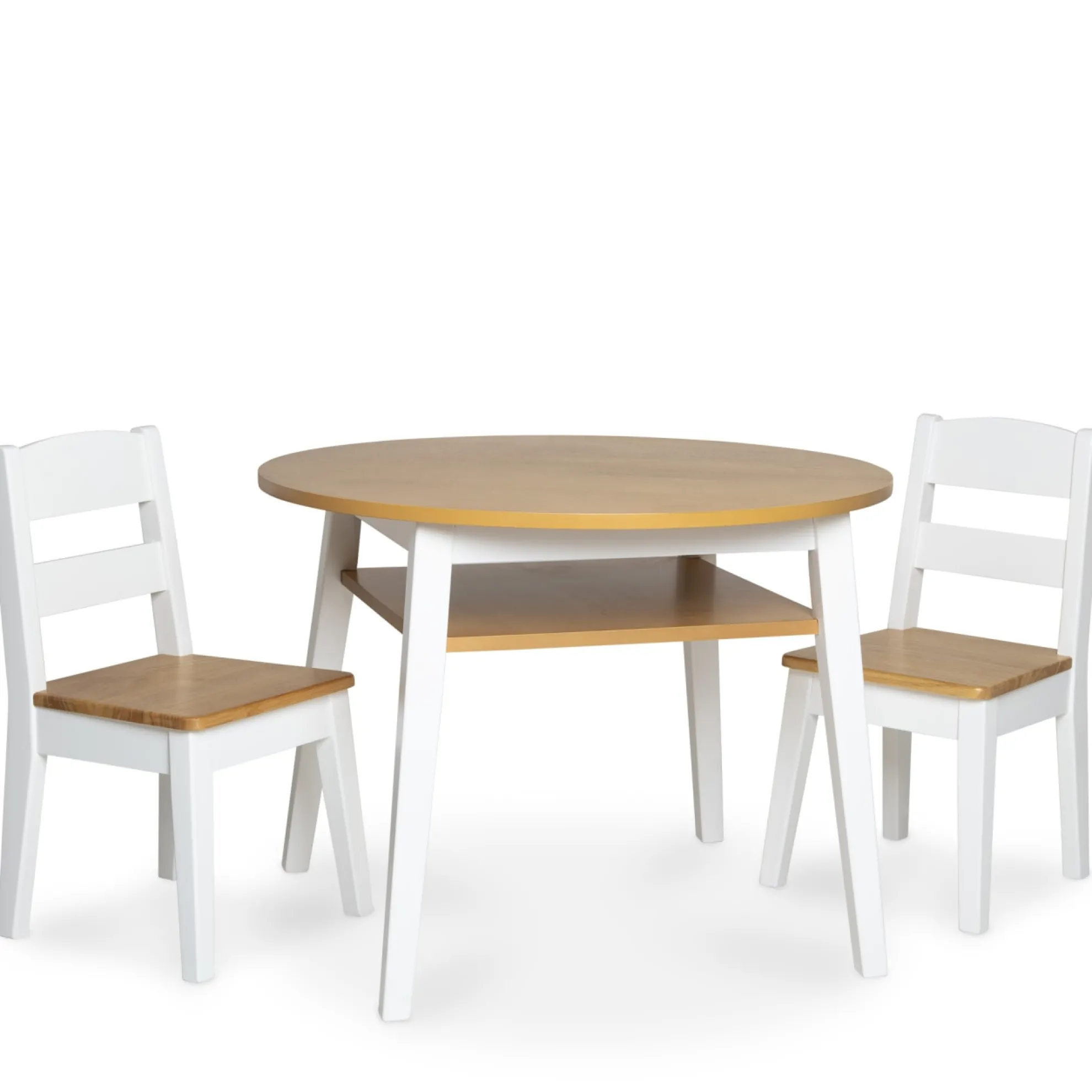 - Easy-to-assemble 2-tone sturdy wooden round table and 2 matching wooden chairs sized for kids