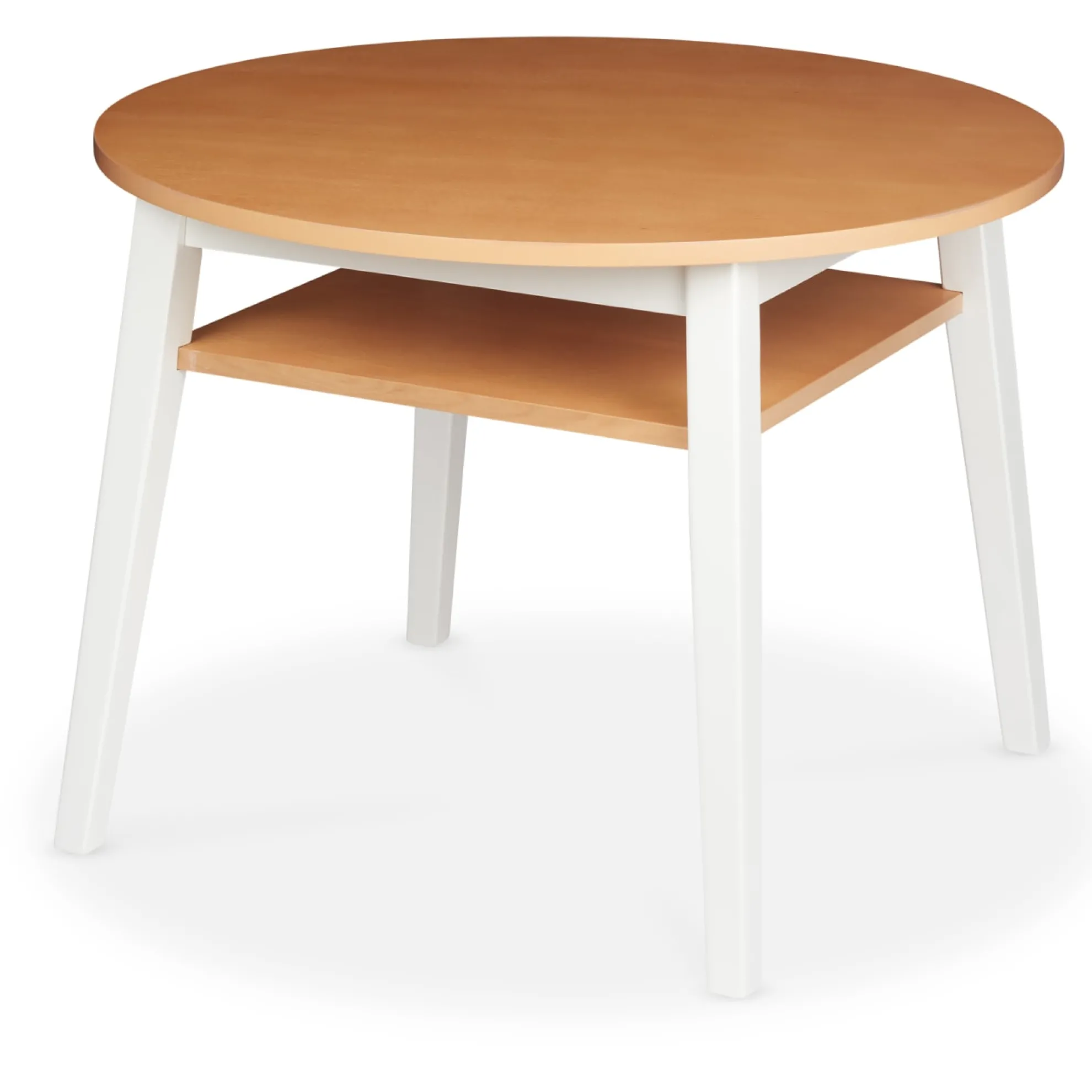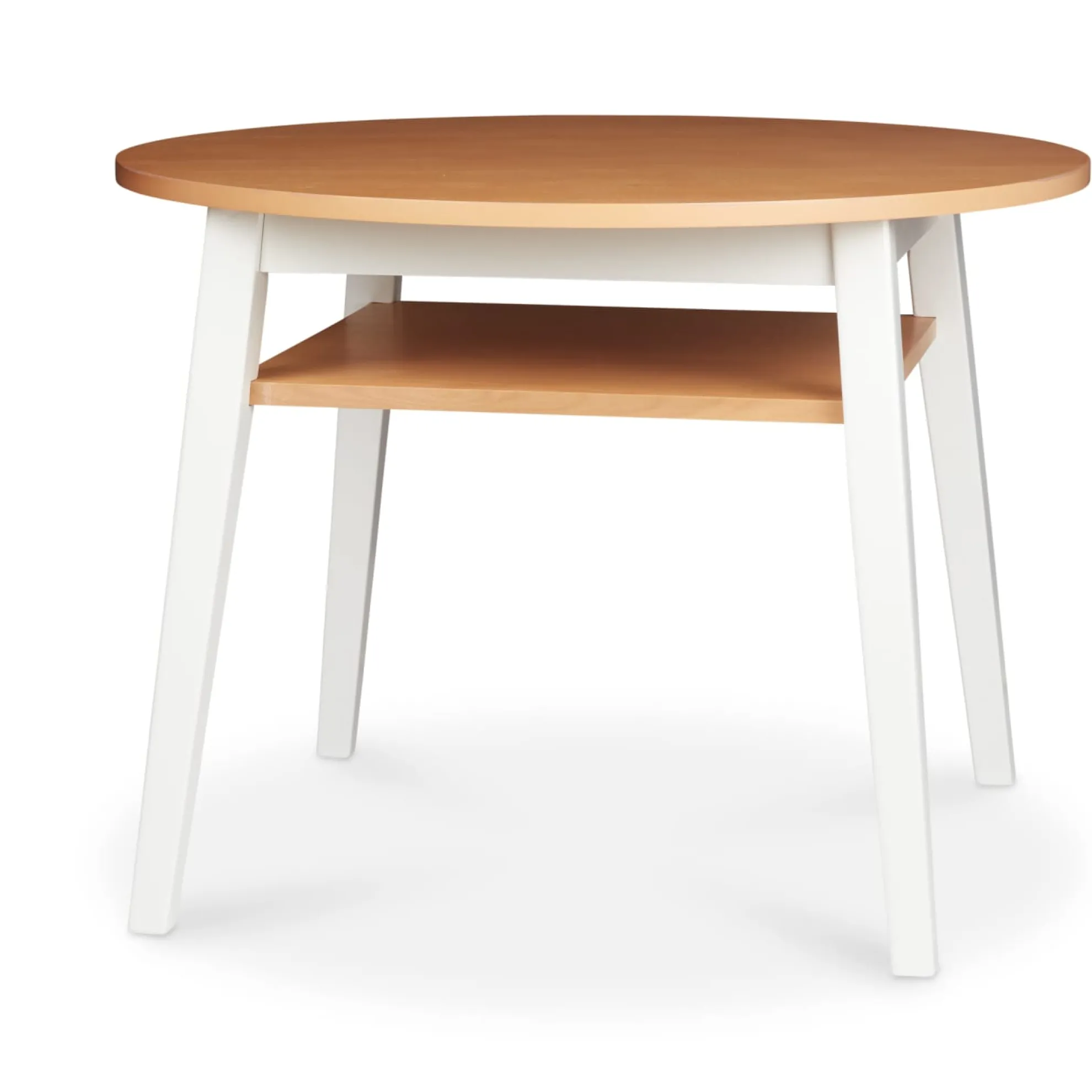- Round tabletop and square shelf underneath in natural wood finish; white legs. Natural wood finish on seats; bright white legs and seat backs