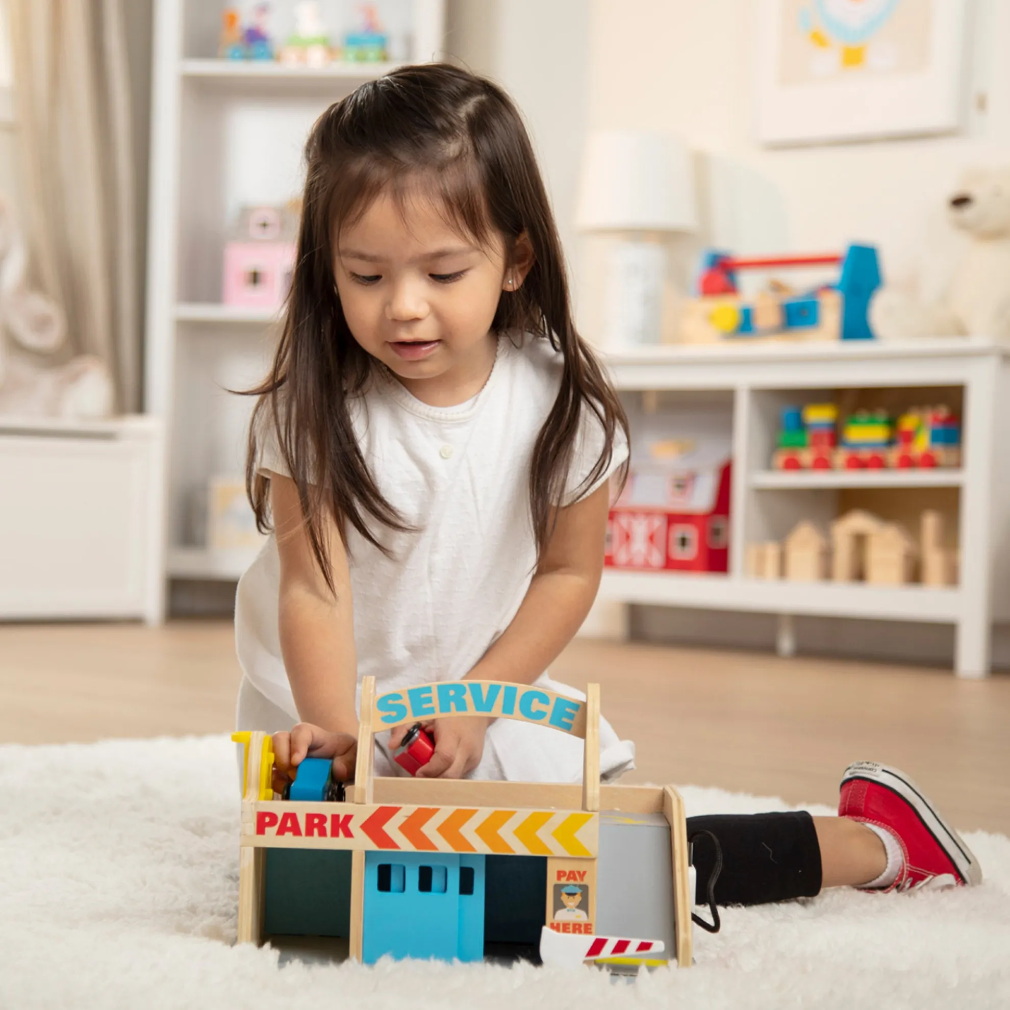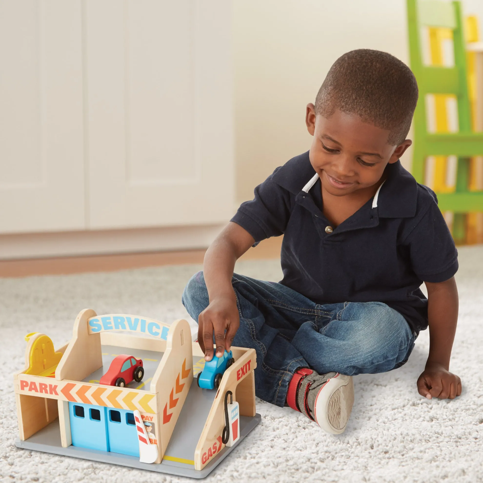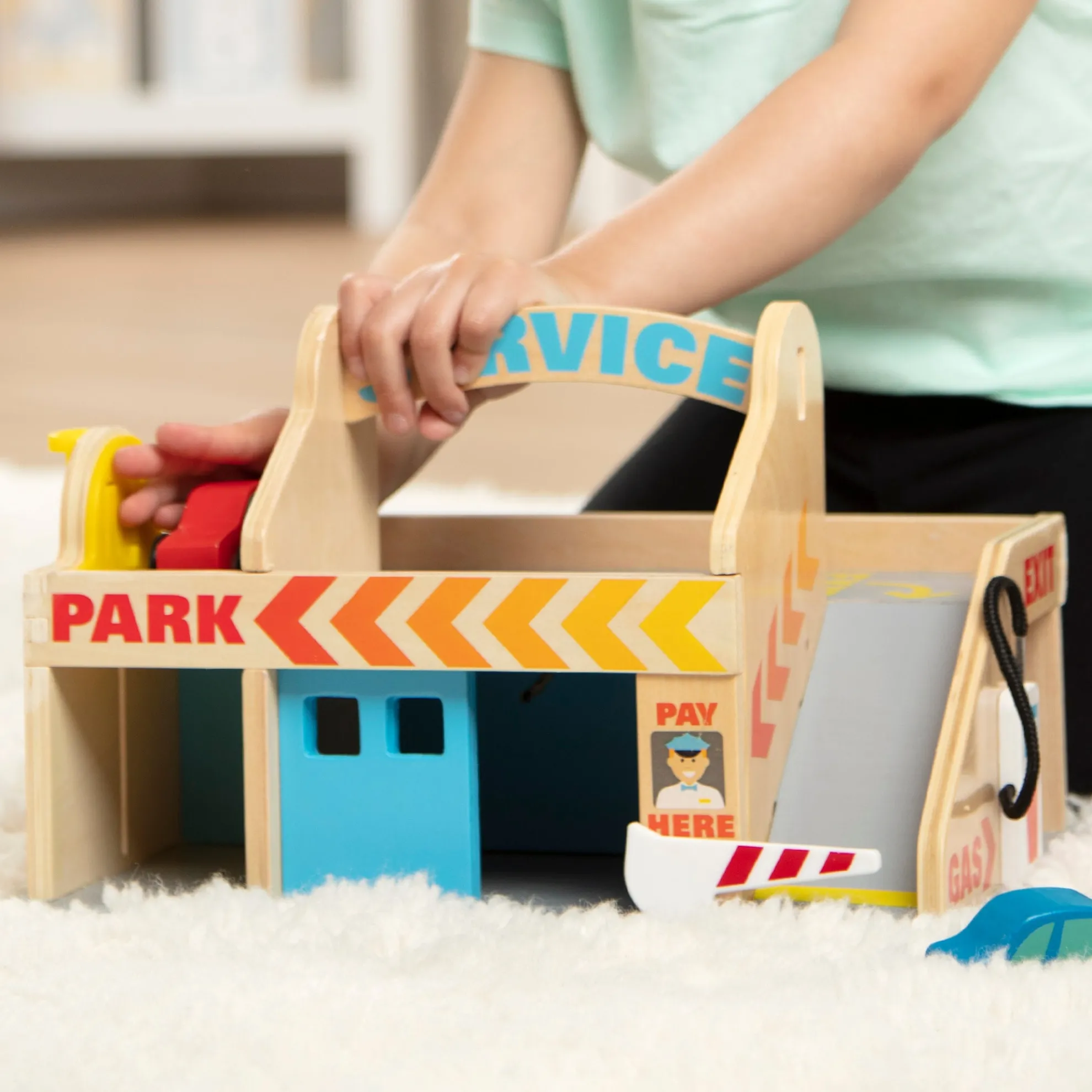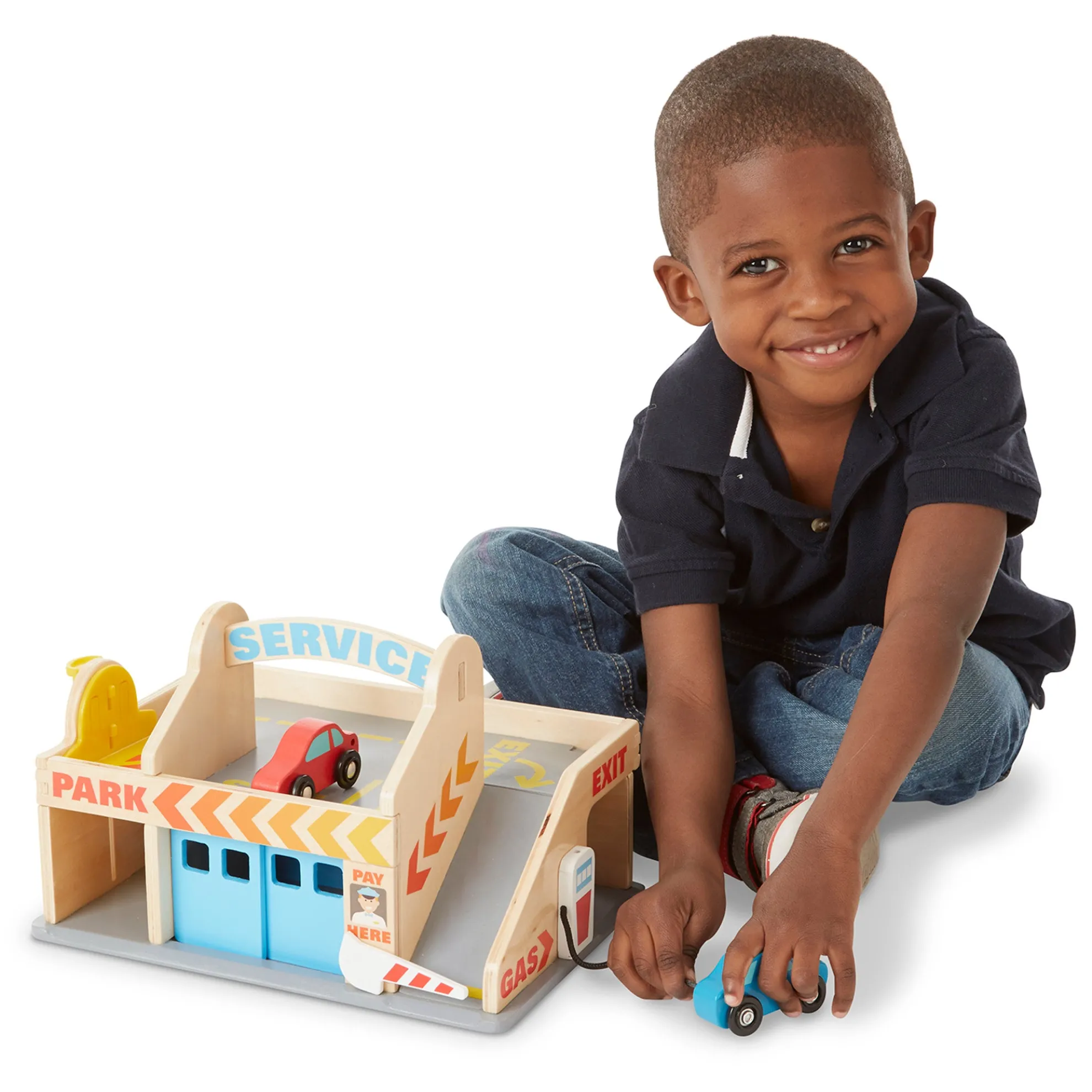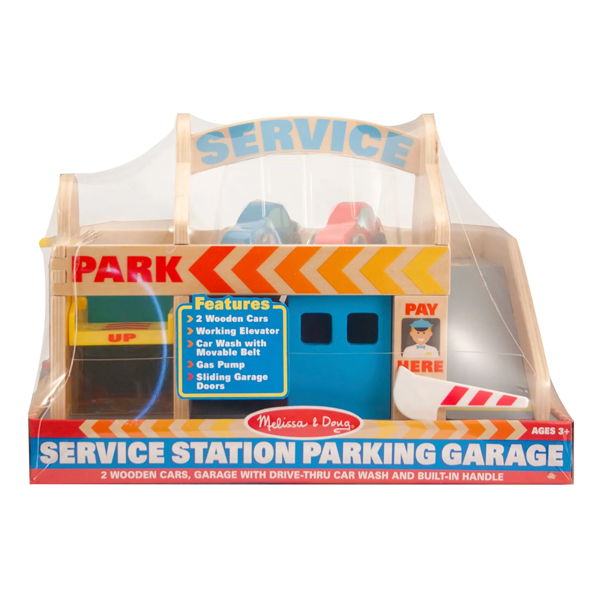 - Includes car wash with roller and drying strips, numbered parking area, gas pump, garage with doors, elevator, and 2 painted wooden cars