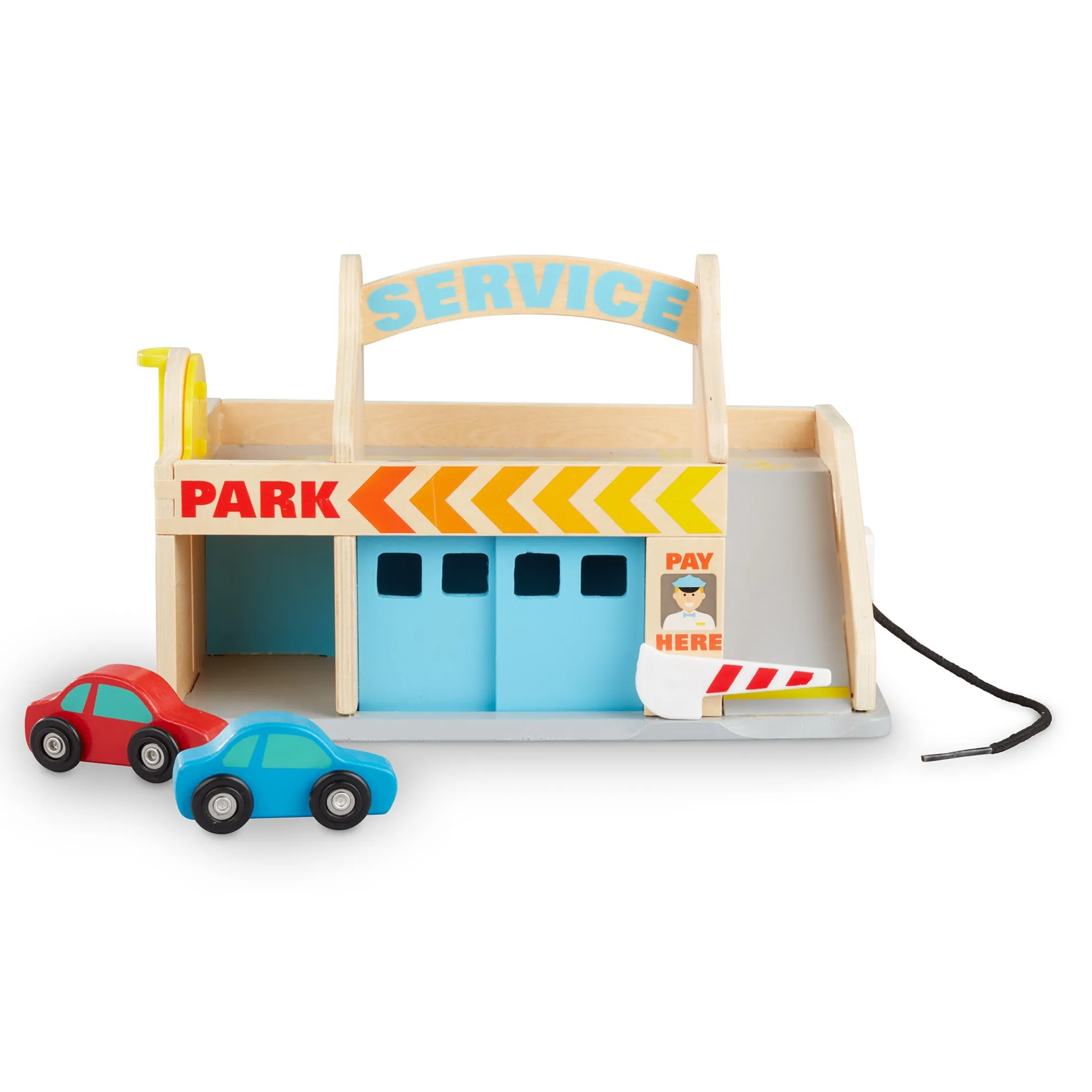 This all-in-one service station is truly full service! Park the two included wooden cars in the parking garage with movable elevator or pull them through the car wash. Don’t forget to fill up at the gas pump before getting the cars serviced at the garage with sliding doors. This play set for ages 3+ encourages fine motor skills, hand-eye coordination, problem solving, and imaginative play. The built-in handle makes it the perfect take-along toy!