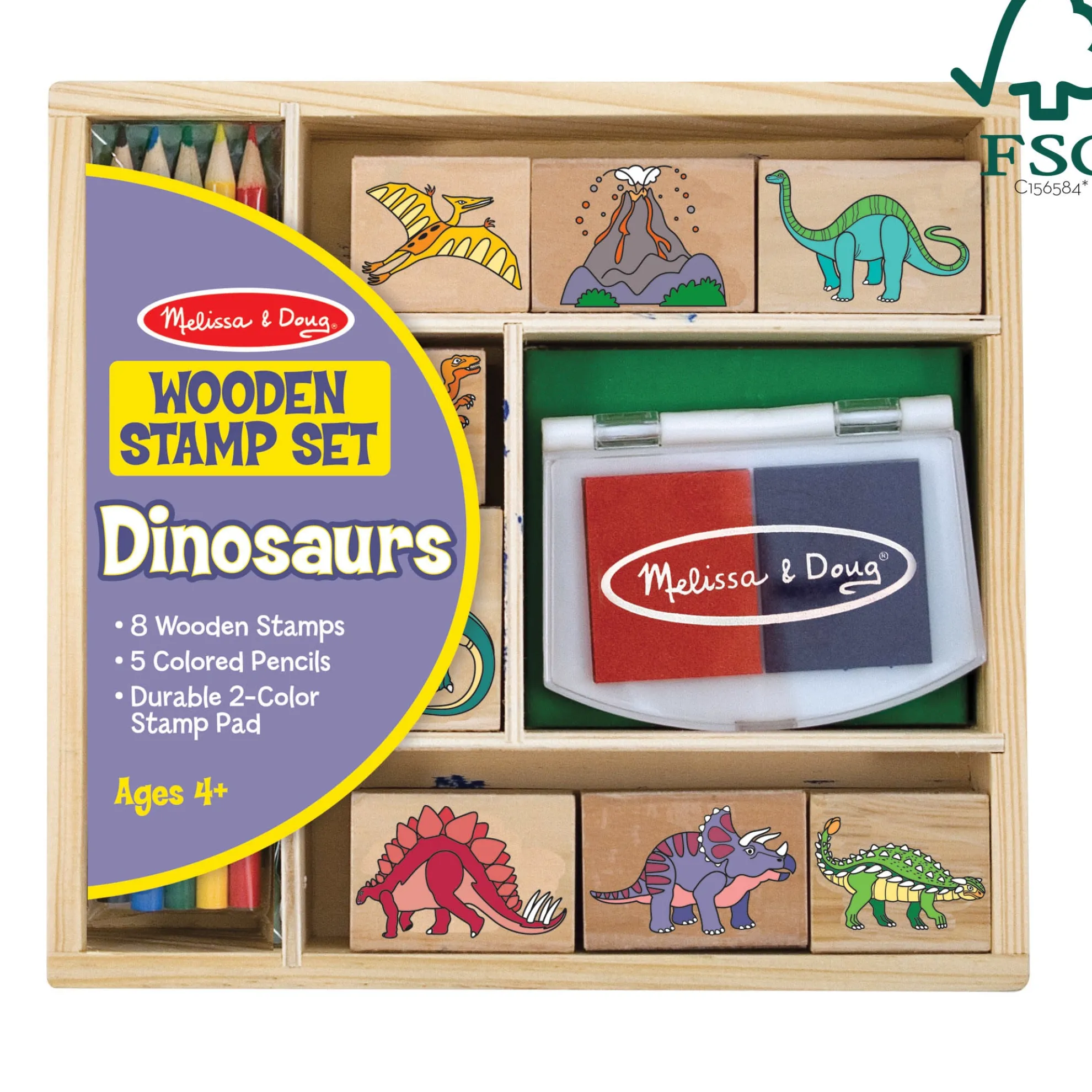 It’s fun to bring prehistoric scenes to life with these eight detailed dino stamps and two-color inkpad–then color them in with the five colored pencils. This well-crafted set is conveniently contained in a sturdy wooden box for storage. A tremendous value! This product is certified by the Forest Stewardship Council. FSC certification ensures that products come from responsibly managed forests that provide environmental, social, and economic benefits, and that forests are protected for future generations. Please note that FSC certification applies to new inventory only (FSC C156584).