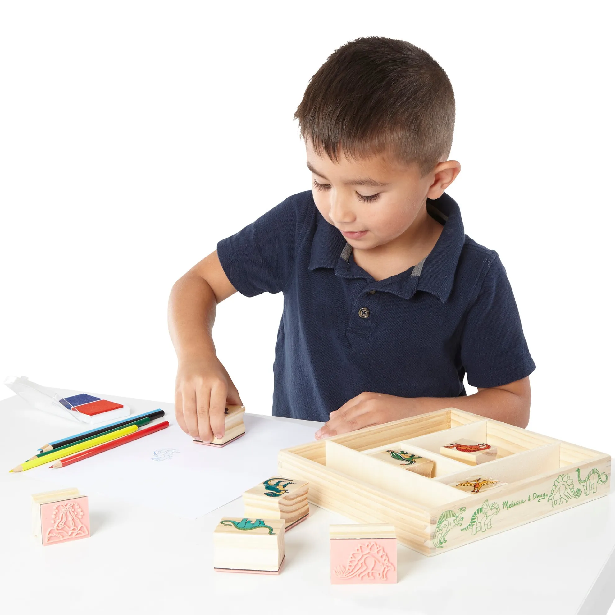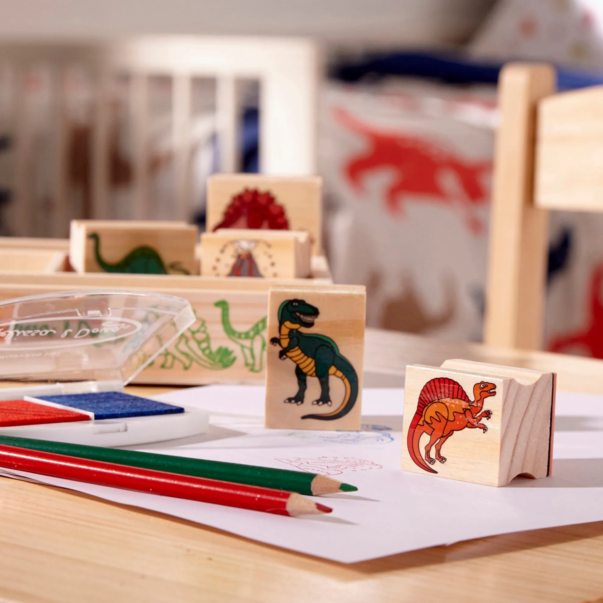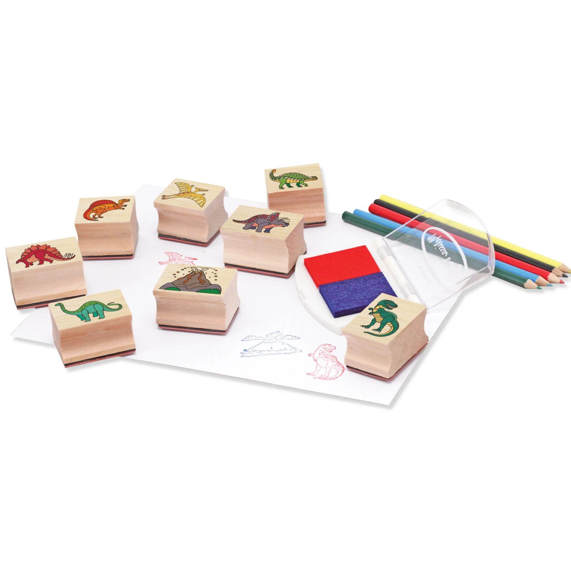 - Includes: 8 dinosaur stamps, 2-color inkpad, 5 colored pencils