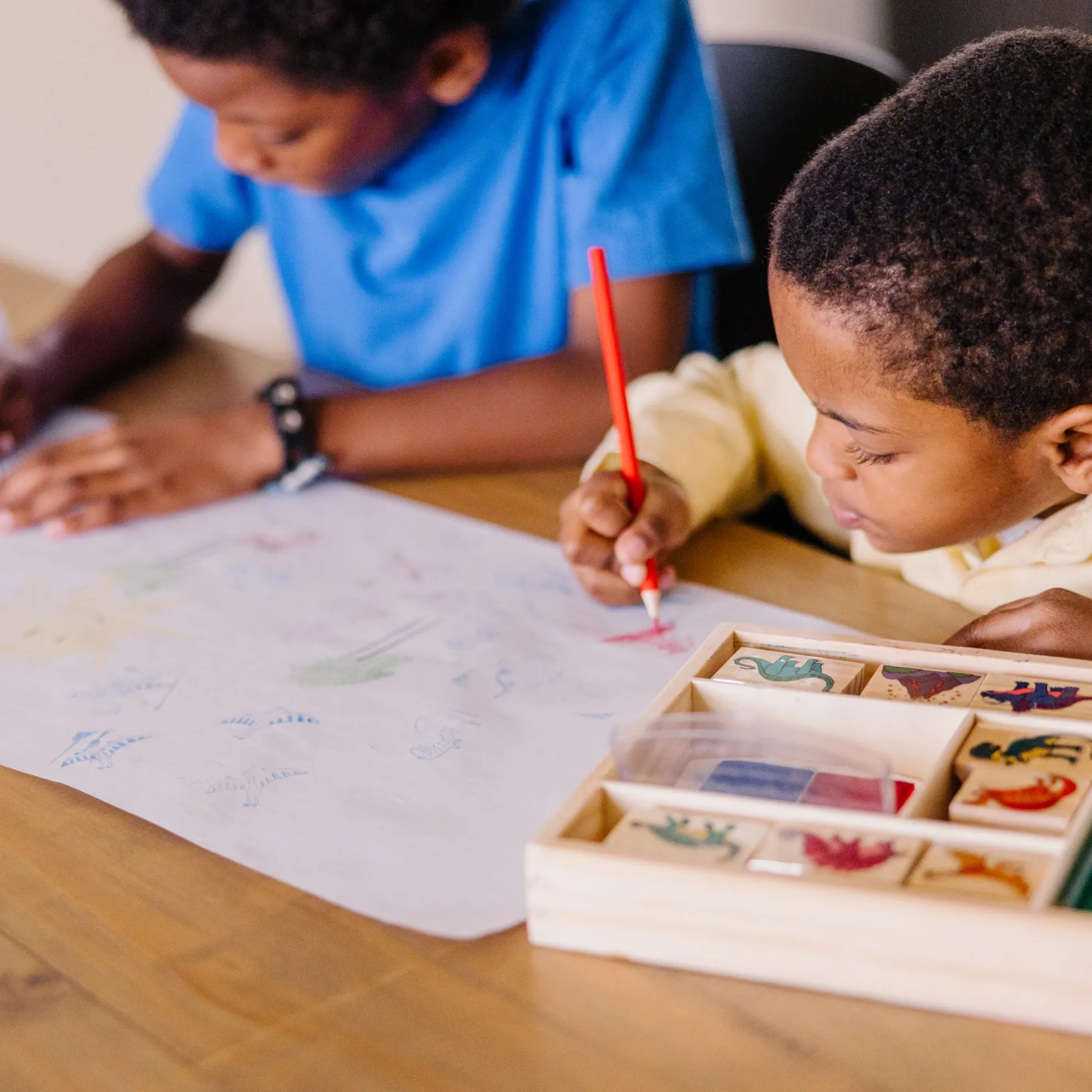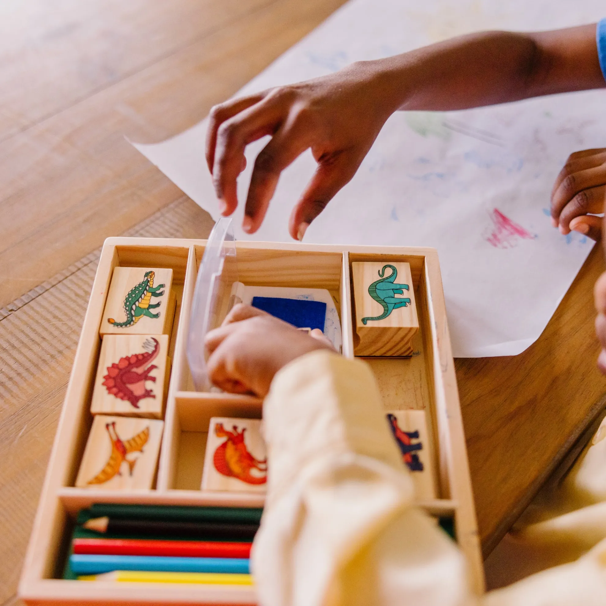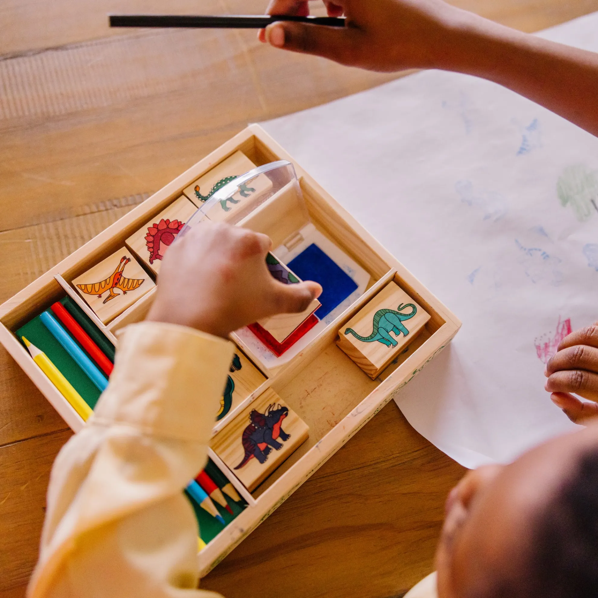 - Sturdy wooden box for storage; stamping encourages fine motor skills, creative expressions, and basic storytelling
