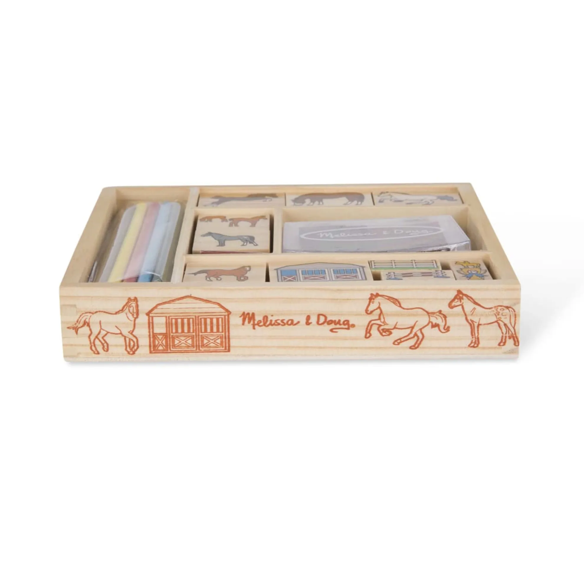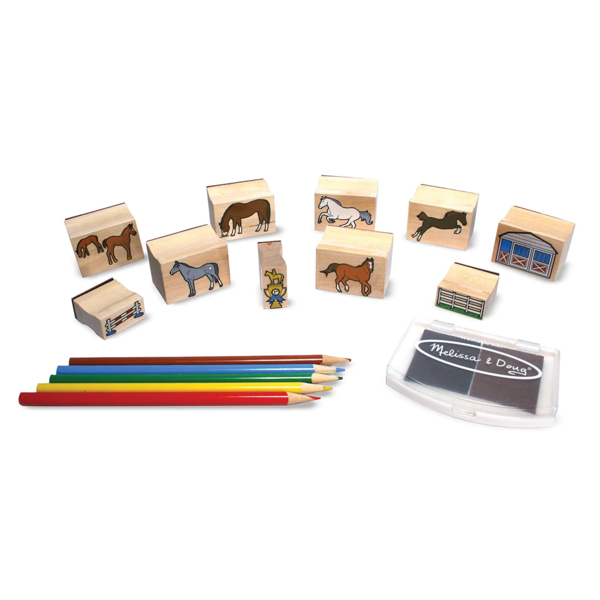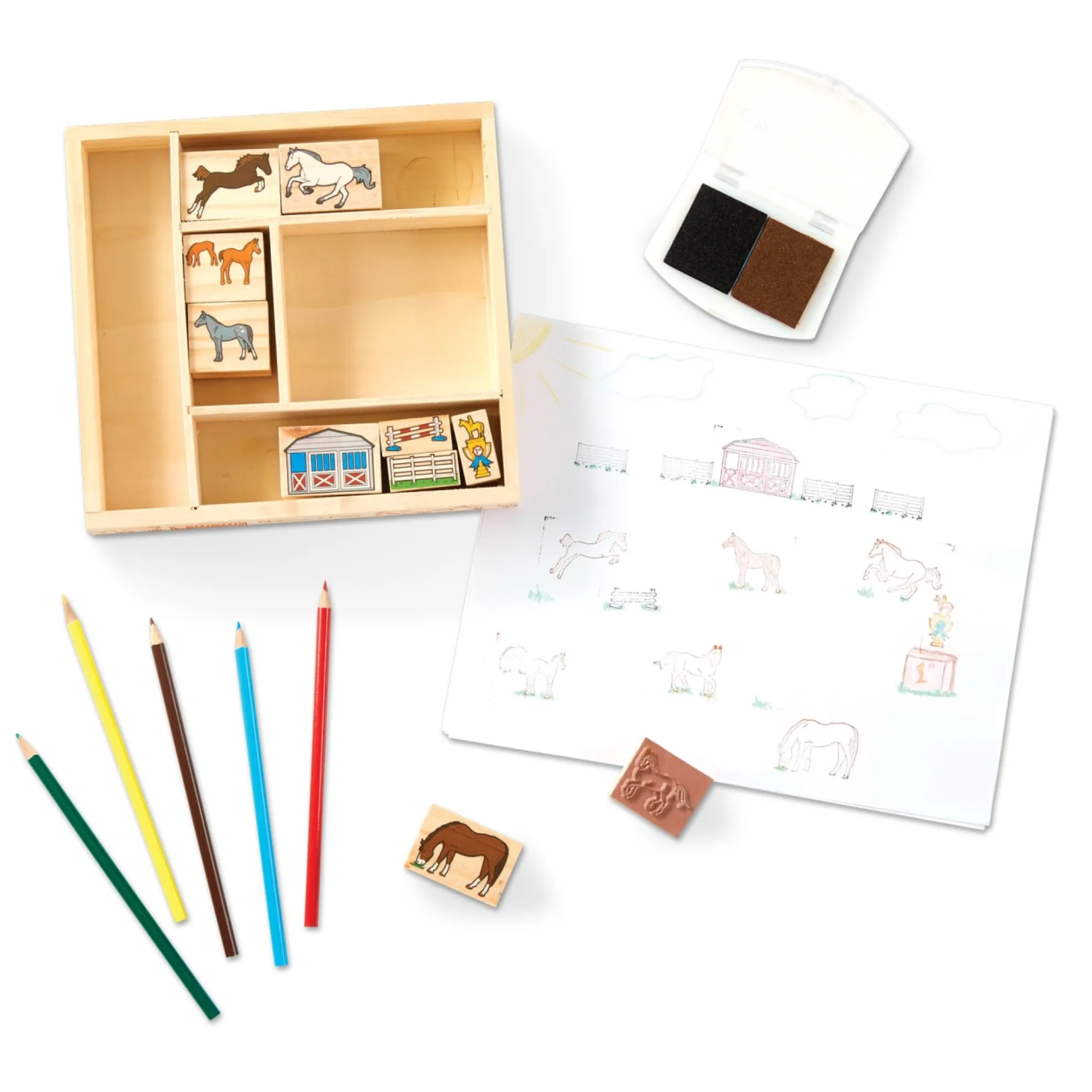 - Includes 10 wooden-handled stamps (barn, corral, jump, horses), 2-color inkpad, 5 colored pencils