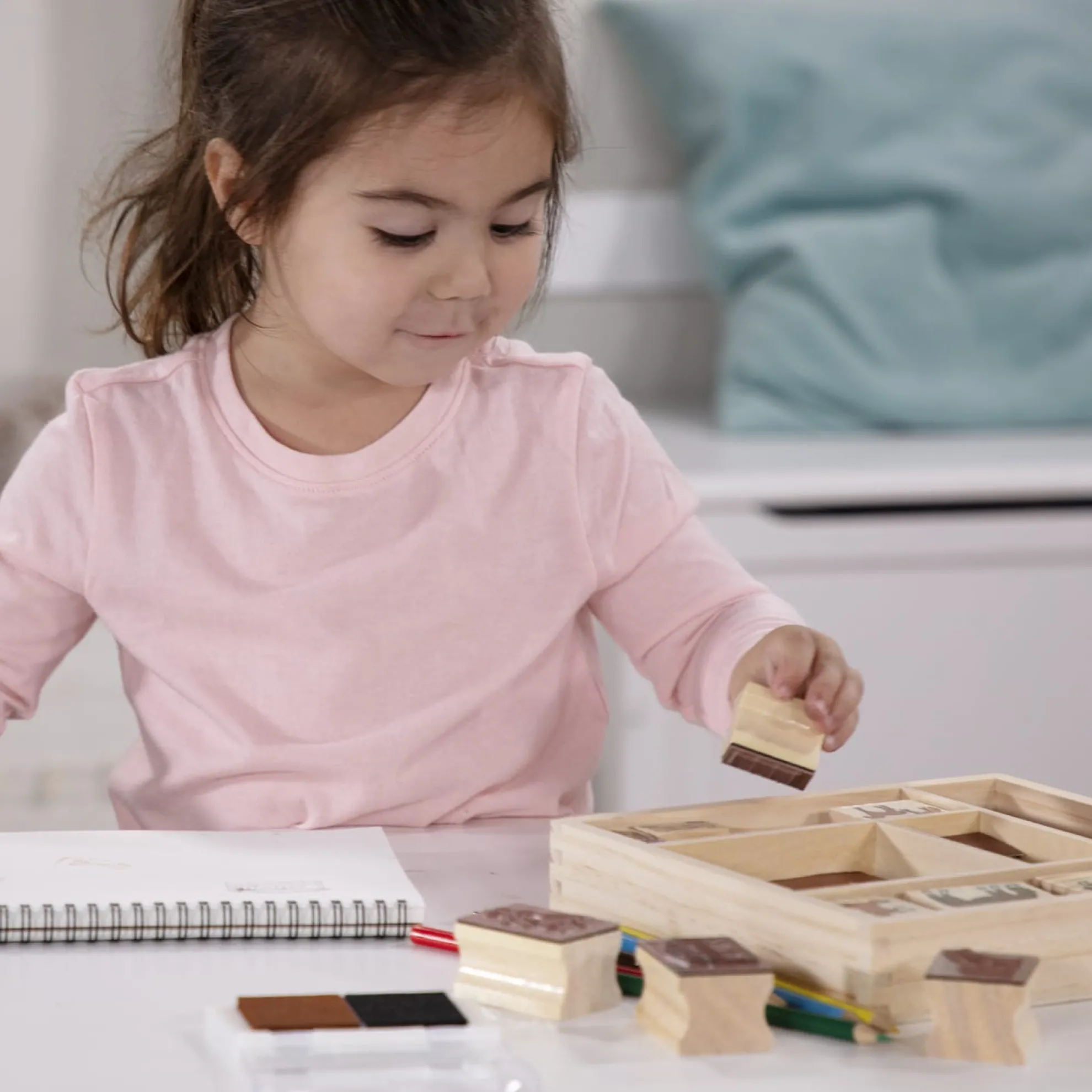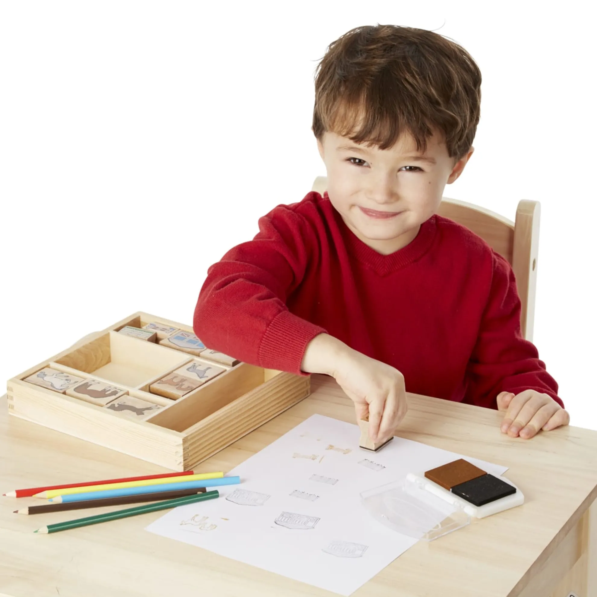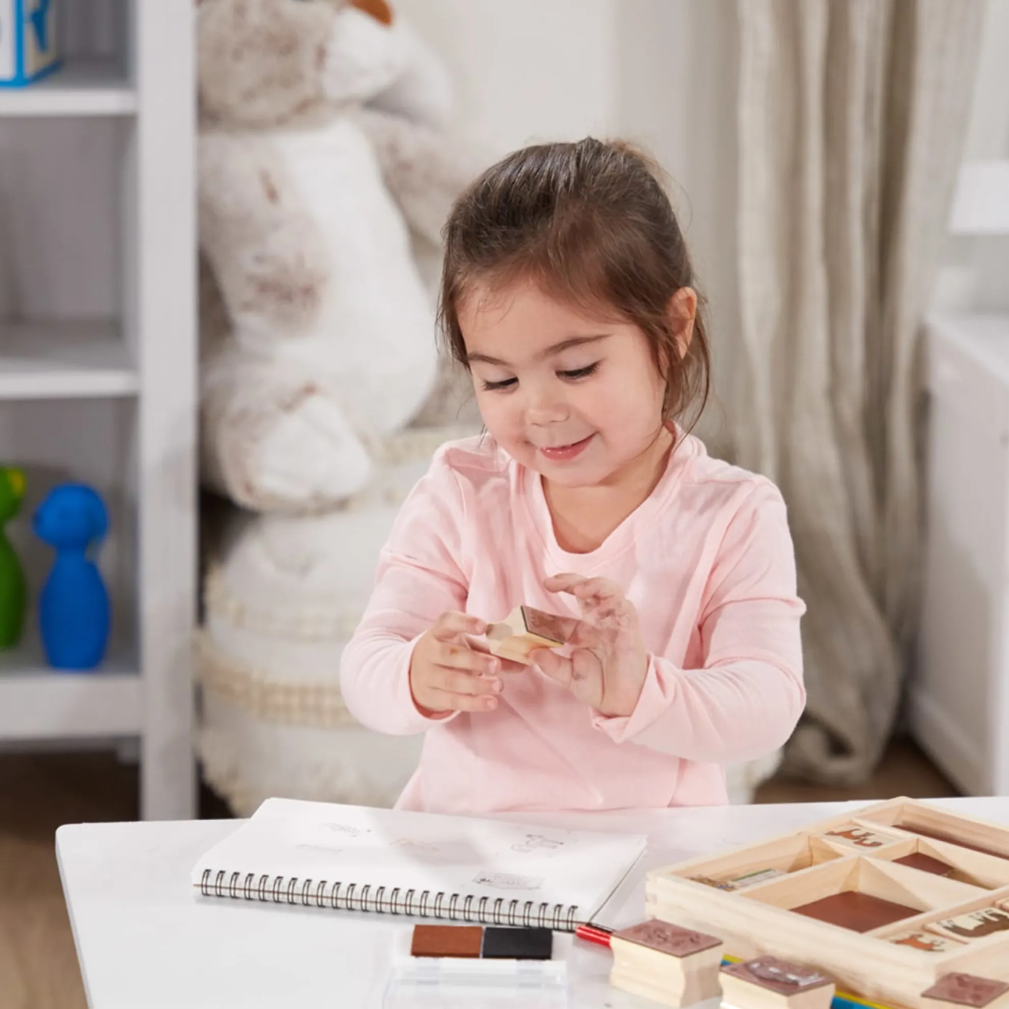 Herd your horses with this detailed stamp set that includes a barn, corral, jump and six different horse stamps. Mix and match the detailed stamps to create hundreds of beautiful scenes. All the pieces, including the 2-color inkpad, store in a sturdy wooden box. Washable, non-toxic kid-friendly ink.