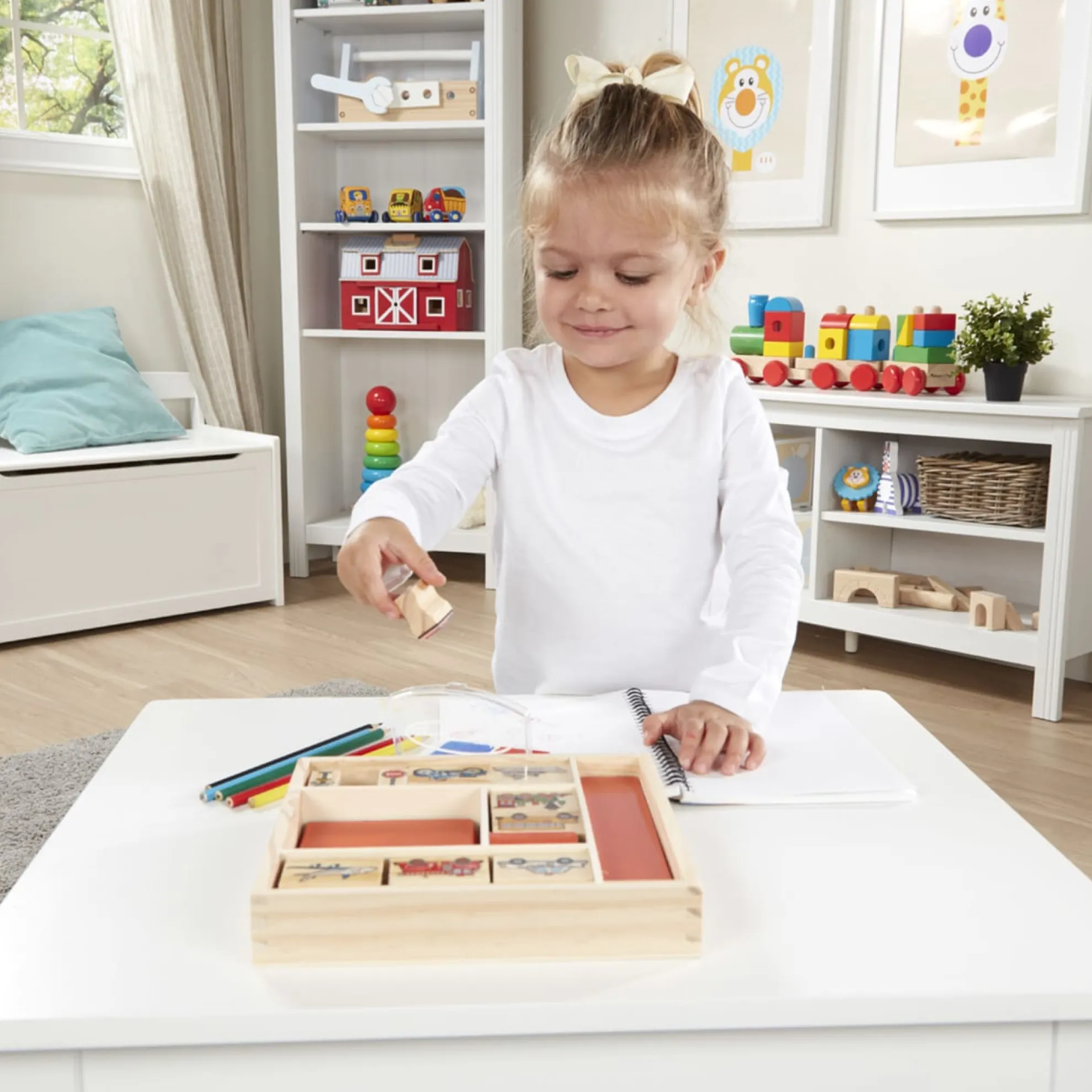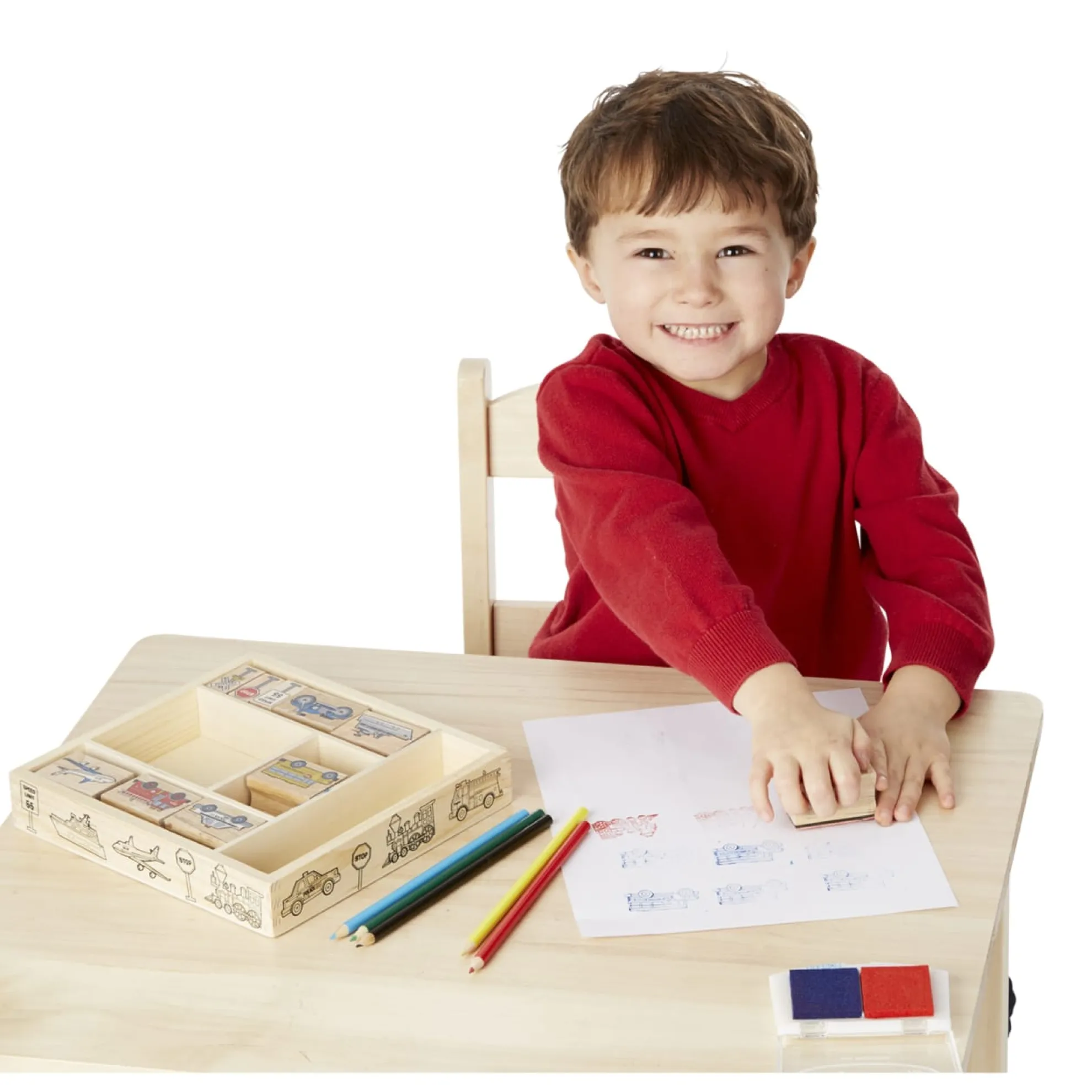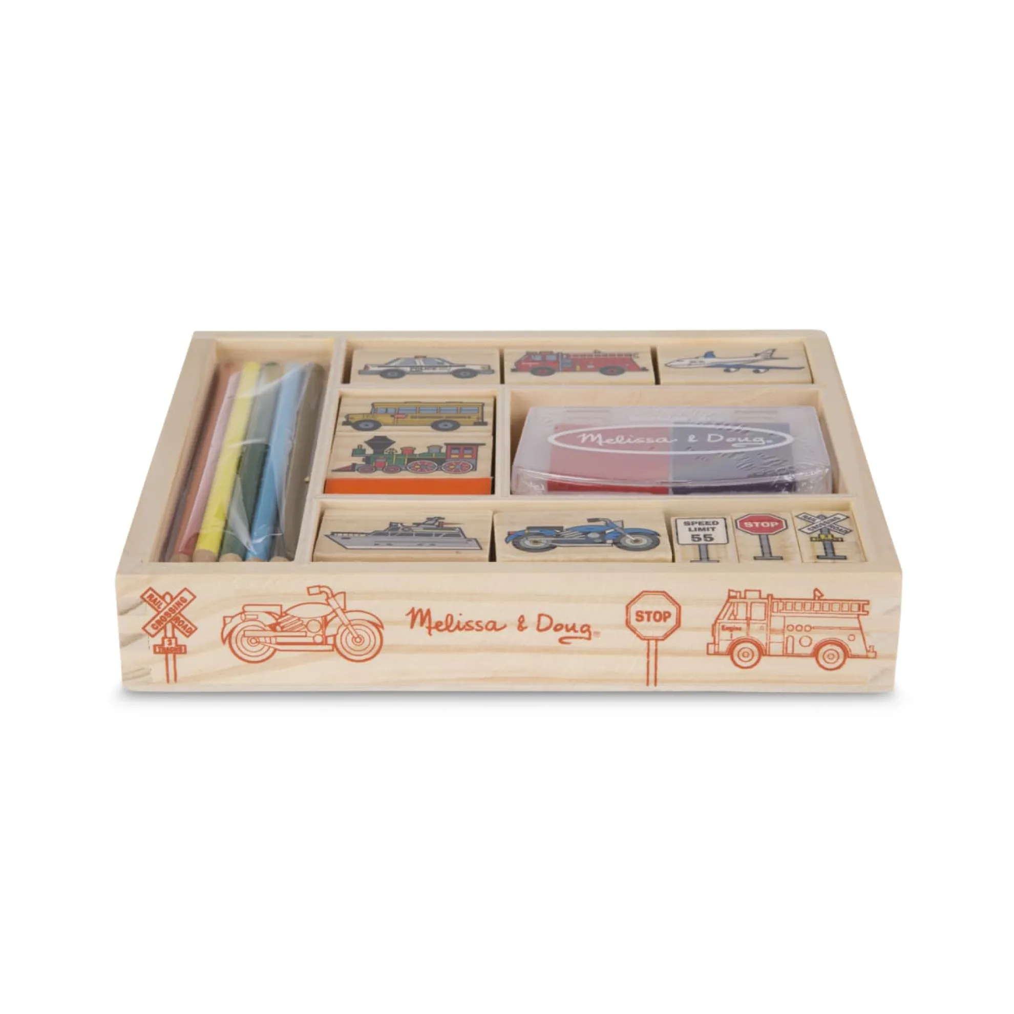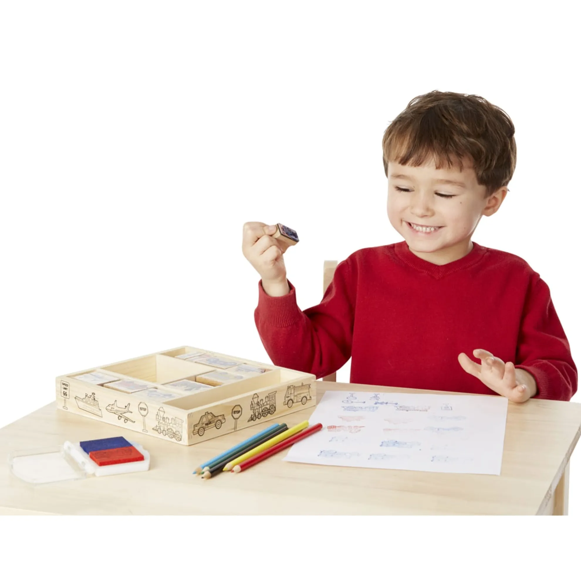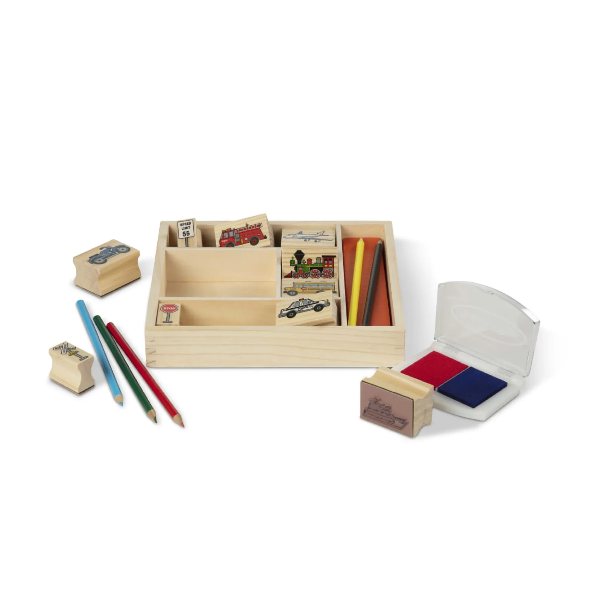 Go wherever your imagination takes you! It’s easy to mix and match these detailed vehicle and traffic sign stamps to create hundreds of visual adventures. All the pieces, including the 2-color inkpad, store in a sturdy wooden box. Washable, kid-friendly ink.