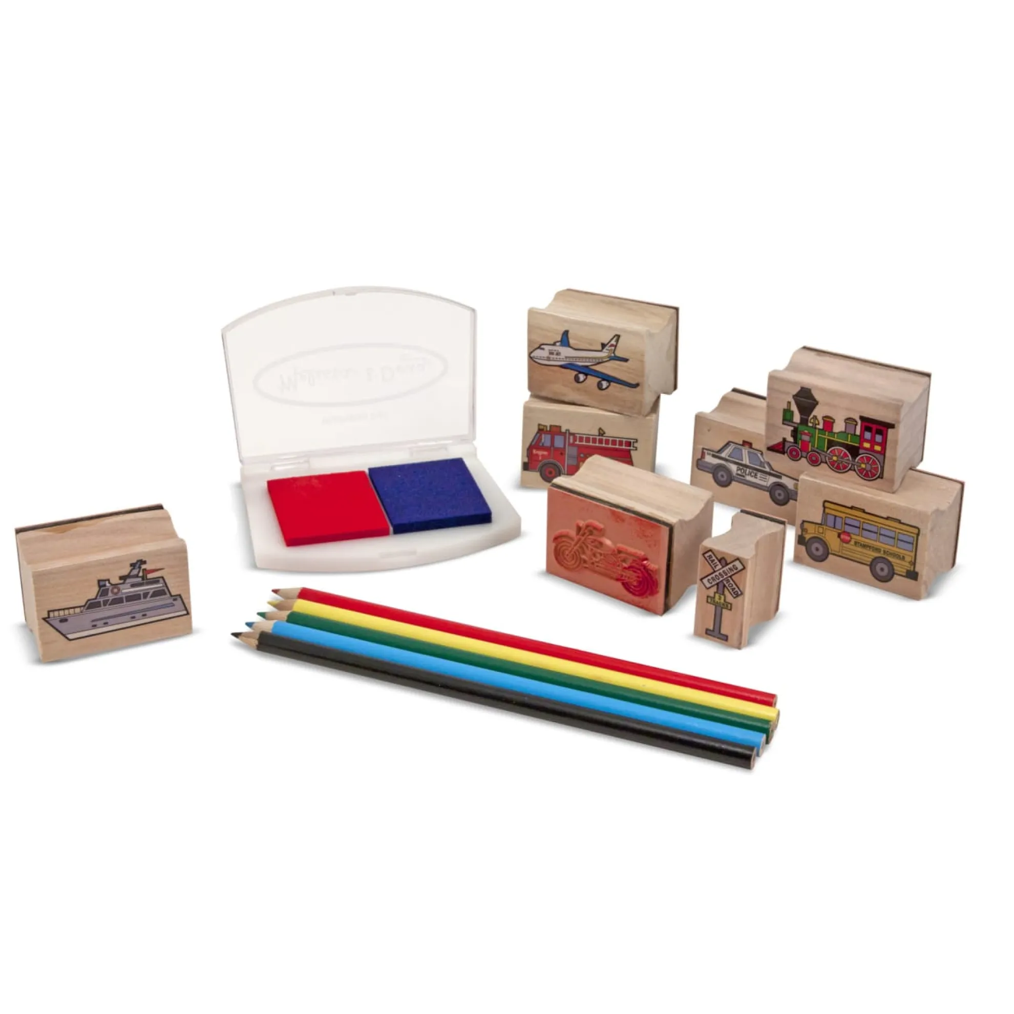 - Includes 10 stamps, 2-color stamp pad and 5 colored pencils
