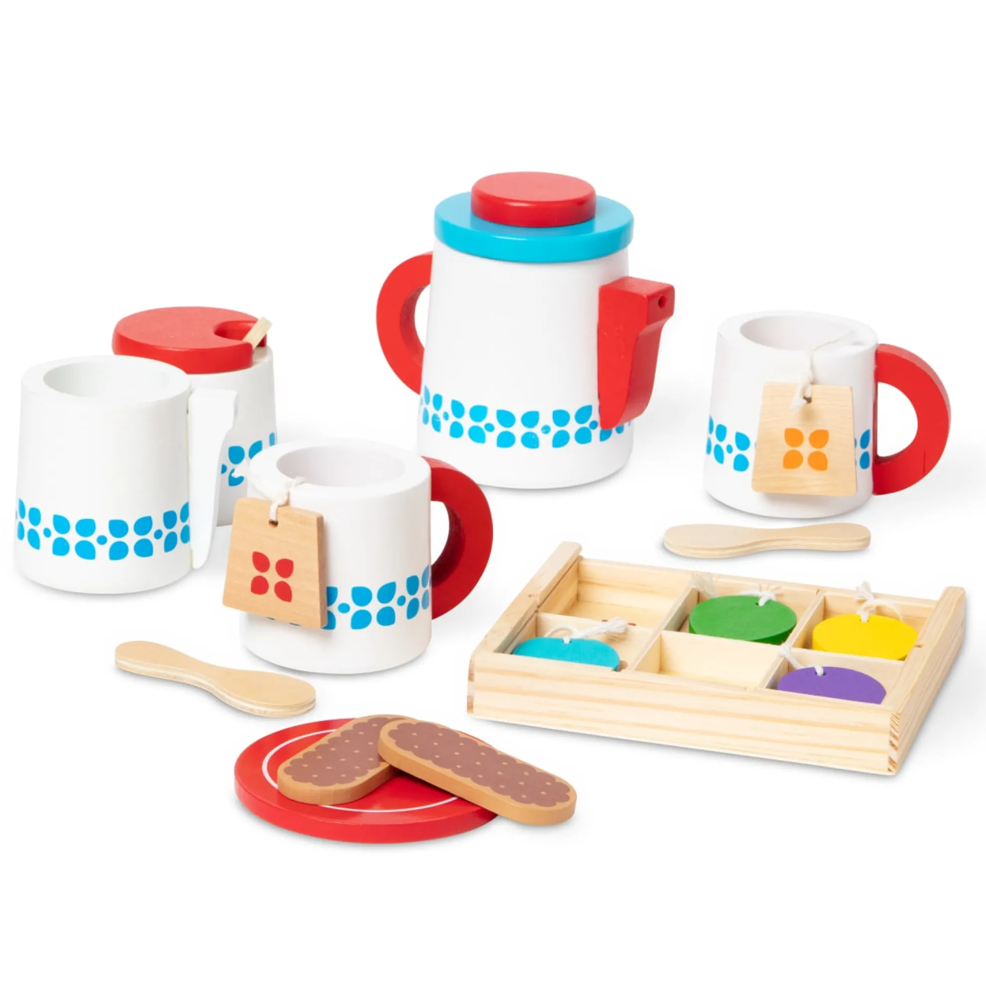 - Includes teapot with lid, 2 cups, 2 spoons, sugar bowl, milk pitcher, 6 assorted teas in tea caddy, 2 cookies, dry-erase order card, placemat