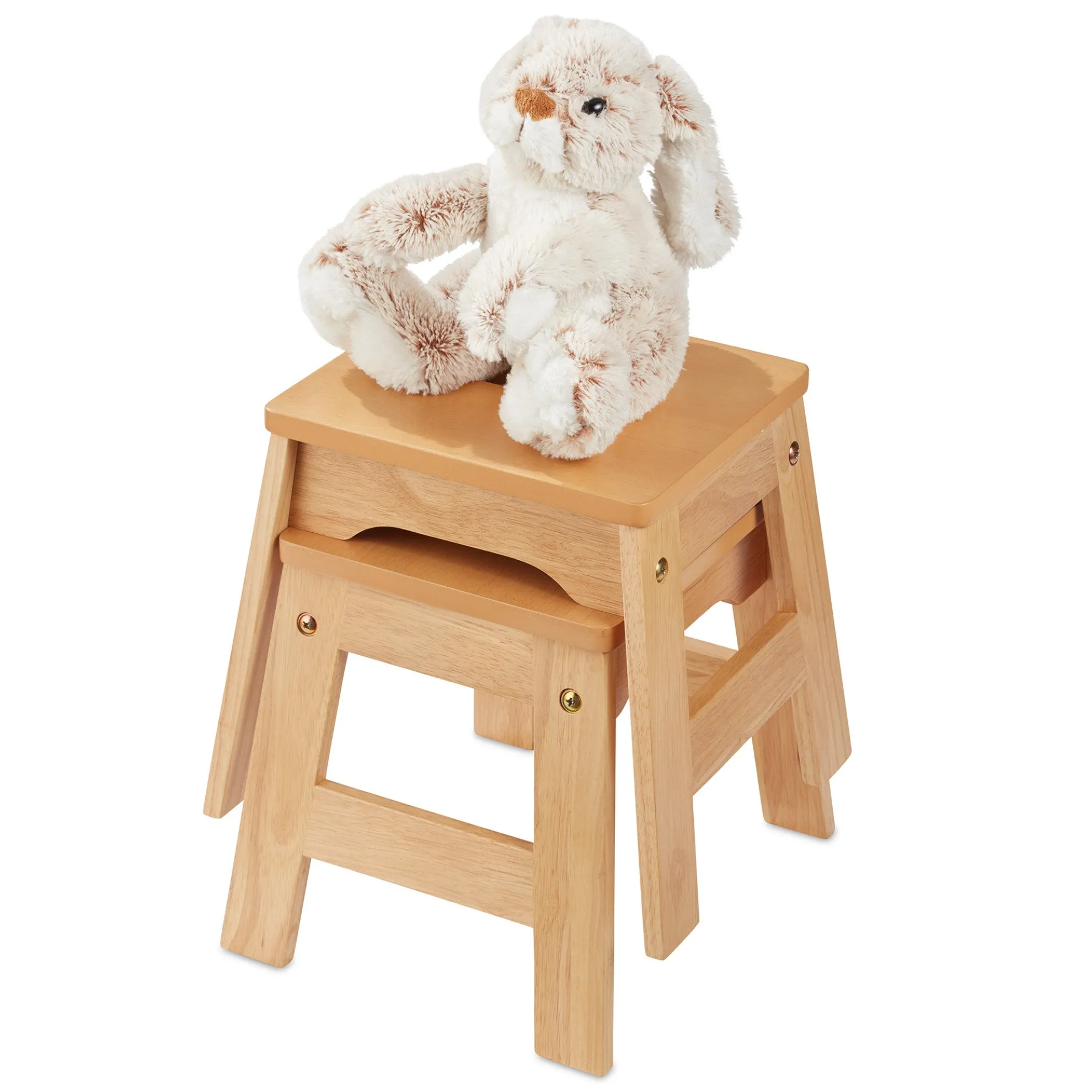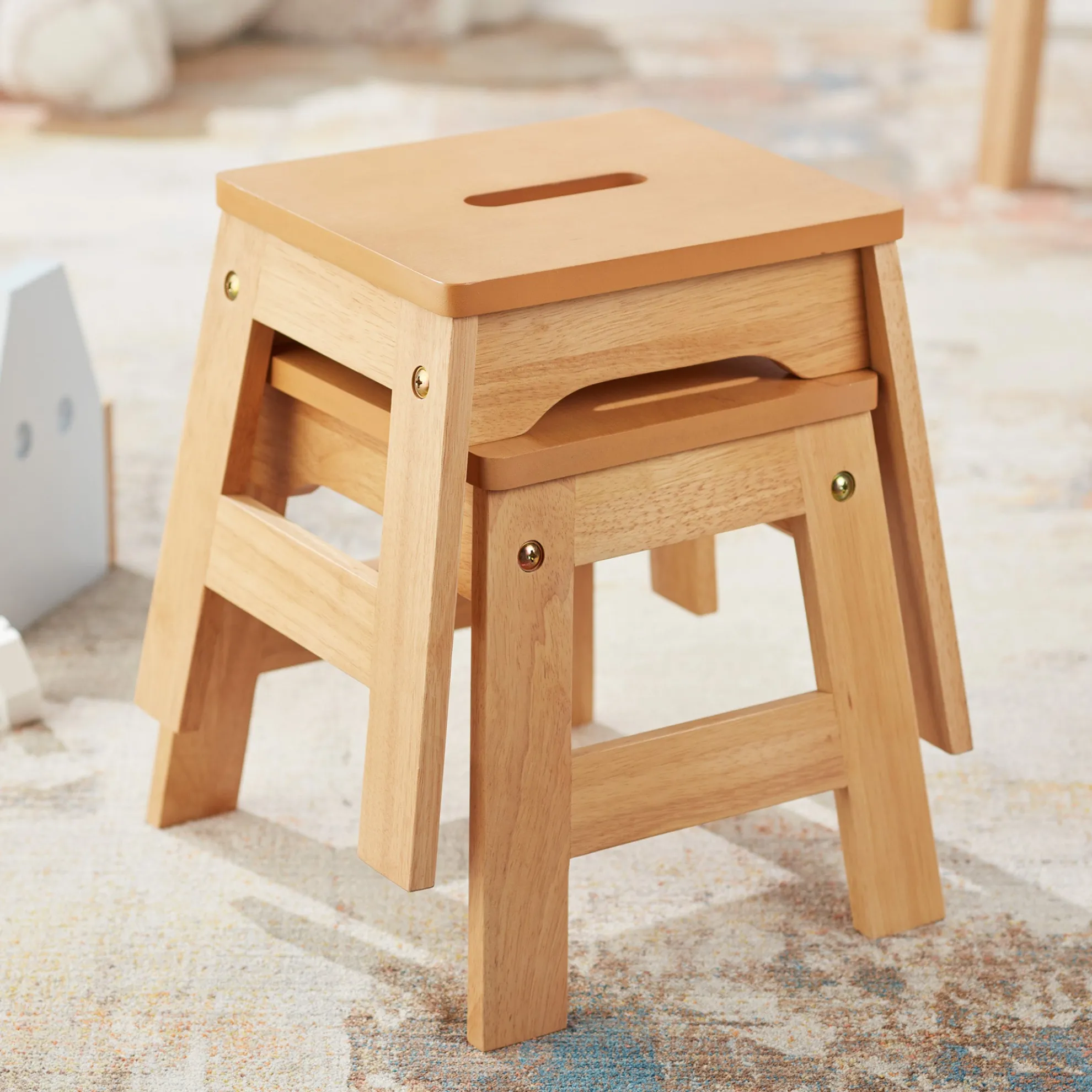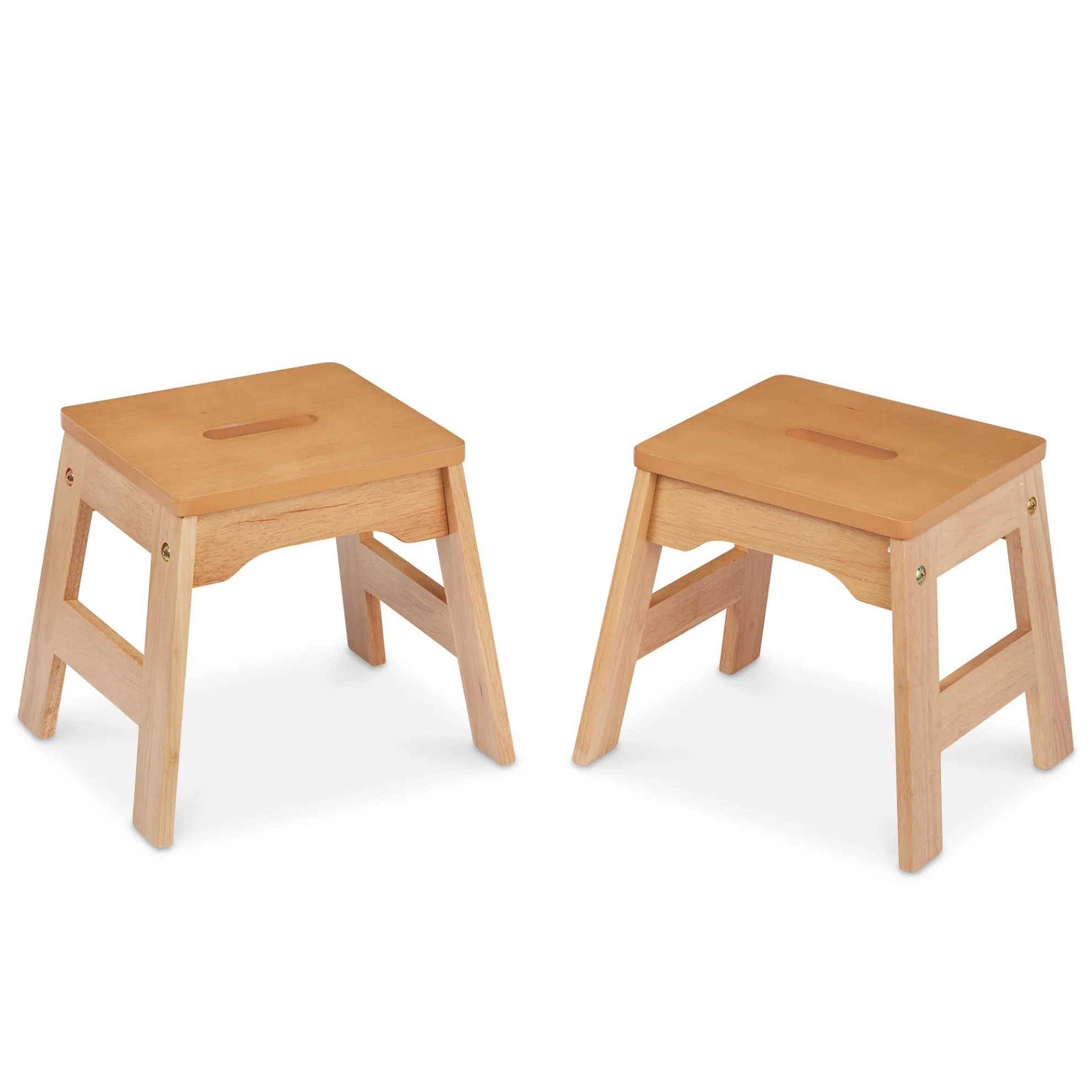 - Set of 2 sturdy wooden stools, sized for kids, but strong enough to hold most adults