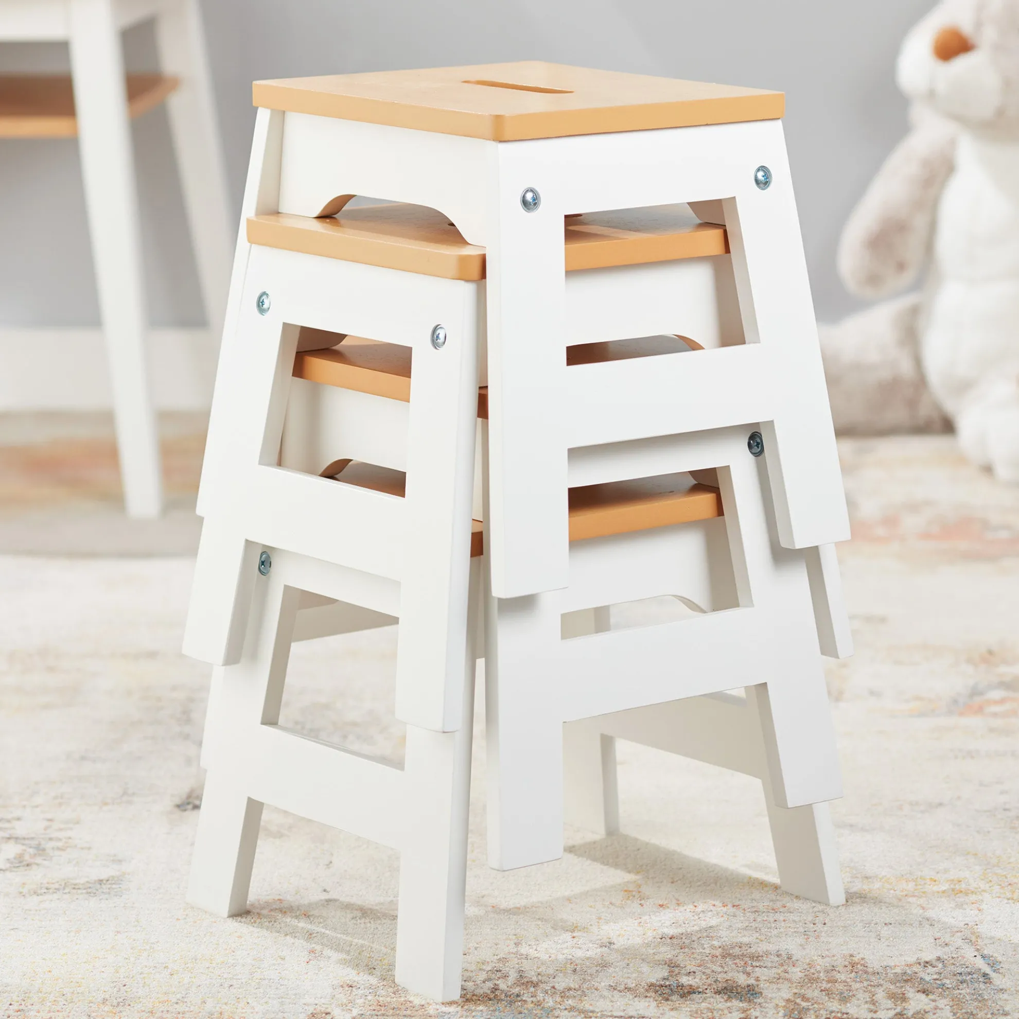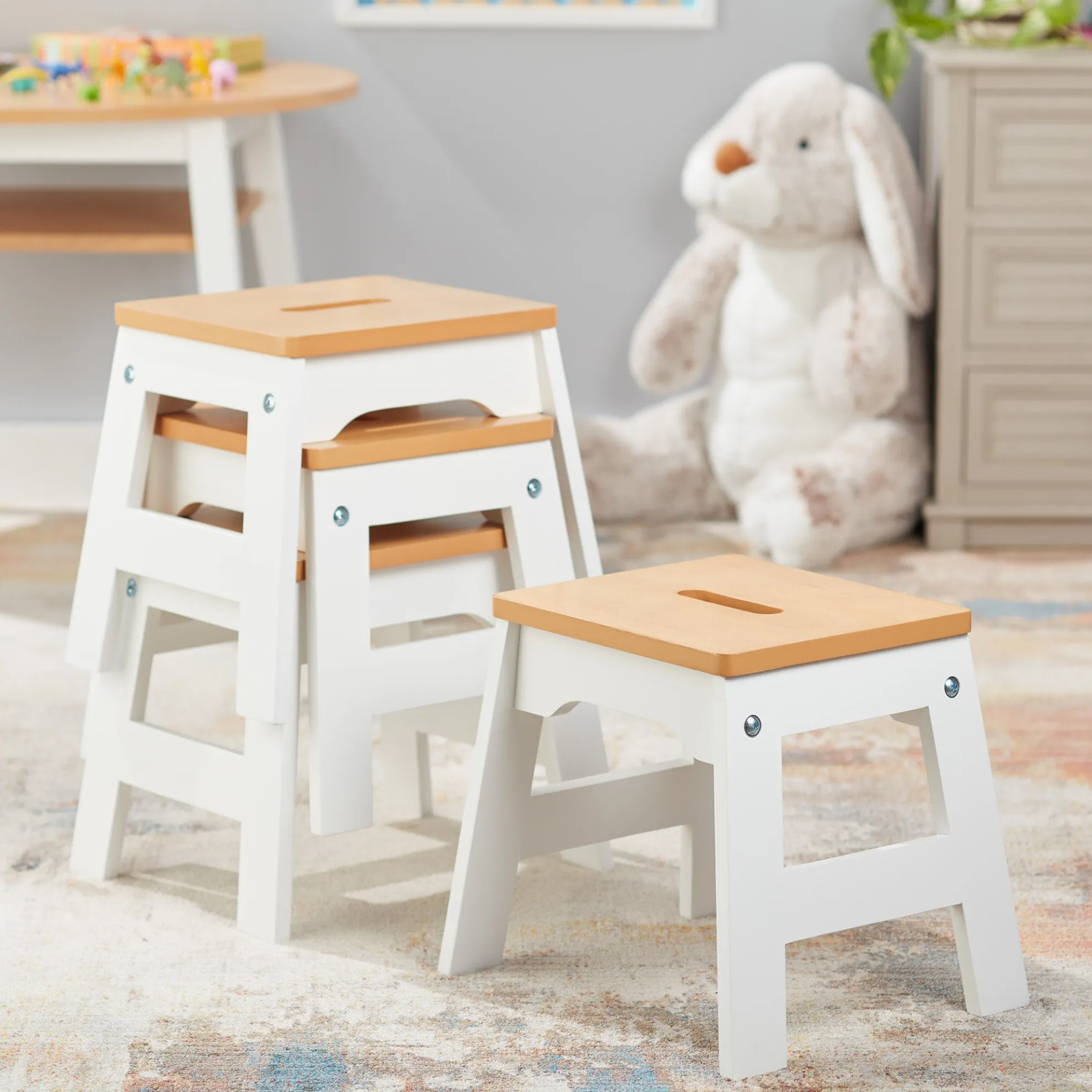 Have a seat (or four)! This set of four sturdy wooden stools is perfect for use around an activity or play table and makes a great addition to any kid’s play space. Available in white, natural (light woodgrain), and two-tone white and natural, the 11-inch-high stools wipe clean with just a damp cloth and fit any home decor. A cutout handle in the seat makes these easy to carry from room to room, and they are designed to stack for convenient storage. Stools are sized for kids three to eight years old, up to 100 pounds.
