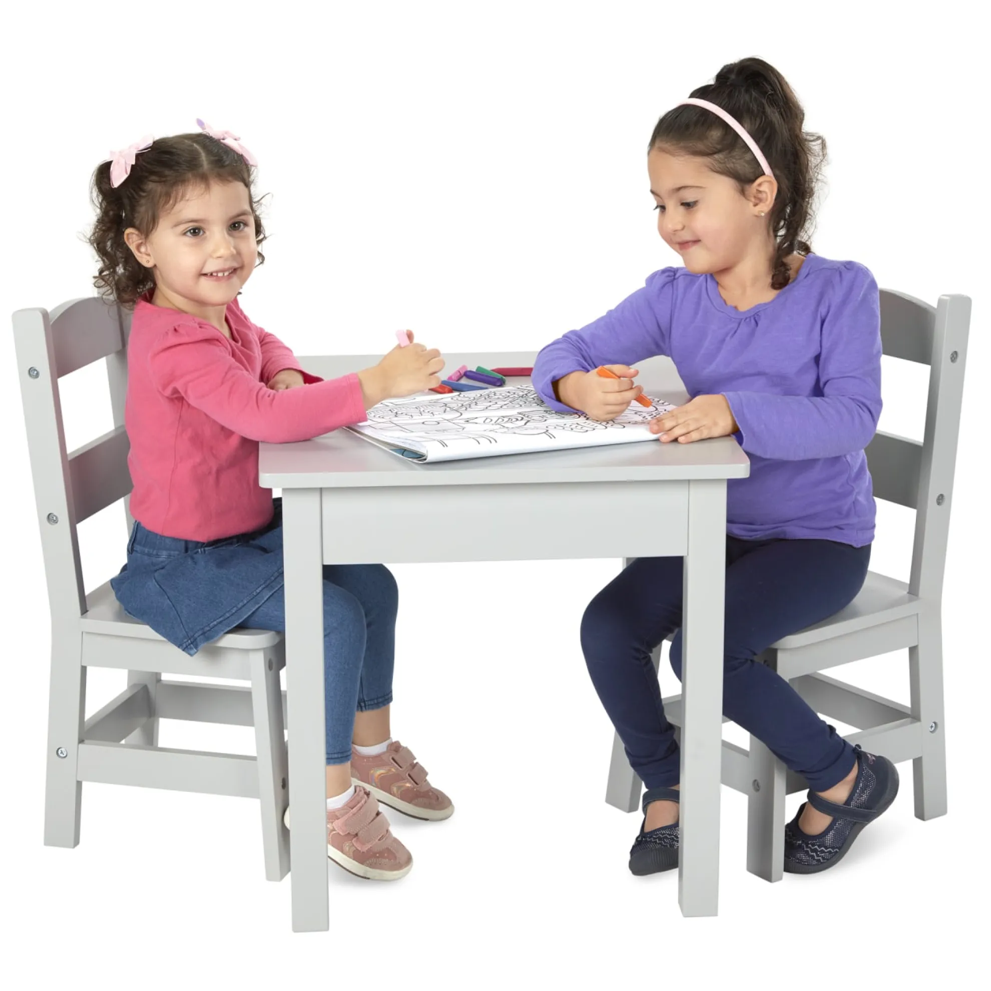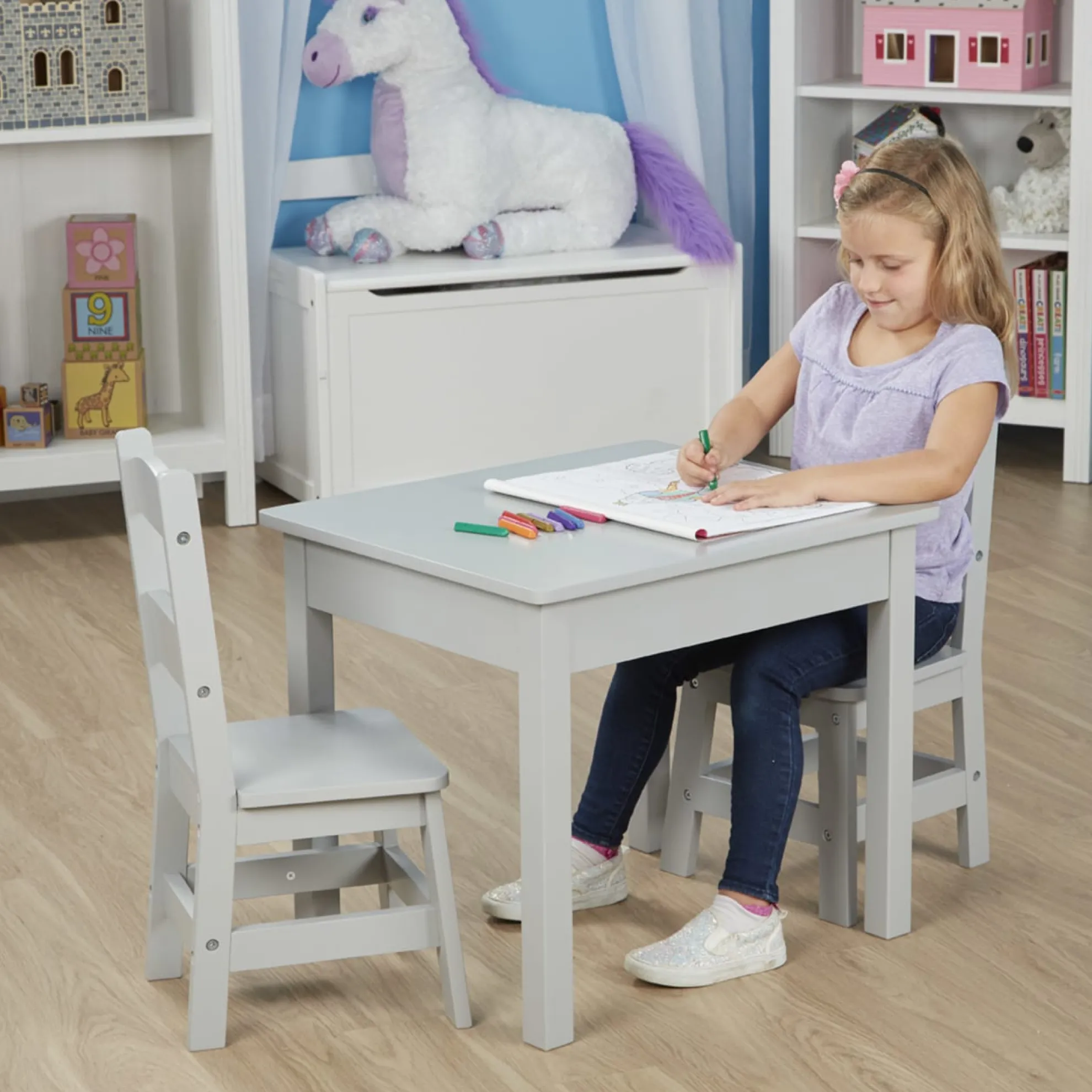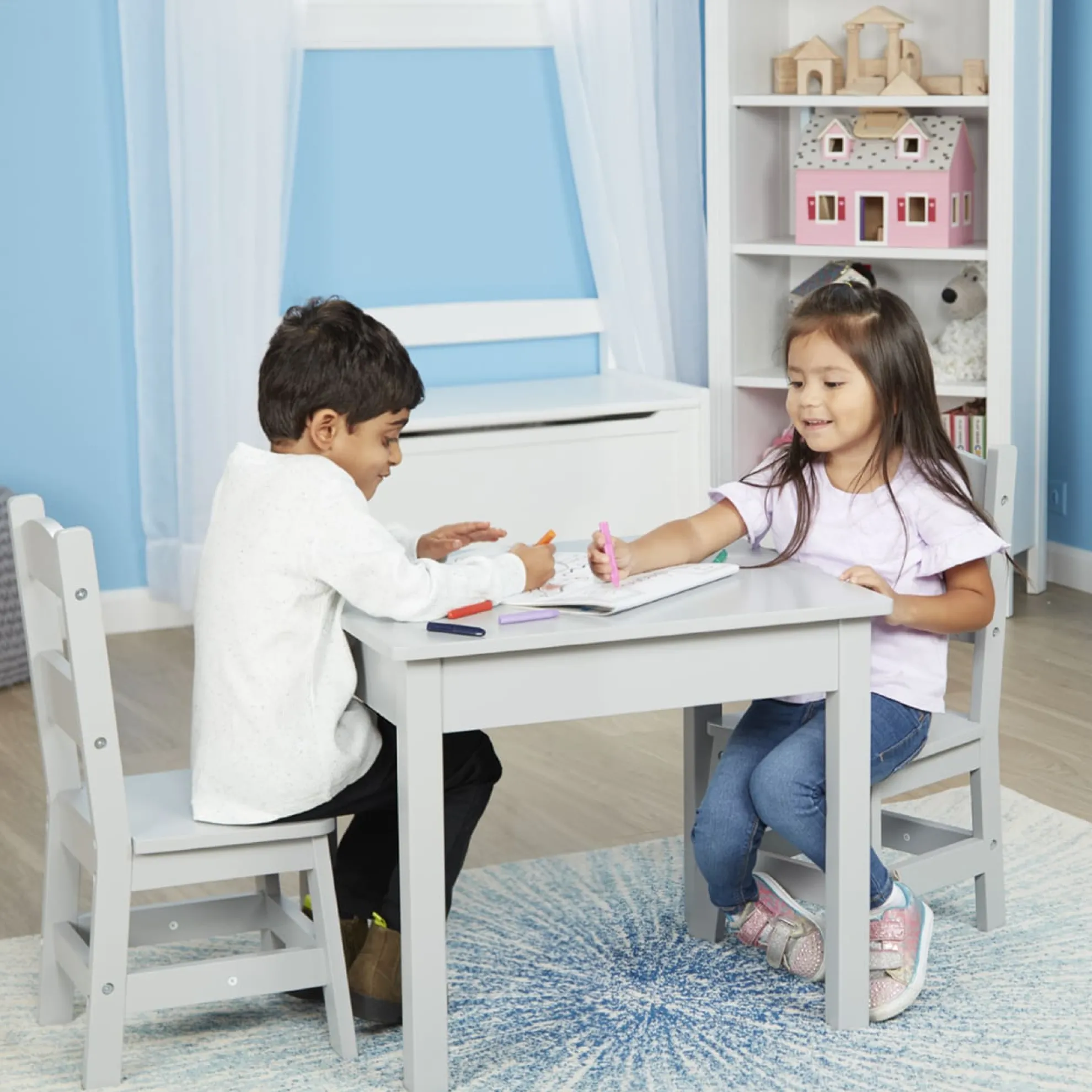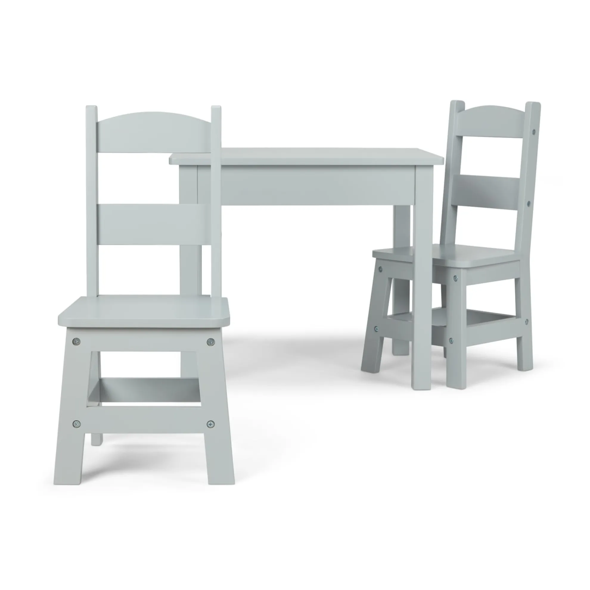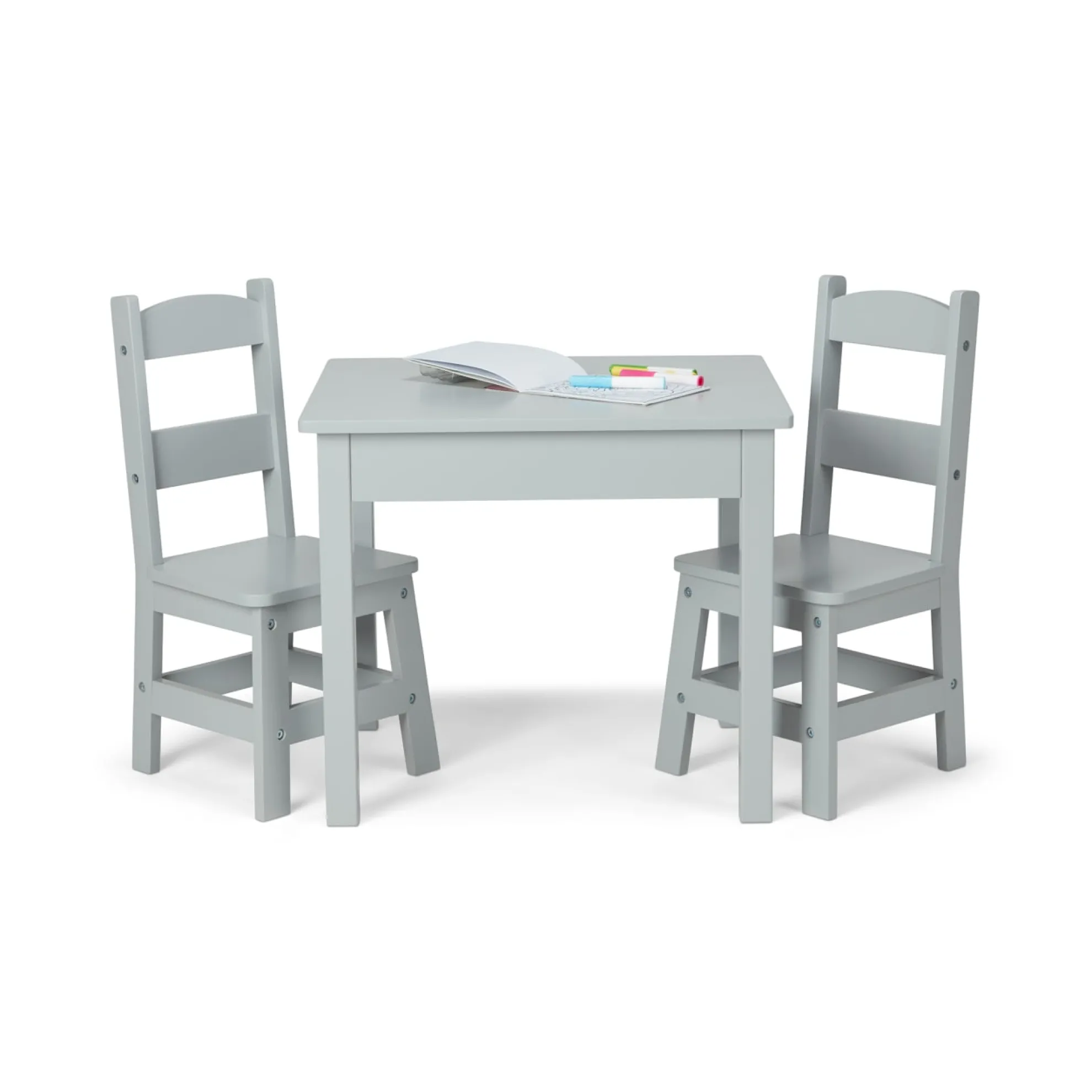 - Easy-to-assemble sturdy wooden table and 2 wooden chairs in gray, sized for kids