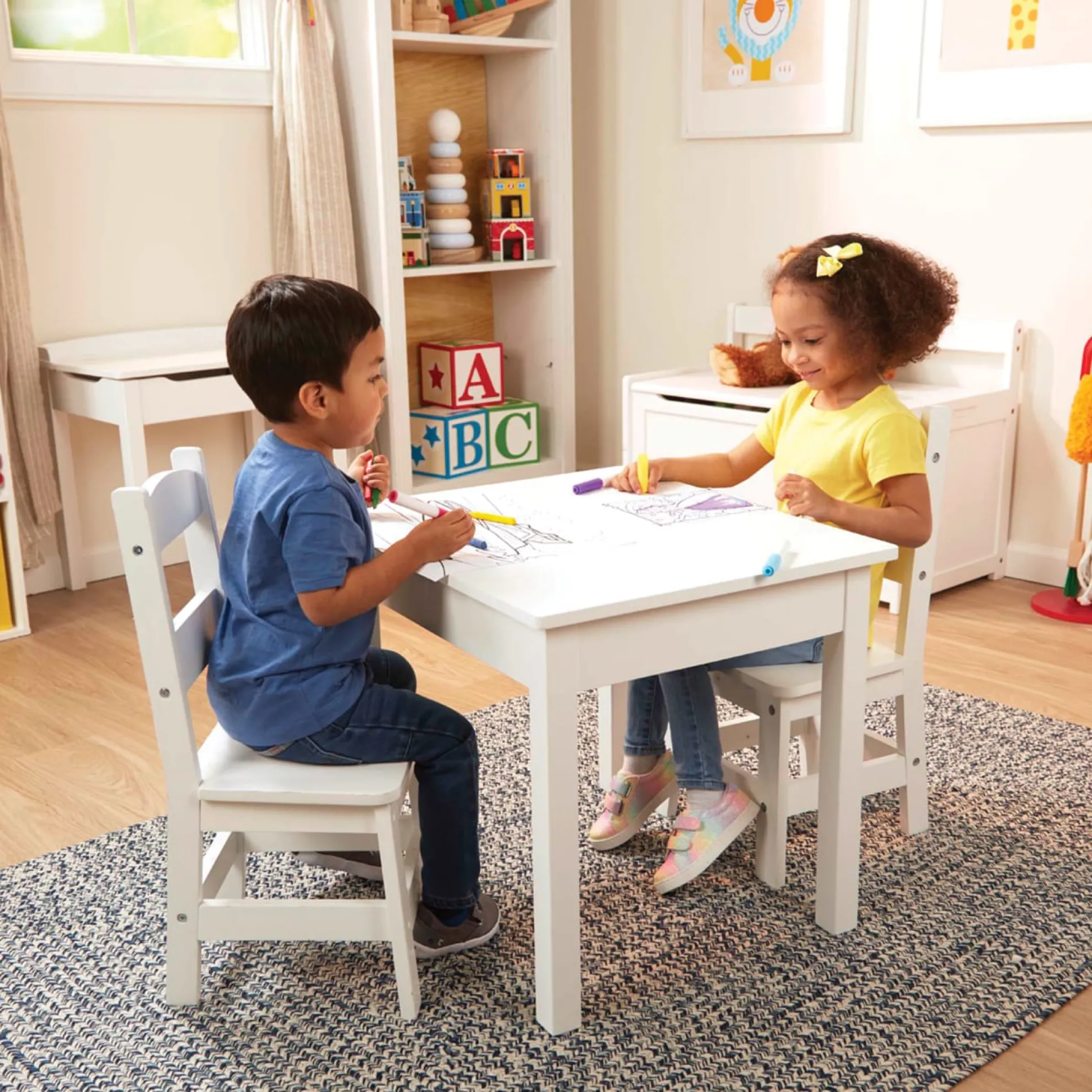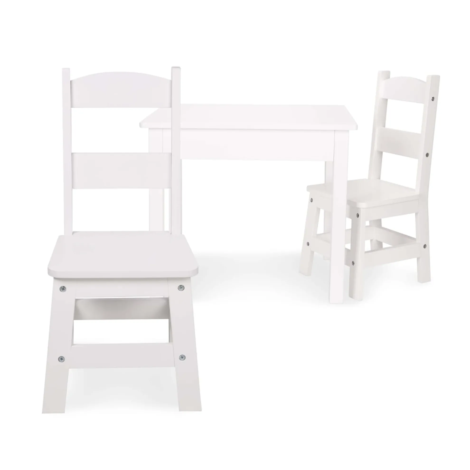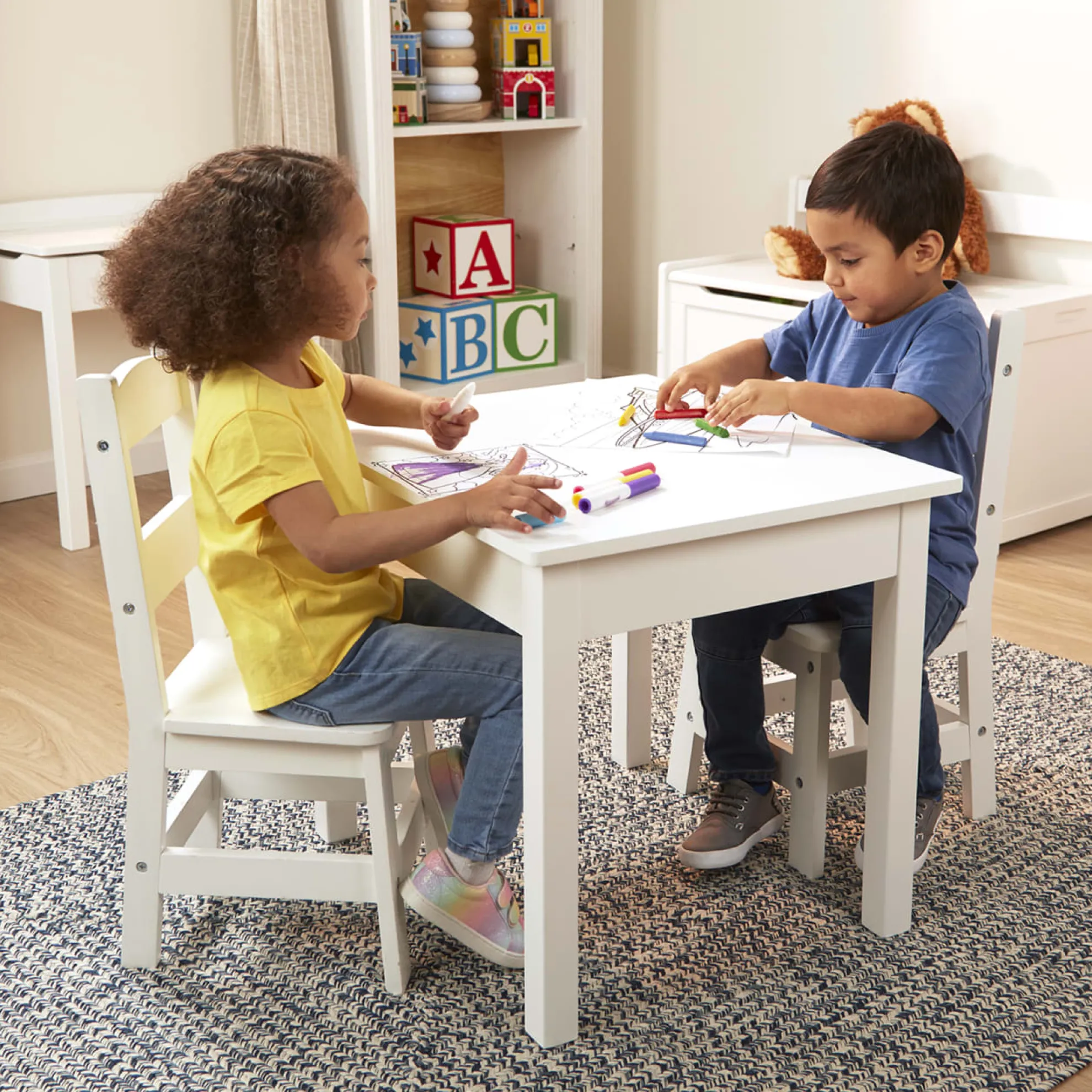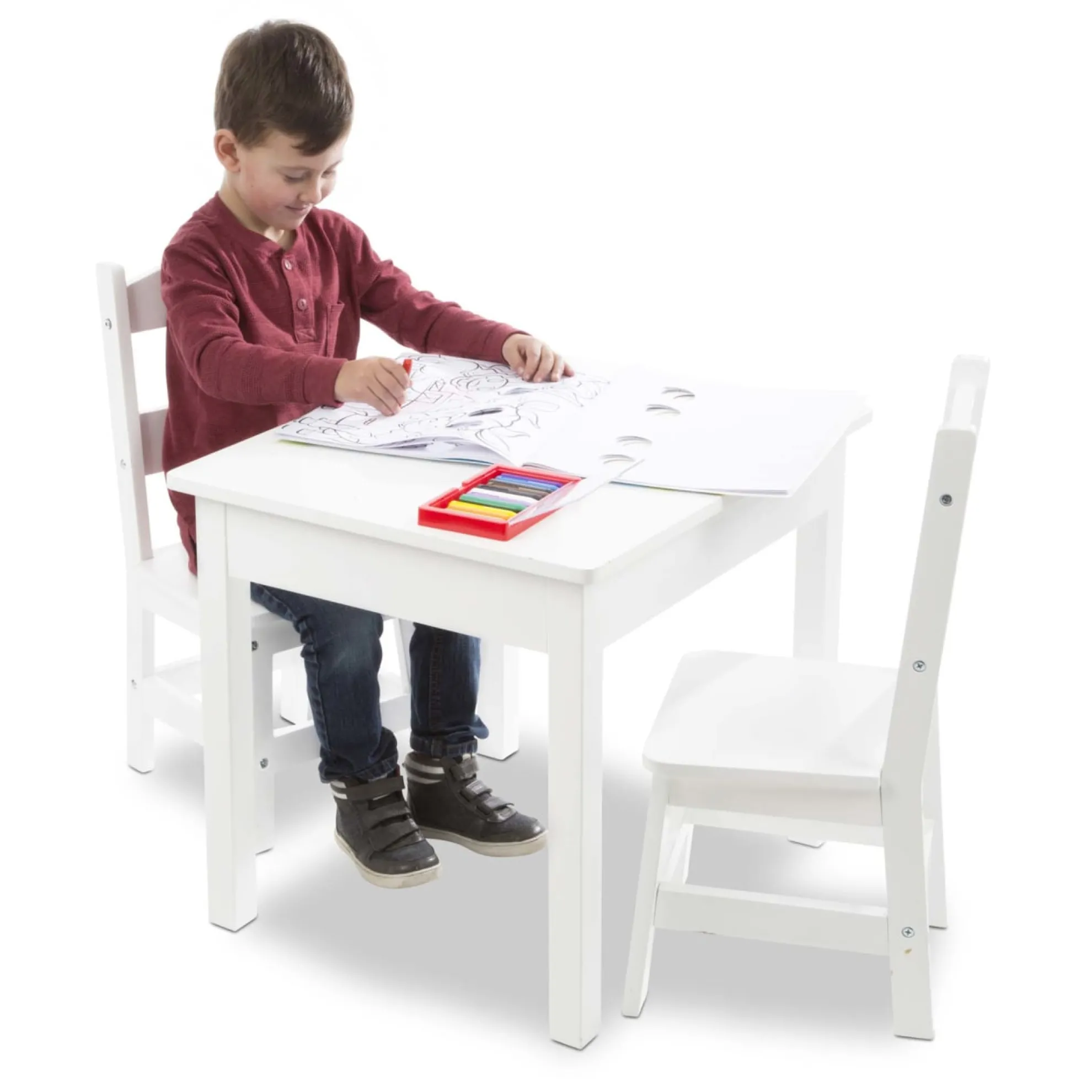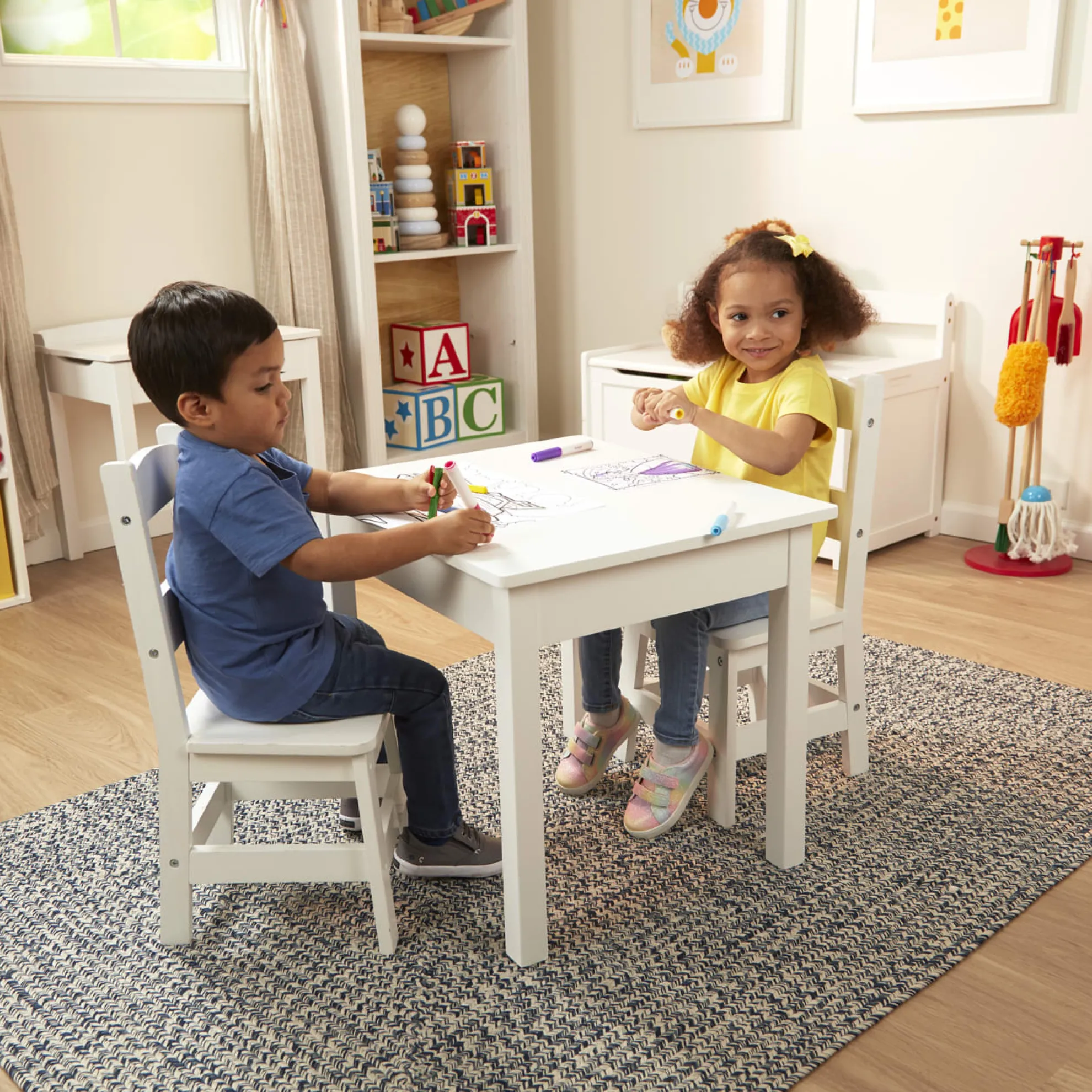 - Easy-to-assemble sturdy wooden table and 2 wooden chairs sized for kids