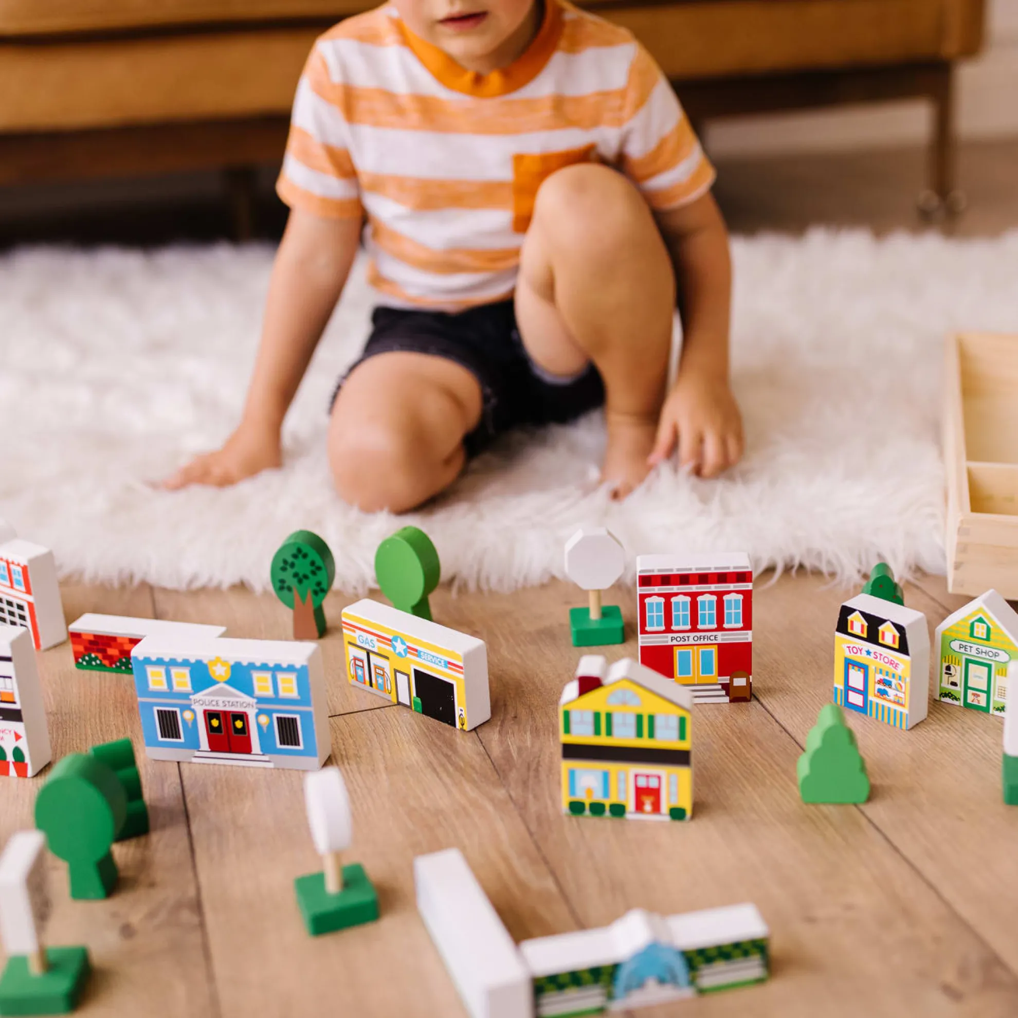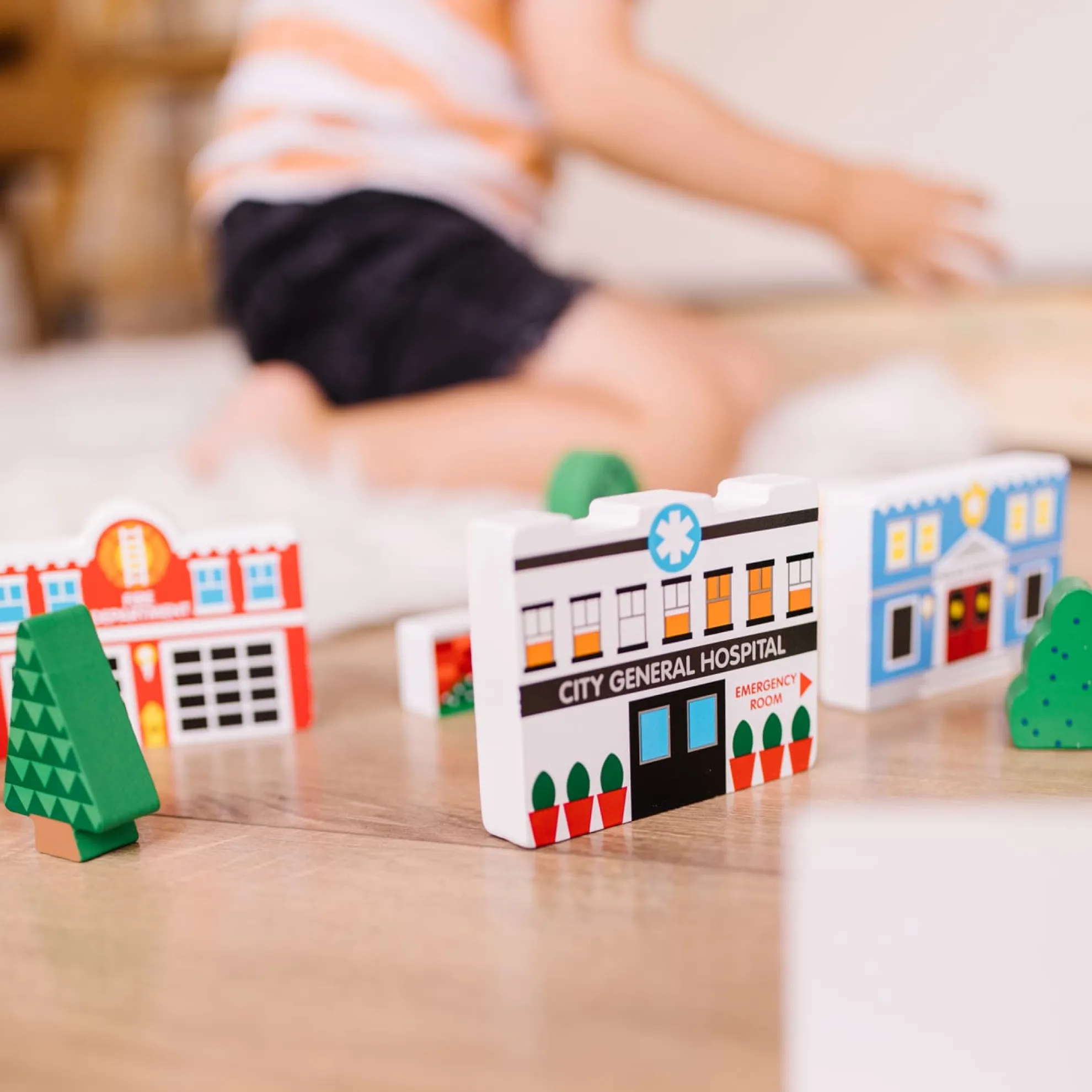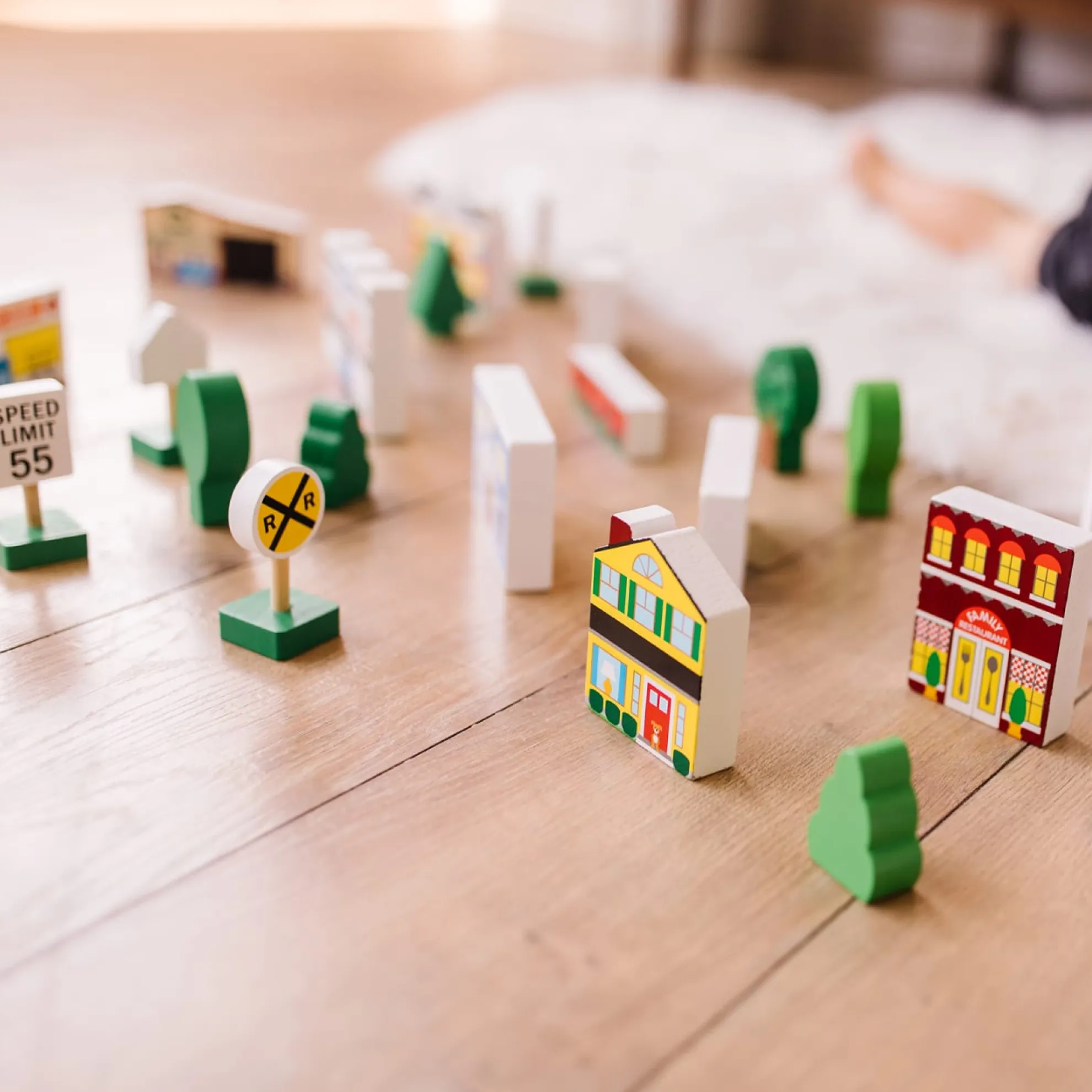 - 32-piece set of wooden streetscape “blocks” to create a town