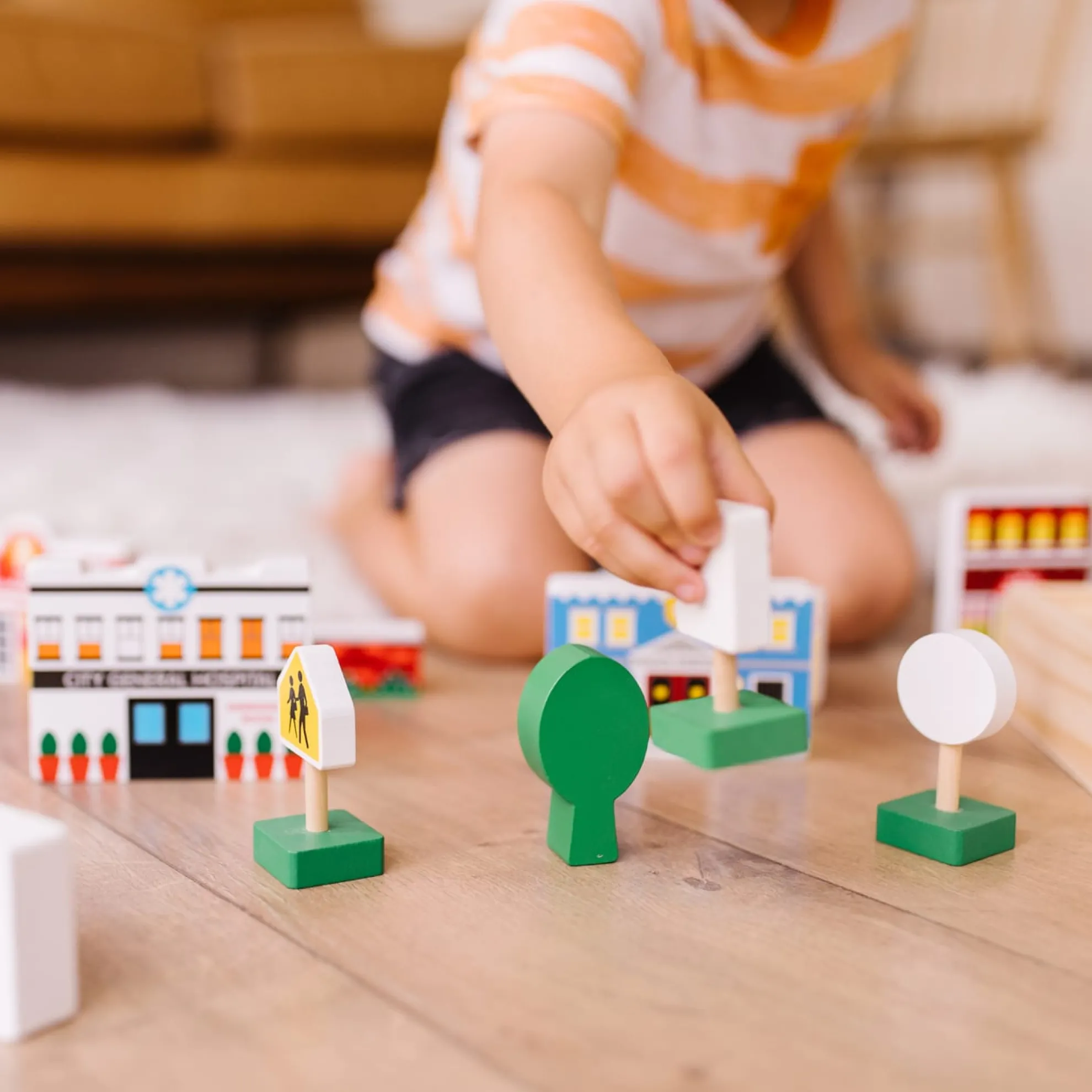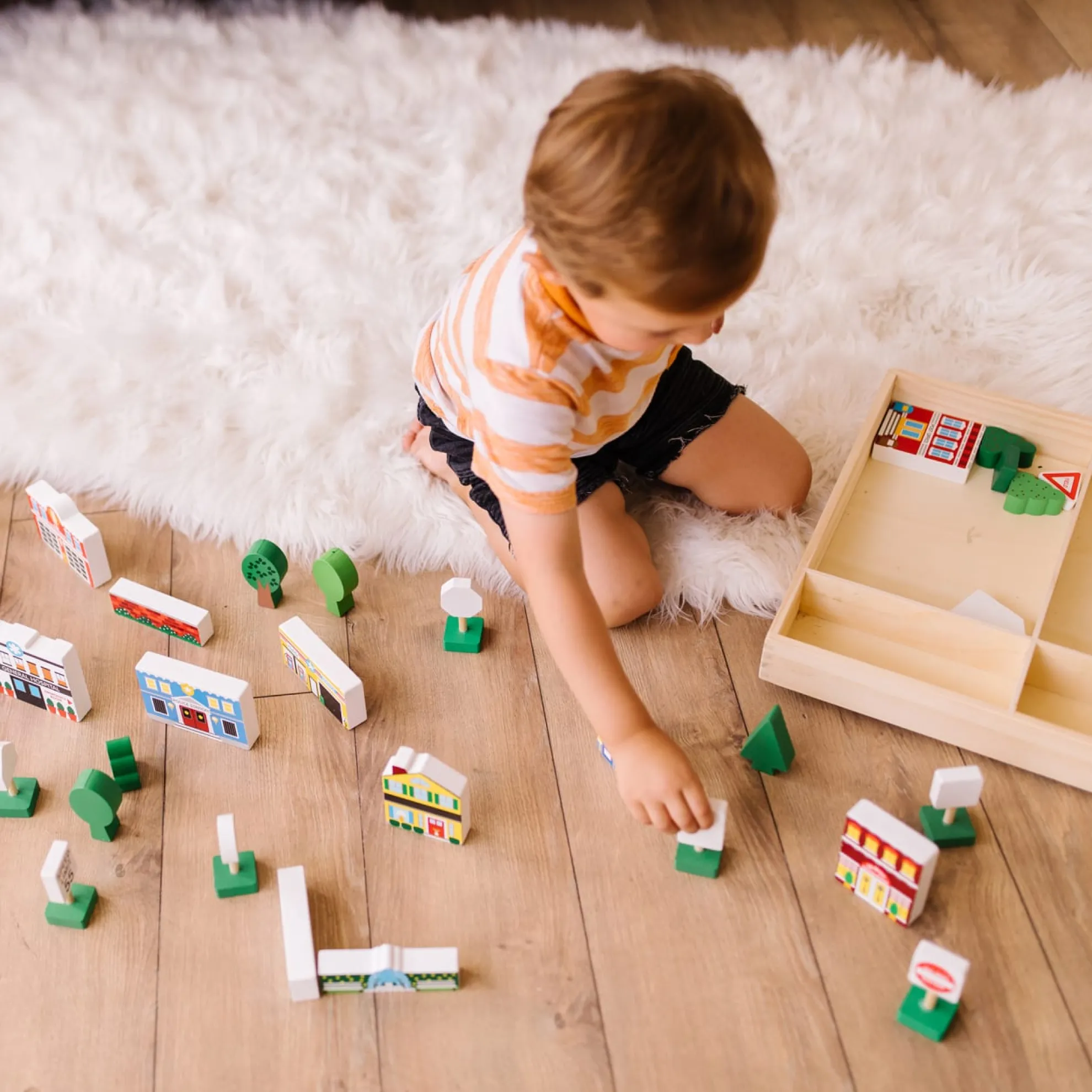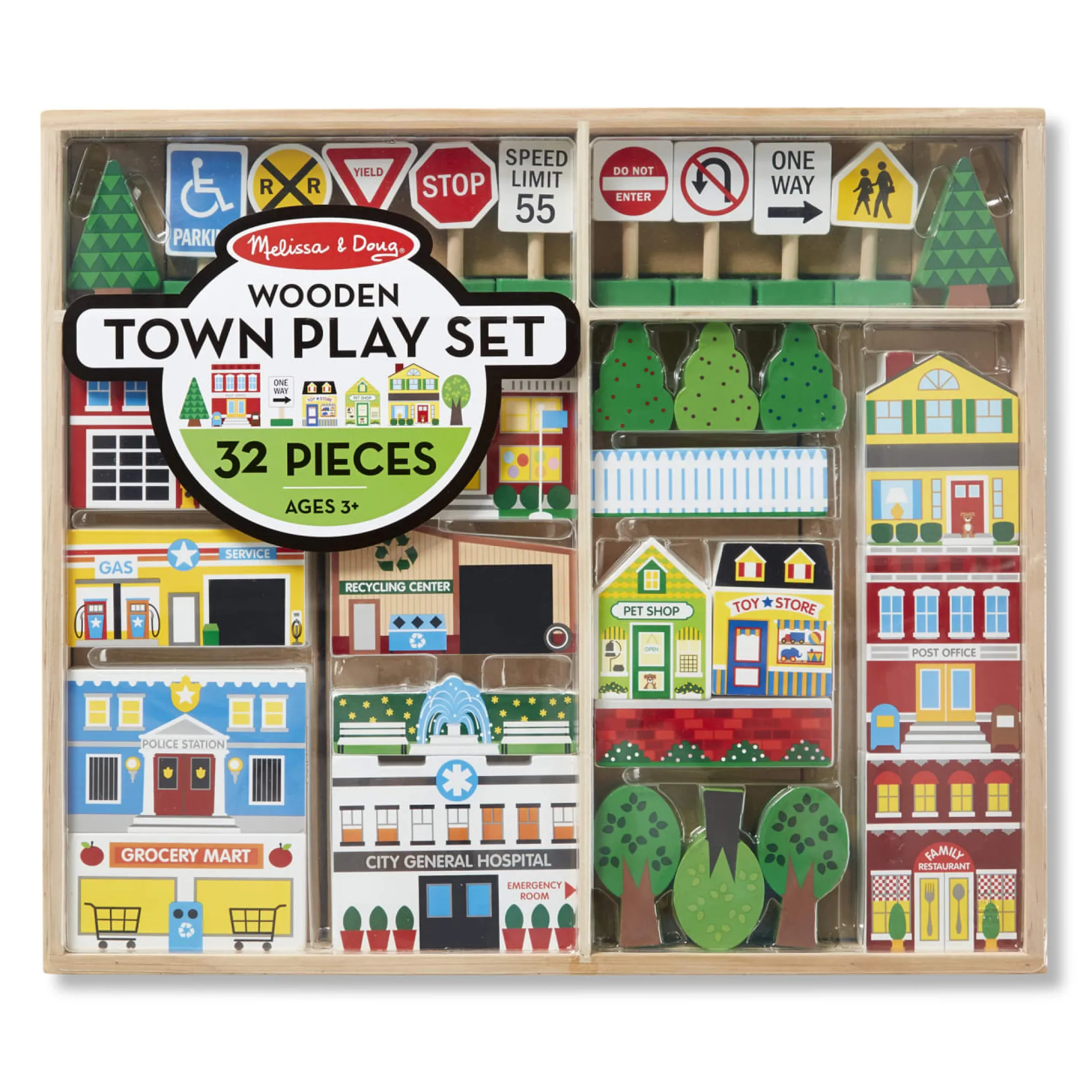 Build a world filled with imagination, block by block! This wooden 32-piece play set includes everything needed to create a miniature streetscape–12 buildings (including fire and police stations, a recycling center, service station, house, and more), nine street signs (Stop, One Way, Speed Limit, Yield, etc.), trees, fences, and walls. The brightly colored shaped solid wood pieces stand approximately one to three inches high. Flat sides, attention to detail, and bright colors make this set great for stacking, sorting, counting, setting up, and knocking down. Designed to play perfectly with Melissa & Doug activity rugs, kids three and older will also have endless fun and playing with the set independently or combining it with other play pieces, toy cars, and figures. Pieces store neatly in a divided wooden tray.