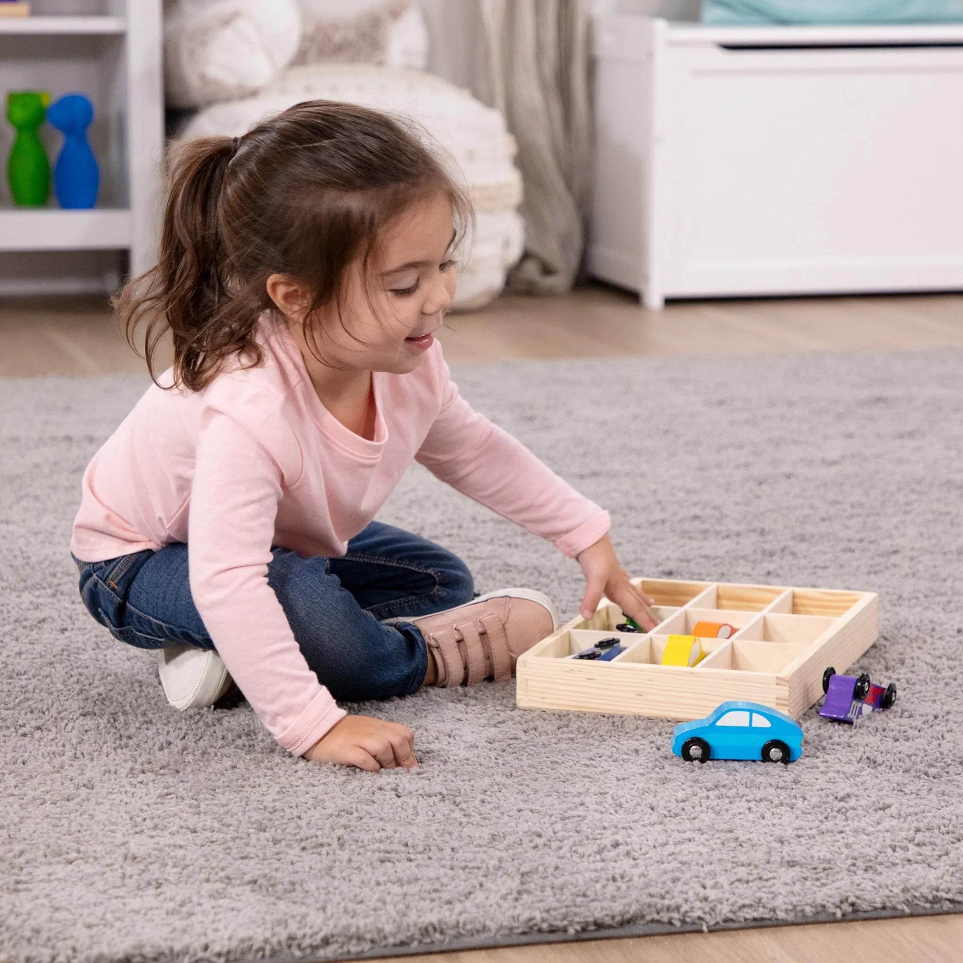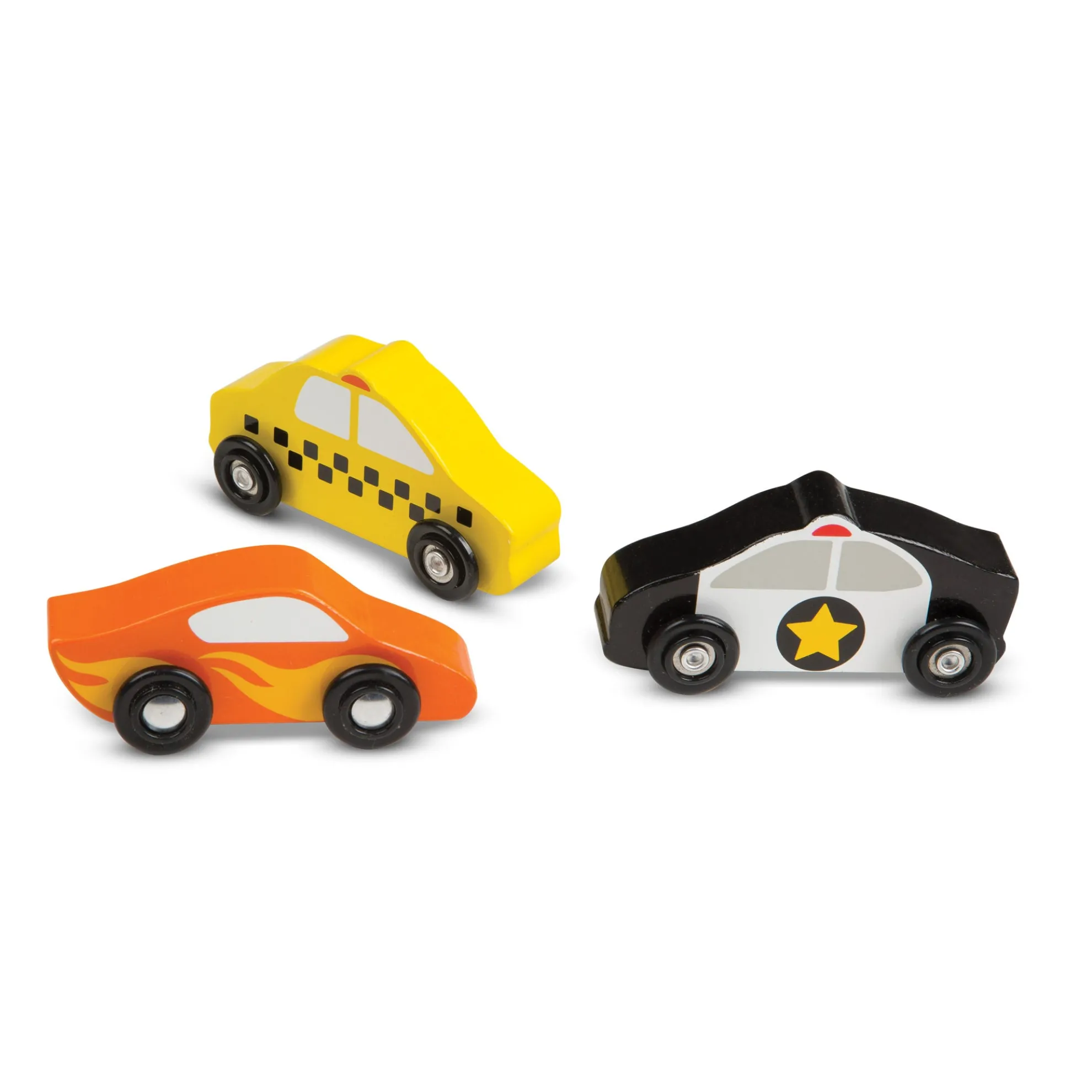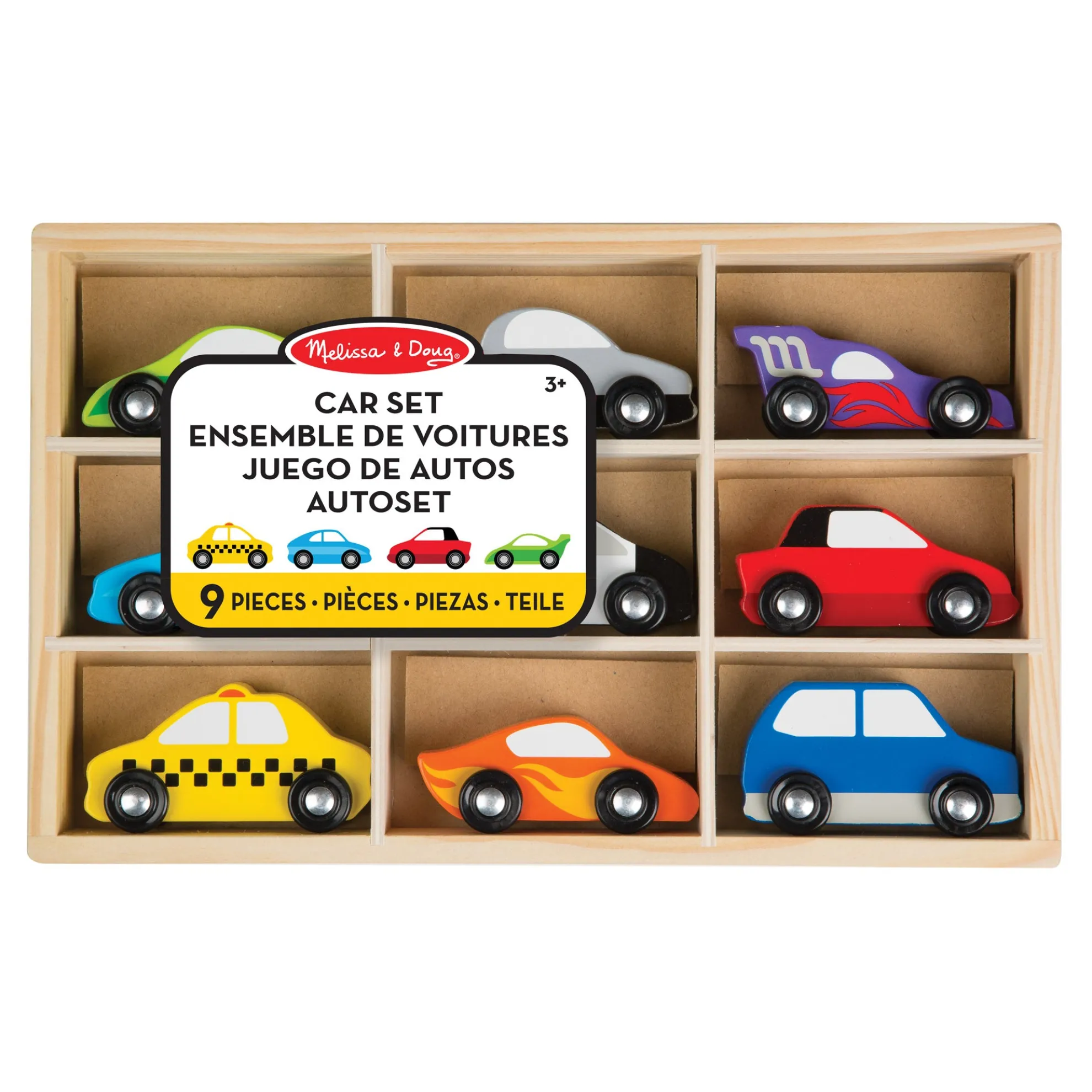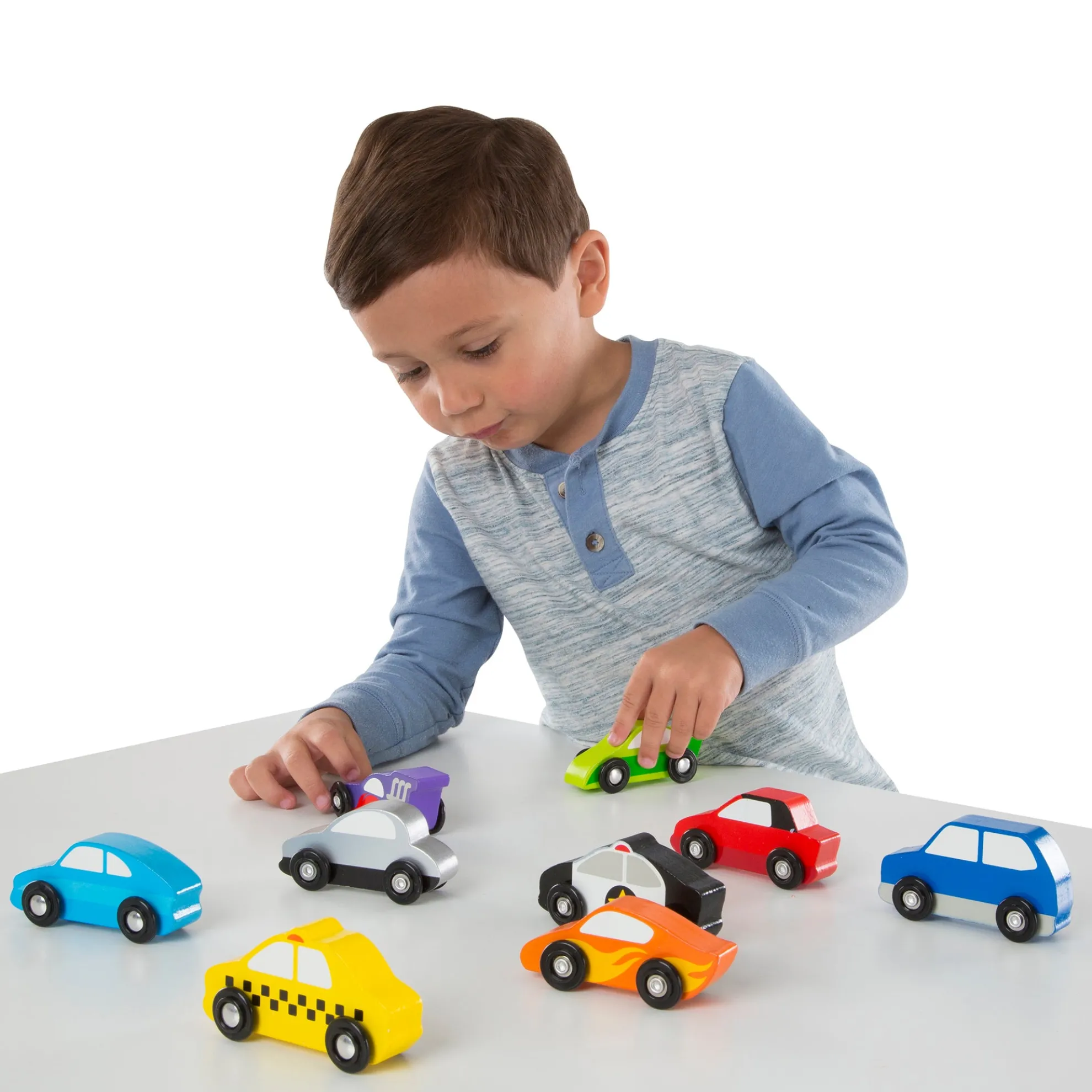 Race to the rescue, around the track, or all over town with these sturdy wooden cars! The nine-piece set includes cars, racecars, mini-van, police car, and taxi, each approximately four inches long. All are brightly colored, easy to identify, and fun for kids three and older to grasp and maneuver. Designed to play perfectly with Melissa & Doug Activity Rugs, the vehicles store conveniently or can be displayed in the compartmentalized wooden tray.