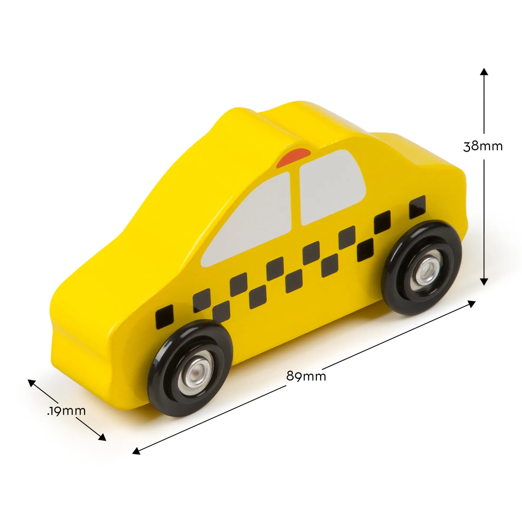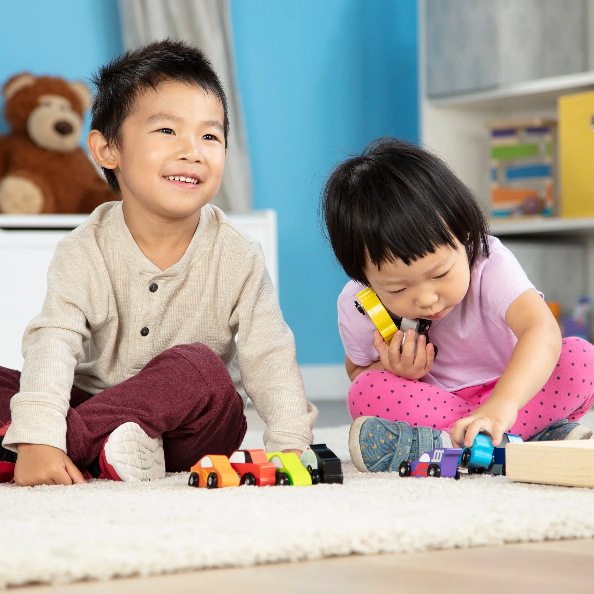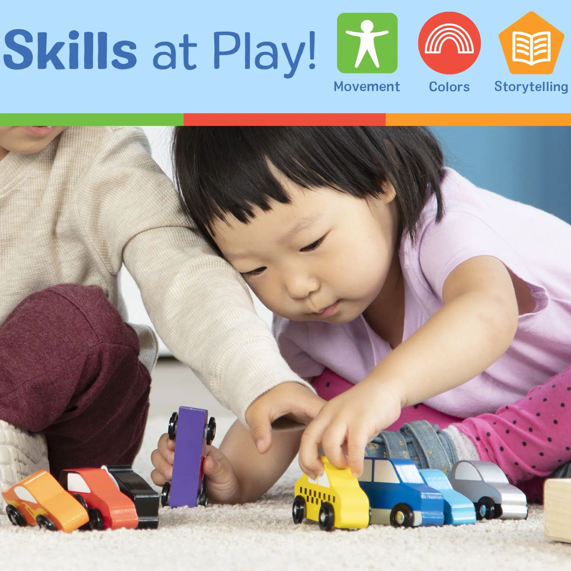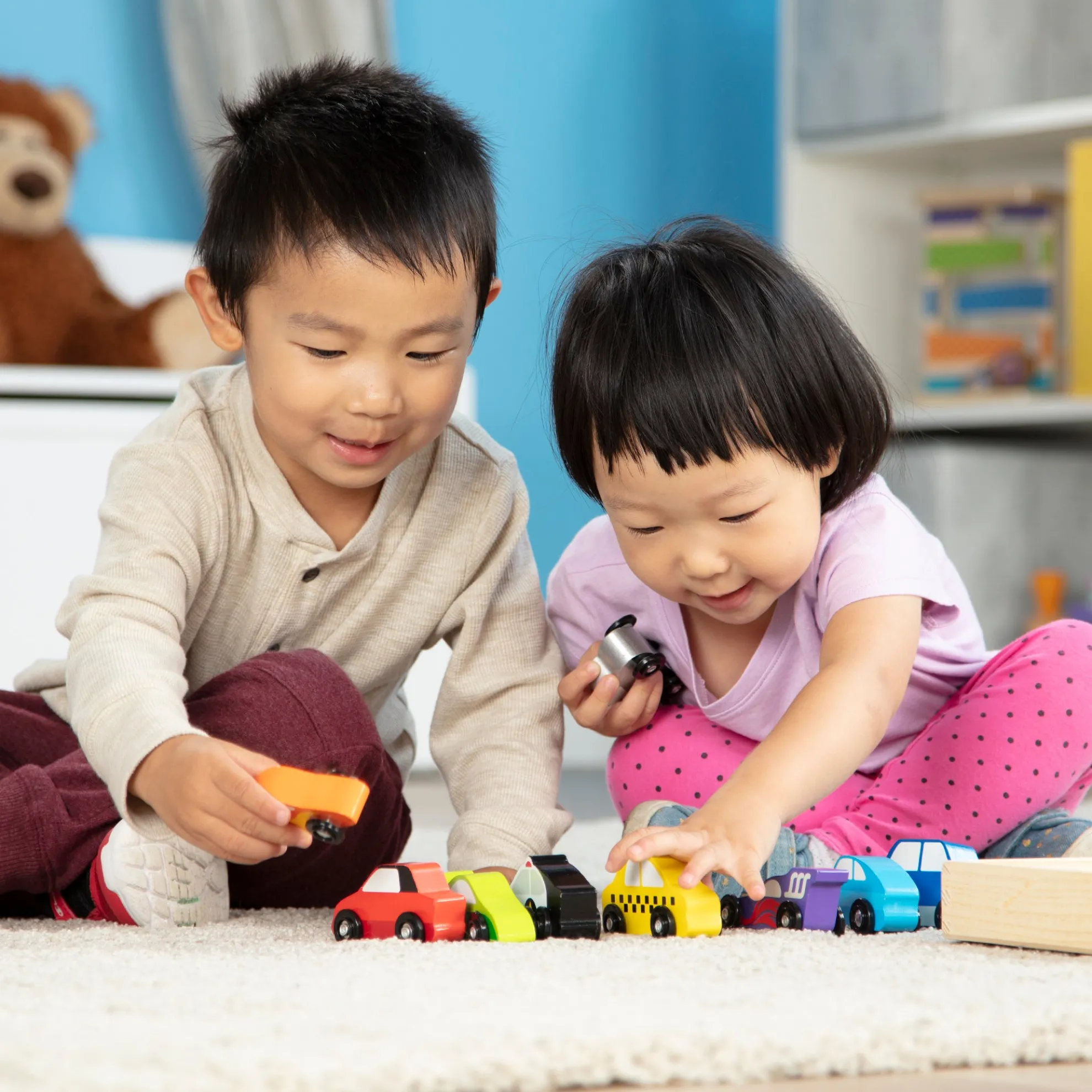 Race to the rescue, around the track, or all over town with these sturdy wooden cars! The nine-piece set includes cars, racecars, mini-van, police car, and taxi, each approximately four inches long. All are brightly colored, easy to identify, and fun for kids three and older to grasp and maneuver. Designed to play perfectly with Melissa & Doug Activity Rugs, the vehicles store conveniently or can be displayed in the compartmentalized wooden tray.