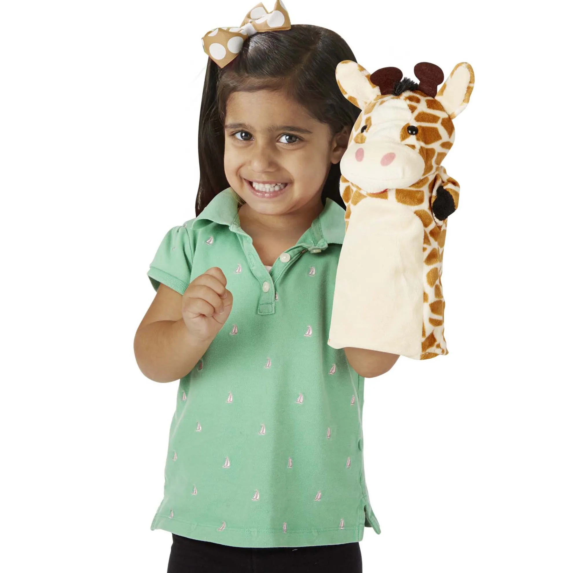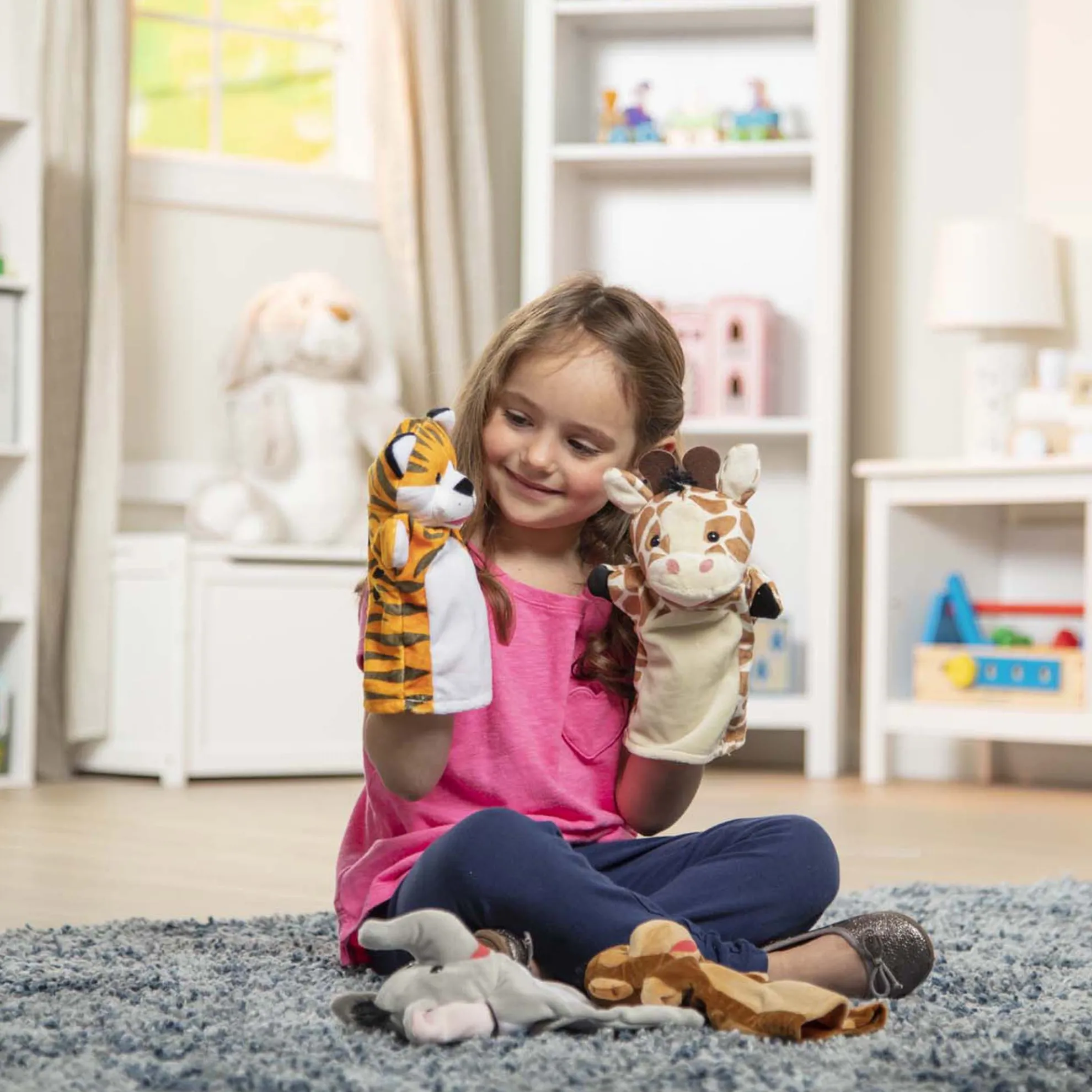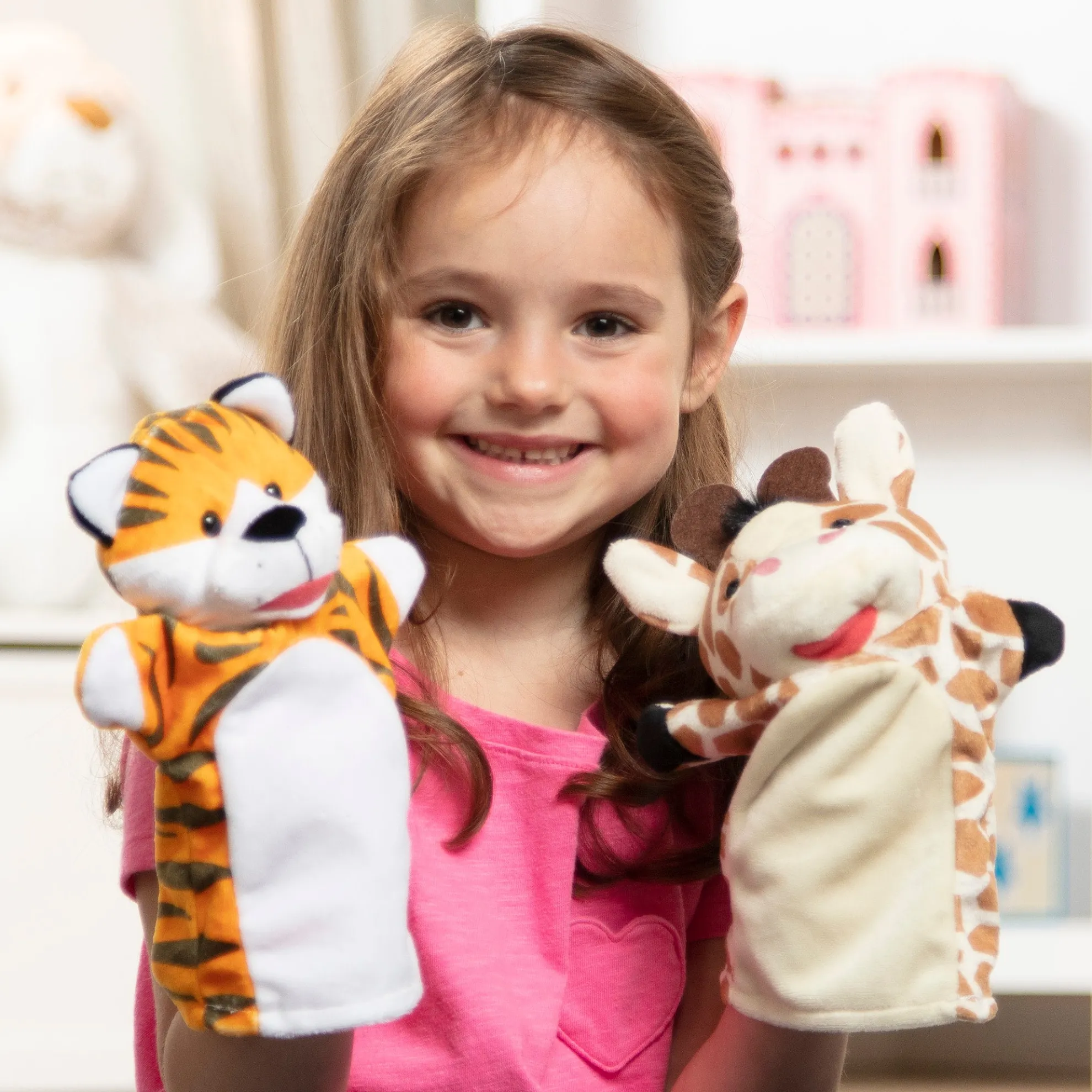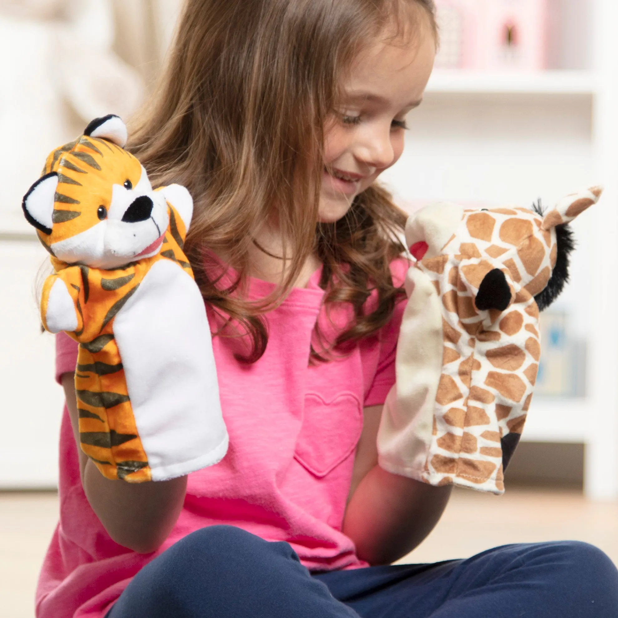 - Four soft hand-puppets in a wild-animal theme to spark imaginative play